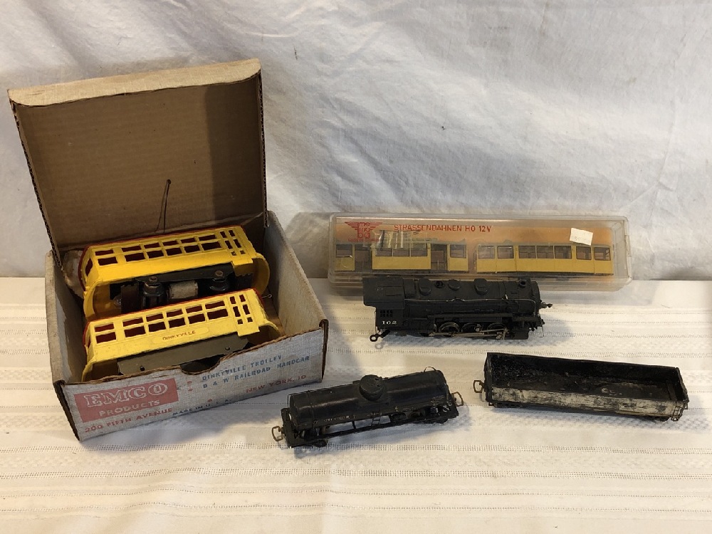 Vtg. Train Cars/Trolleys - Emco Dinkyville Trolley Handcar, Strassenbahnen HO 12V, no. 102 Rivarossi and more