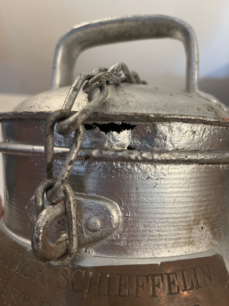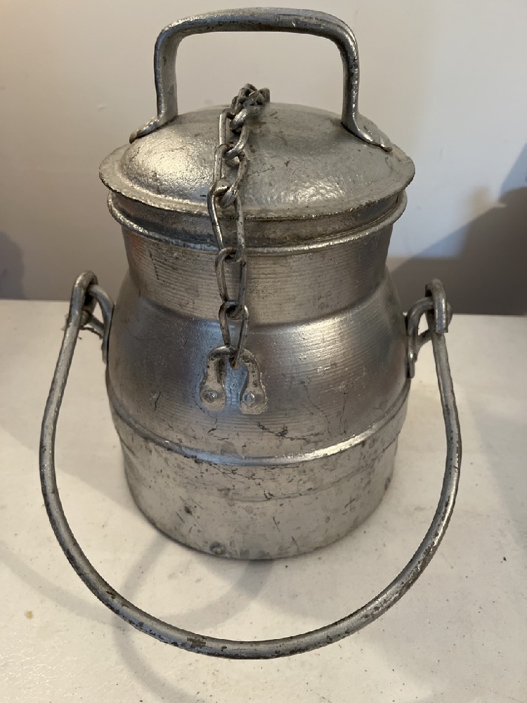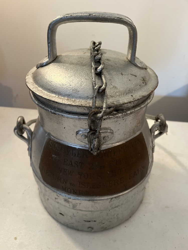 Antique Cream Can With Inscription- Islesmere Farm Monroe, NY- 12” T x 7.5” Round Bottom