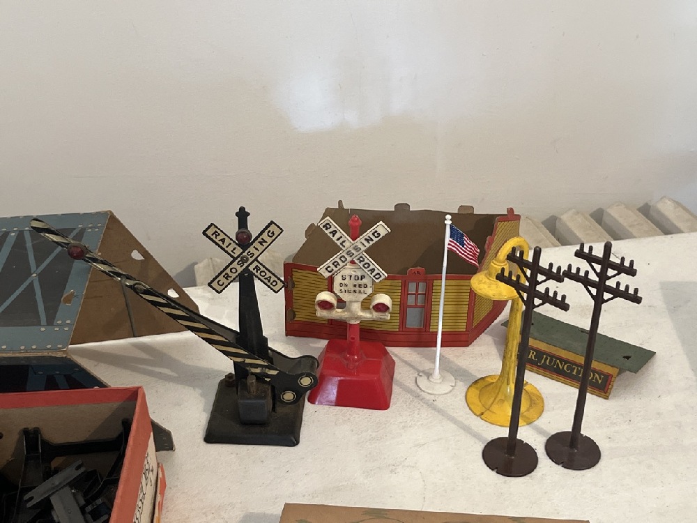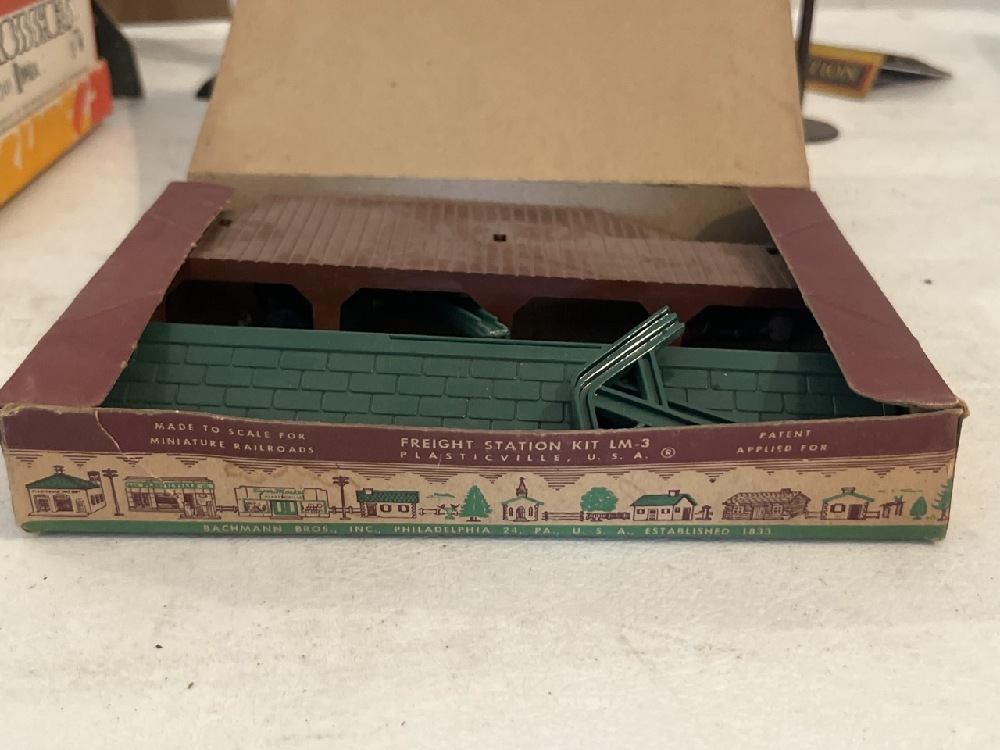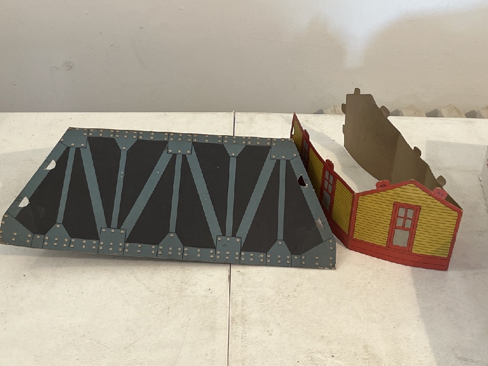 Vtg. Train Accessories - Plasticville Freight station, Paper House & Bridge, trestle, and Signs