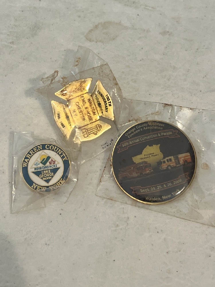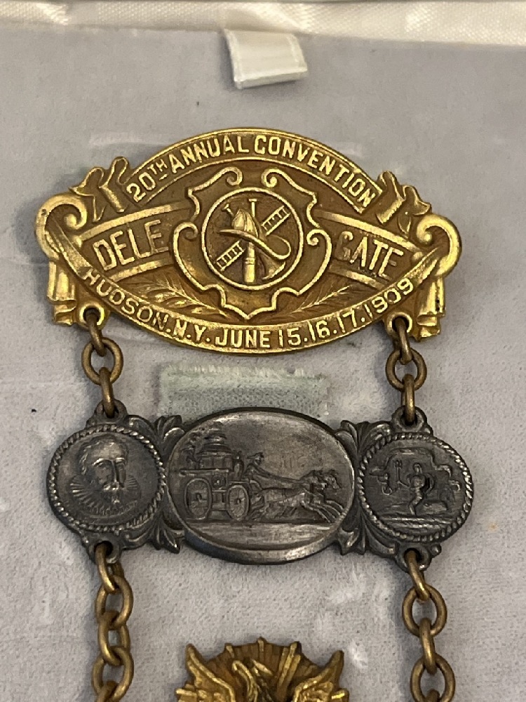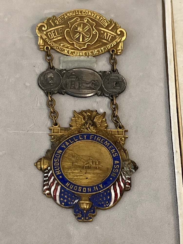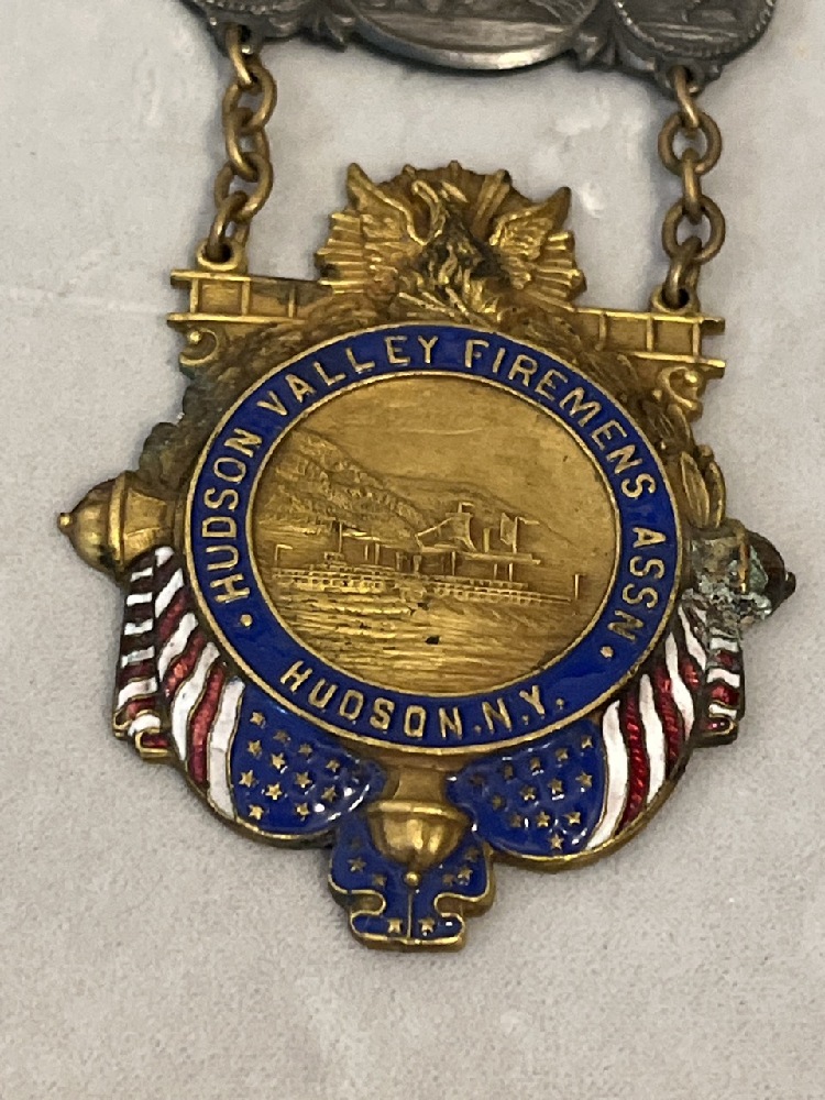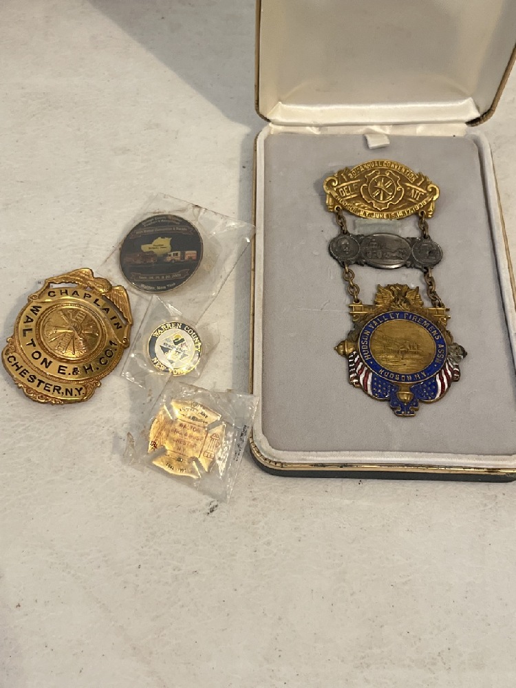 Vtg. Hudson NY Delegate Fireman’s Medal, Pins and Chaplain Walton E. & H. Co. Badge