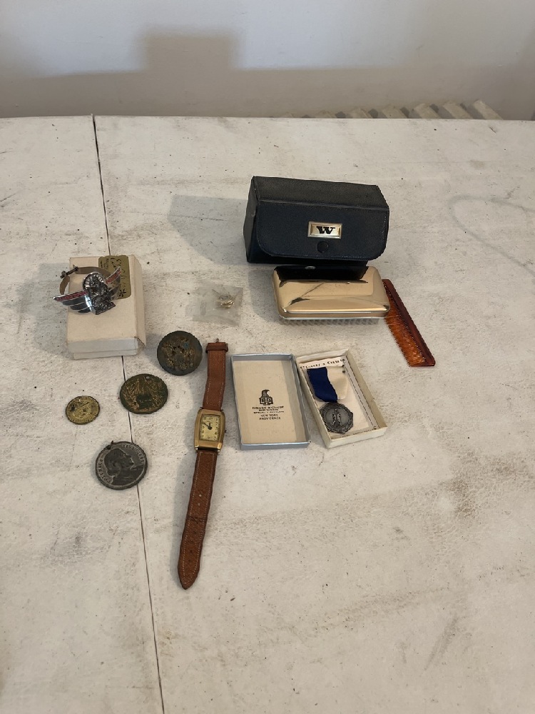 Misc Medals, New Haven Deco Watch, US Army Brass Cap Badge, Columbus Medal, Grooming Set