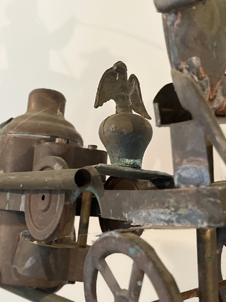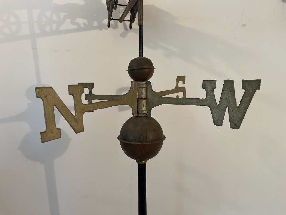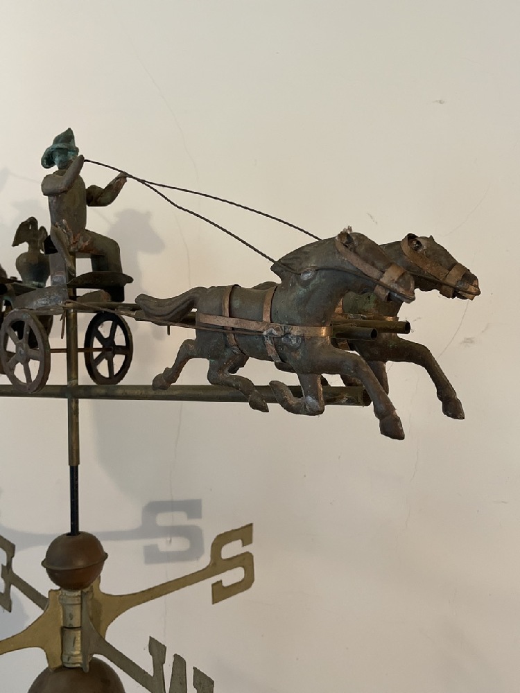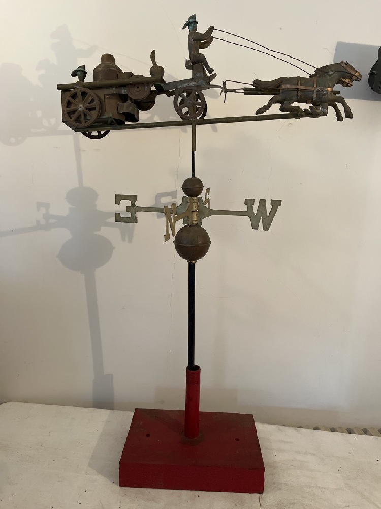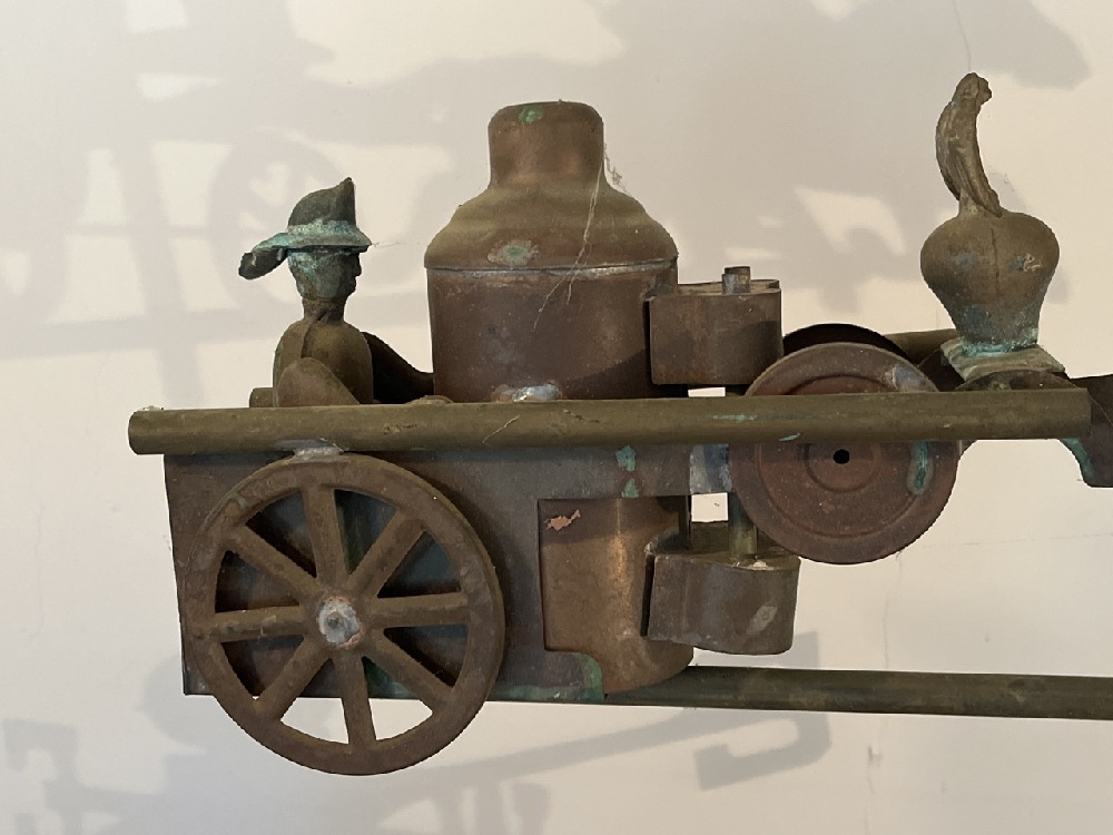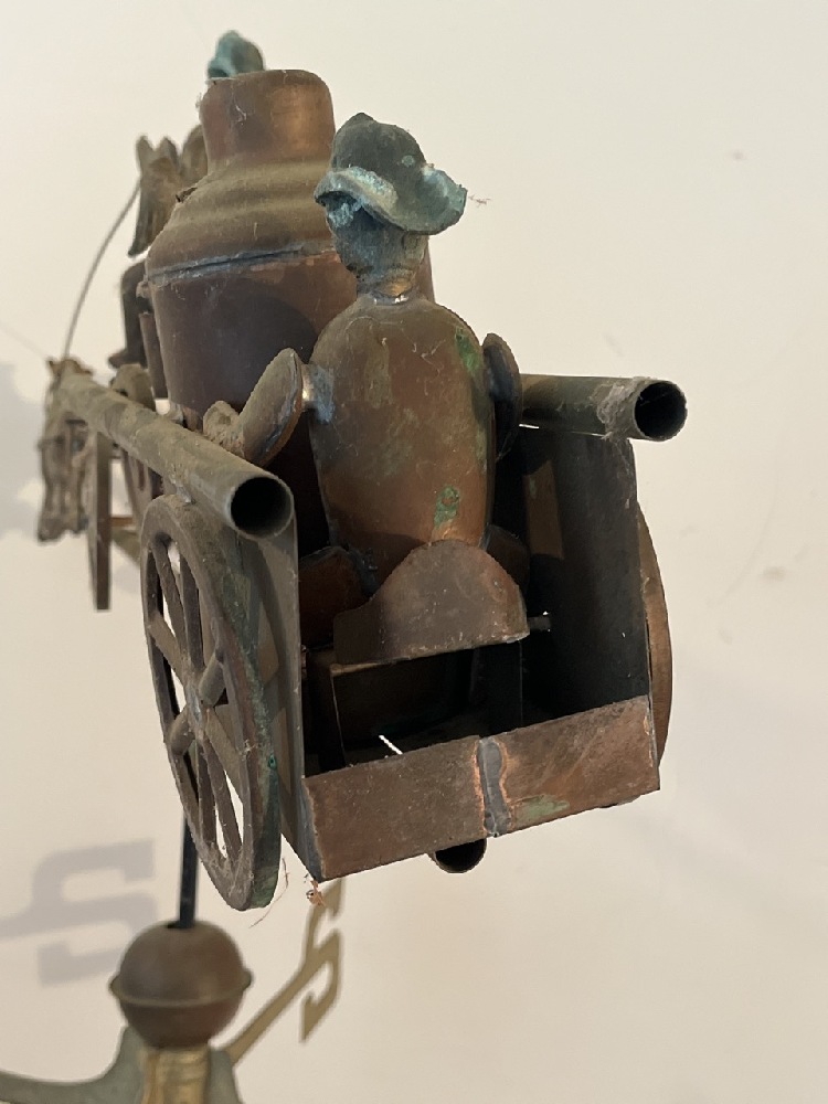 Vtg Horse Drawn Copper Firetruck Weathervane with Heavy Iron Stand- 48” T Total x 29” L x 18” W