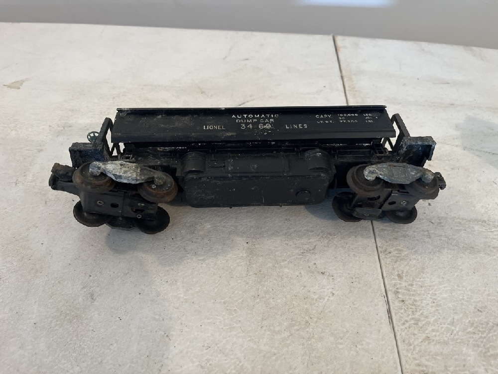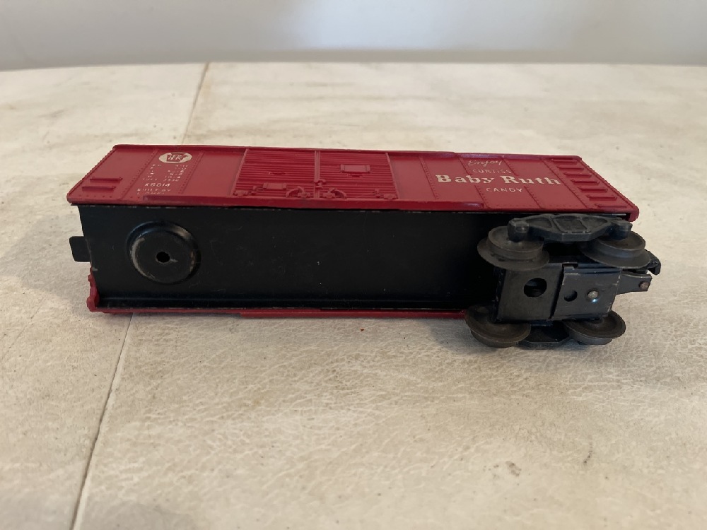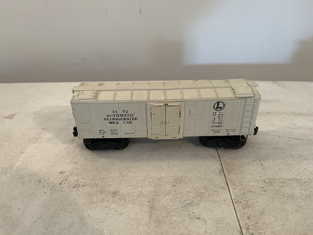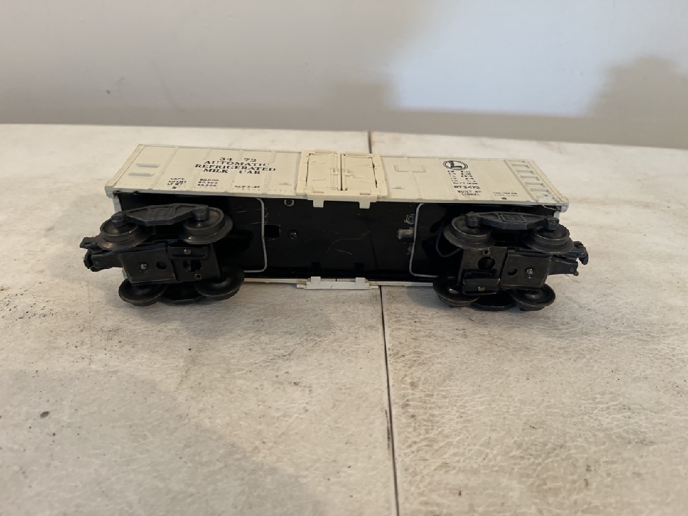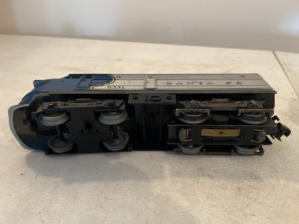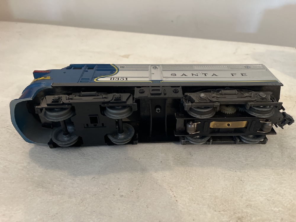 Vtg Lionel 8351 Santa Fe Train Set including 3472 Milk Car, 6014 Baby Ruth Car(. Missing set of Wheels), 6037 Caboose, & 3460 Dump Car