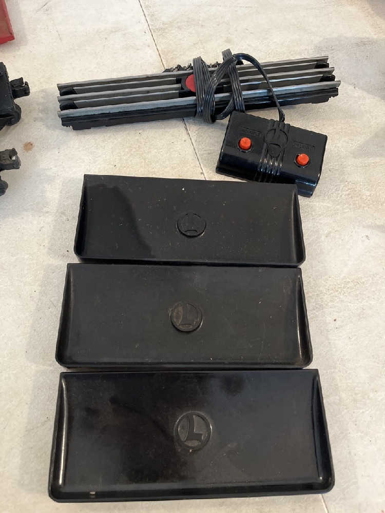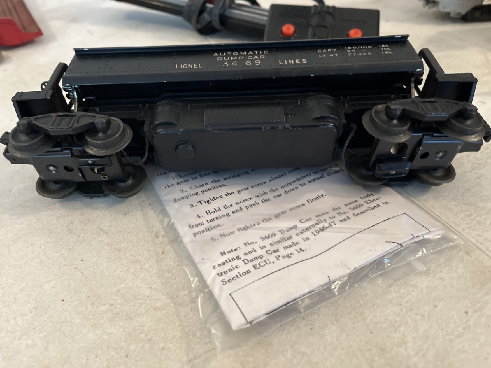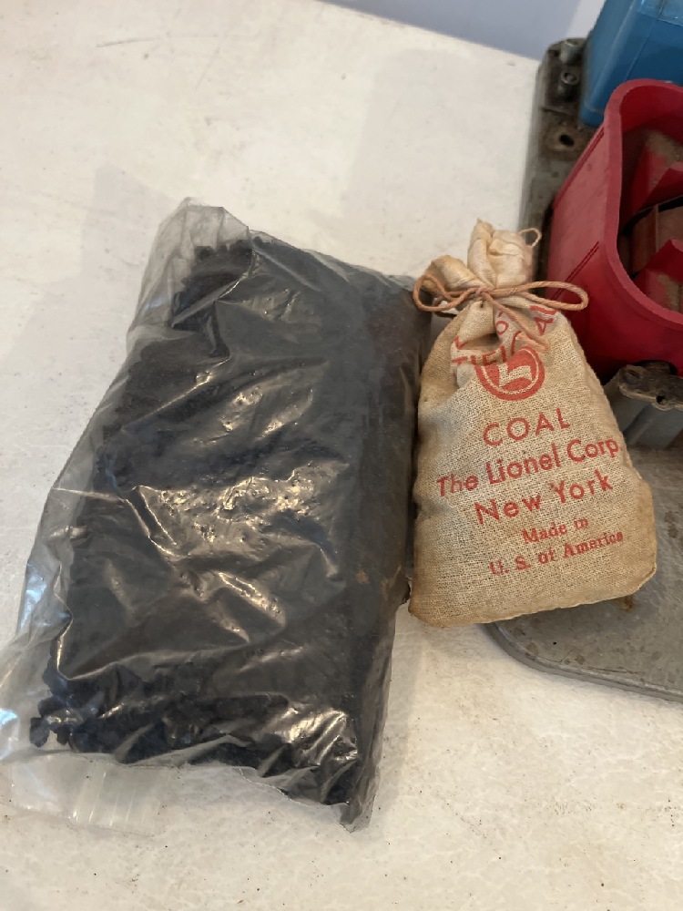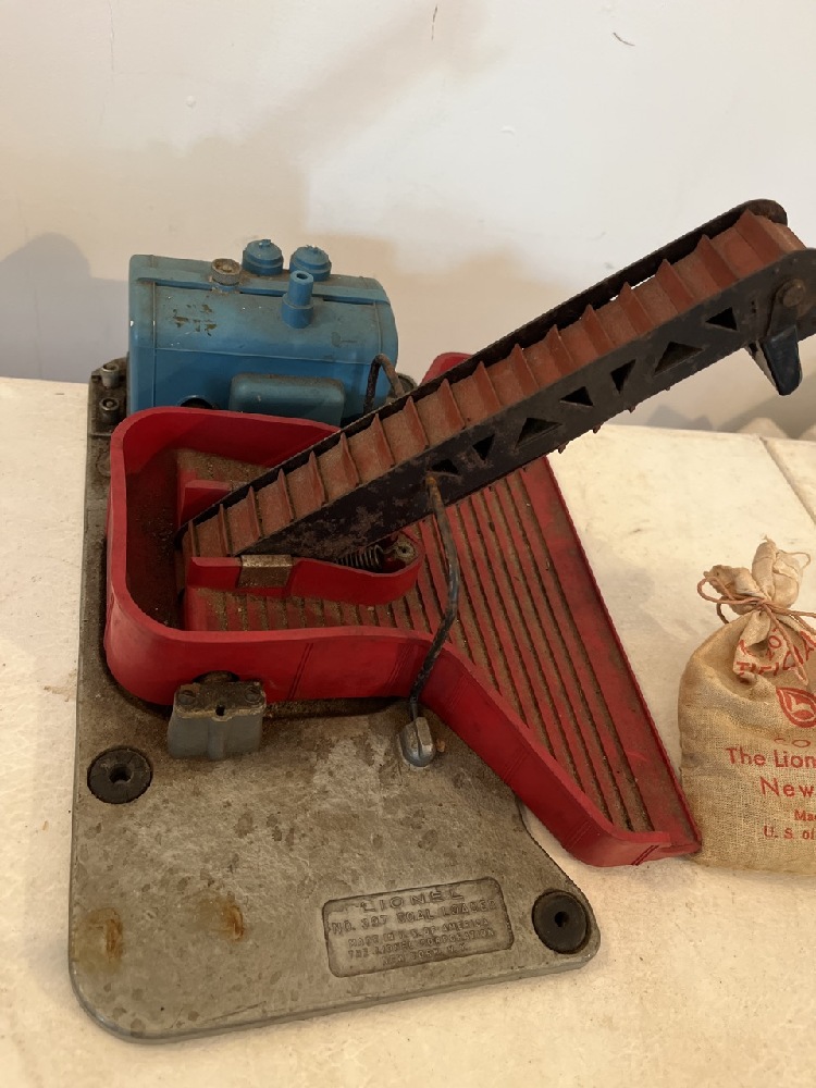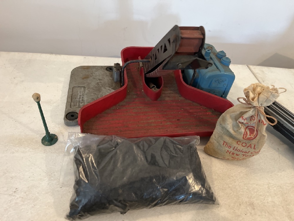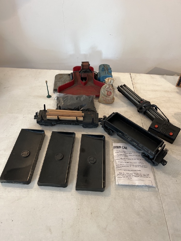 Vtg Lionel Cars & Accessories including 3469 Dump Car, 3461 Log Dump Car, 397 Operating Coal Loader, Switch & 3- Coal Trays