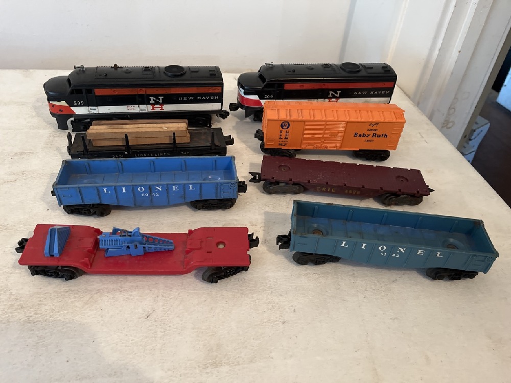 Vtg Lionel 209 New Haven Train Set & Cars including x-6034 Baby Ruth, 3451 Log Car, 6042 Gondola, 3349 Turbo Missle Launching Flat Car, 6142 Gondola, 4528 Erie Flat Car