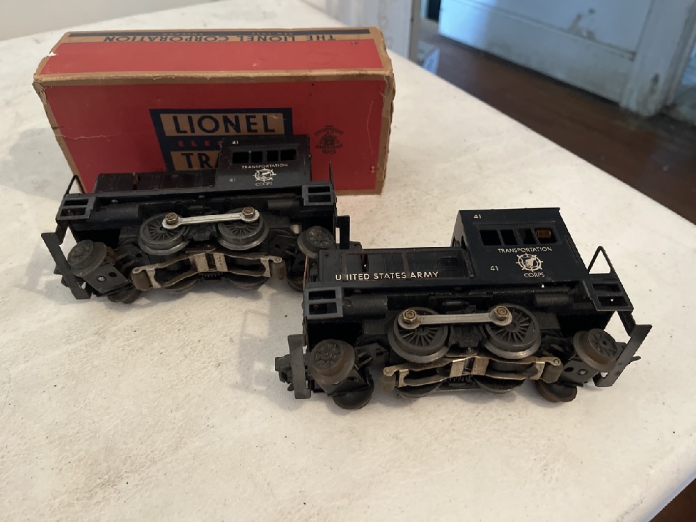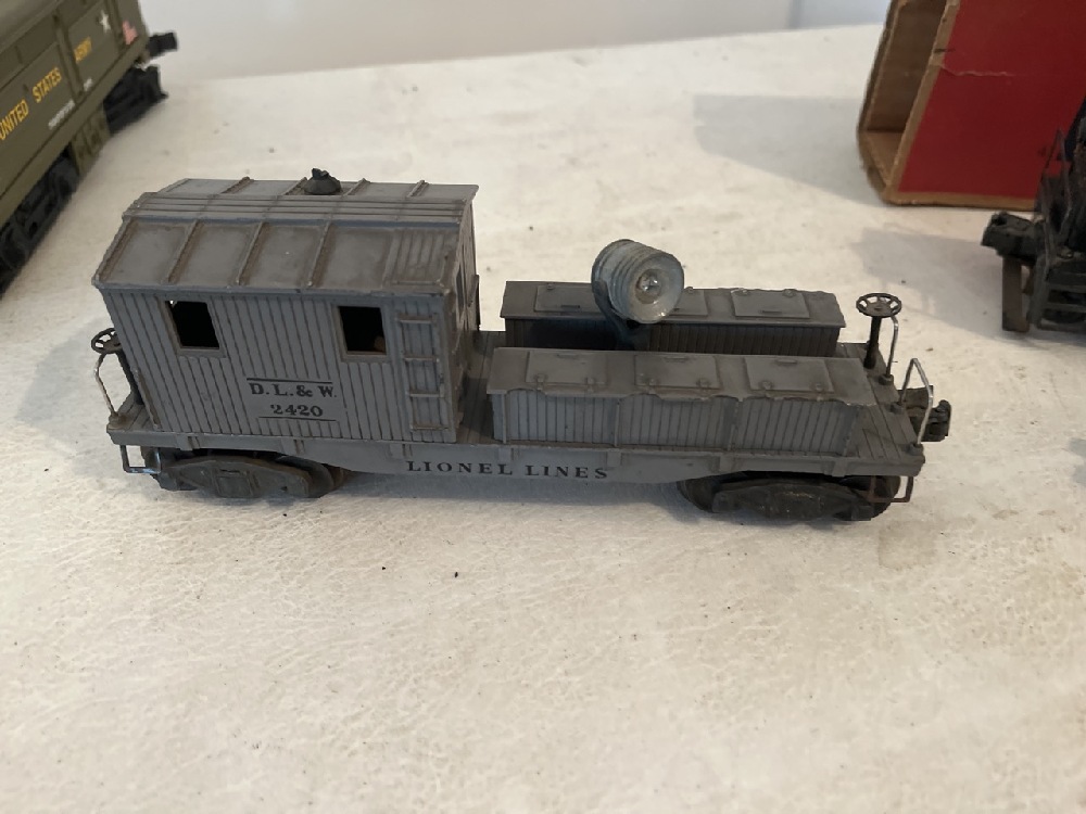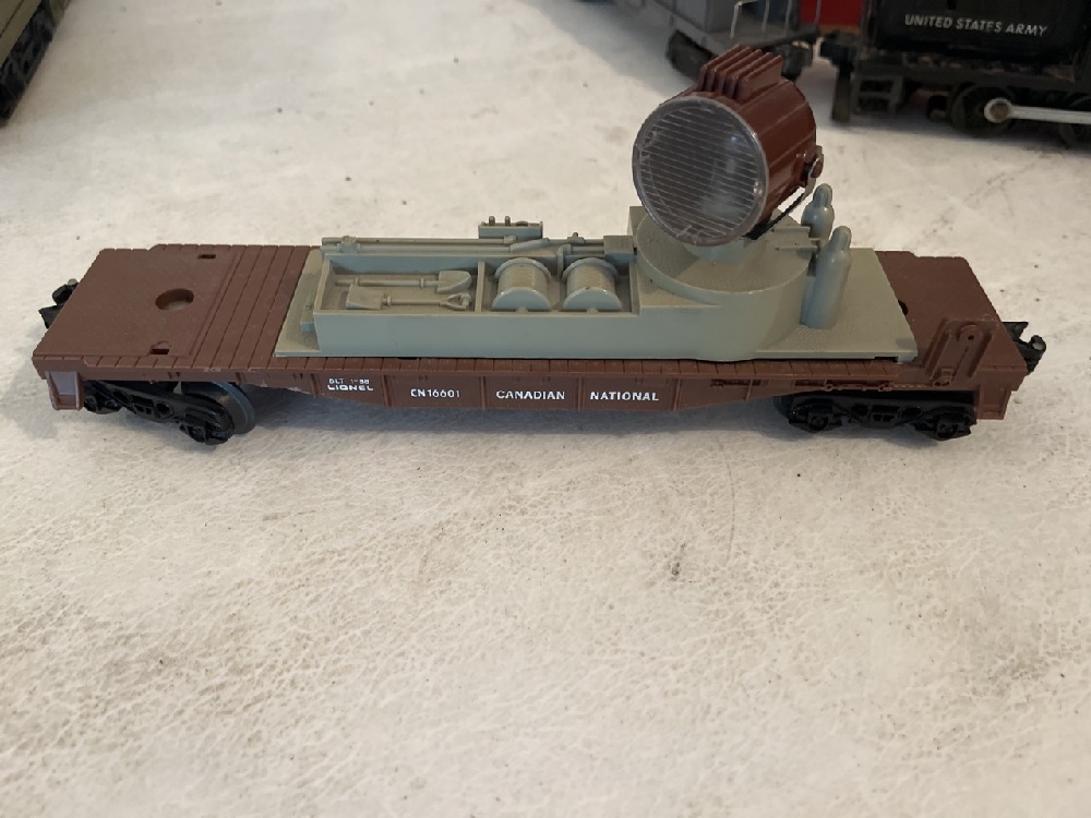 Vtg Lionel Trains including 0817 Army Locomotive, 2- No. 41 US Army Locomotives, 6511-2 Canada National Searchlight Car, 2420 D.L.& W Searchlight Caboose, 3470 Aerial Target Car
