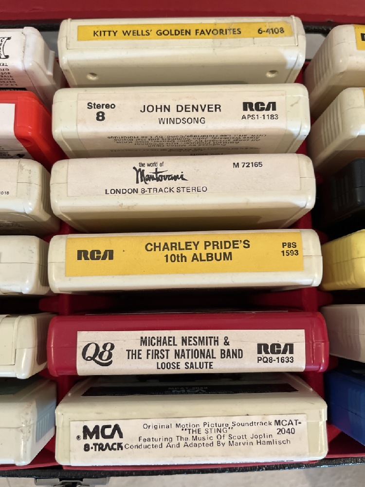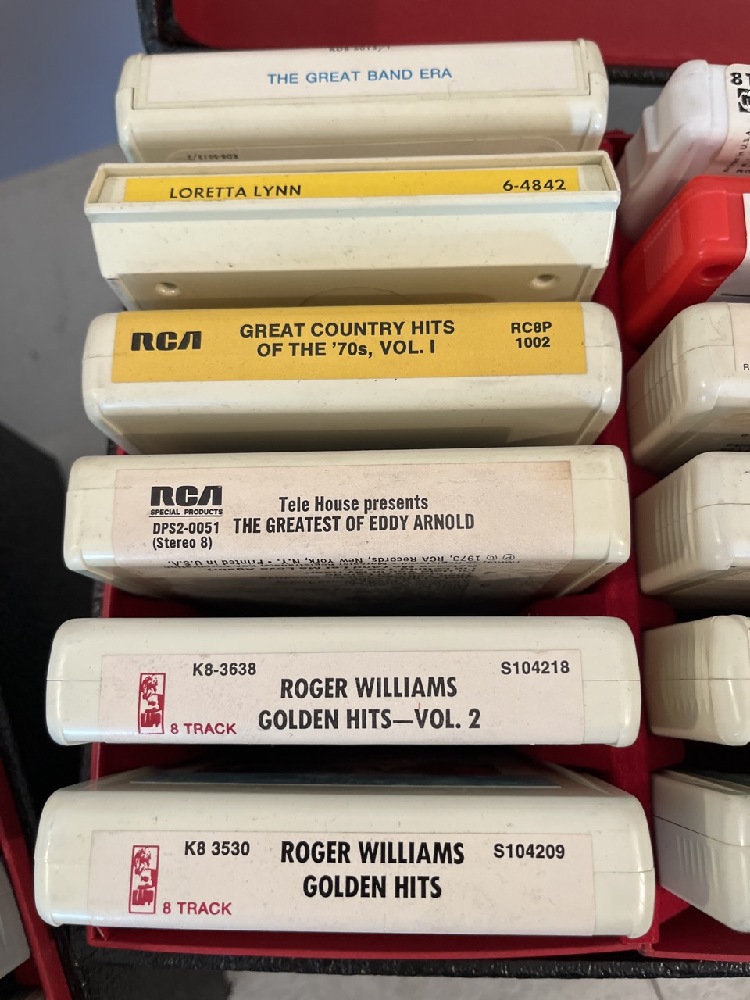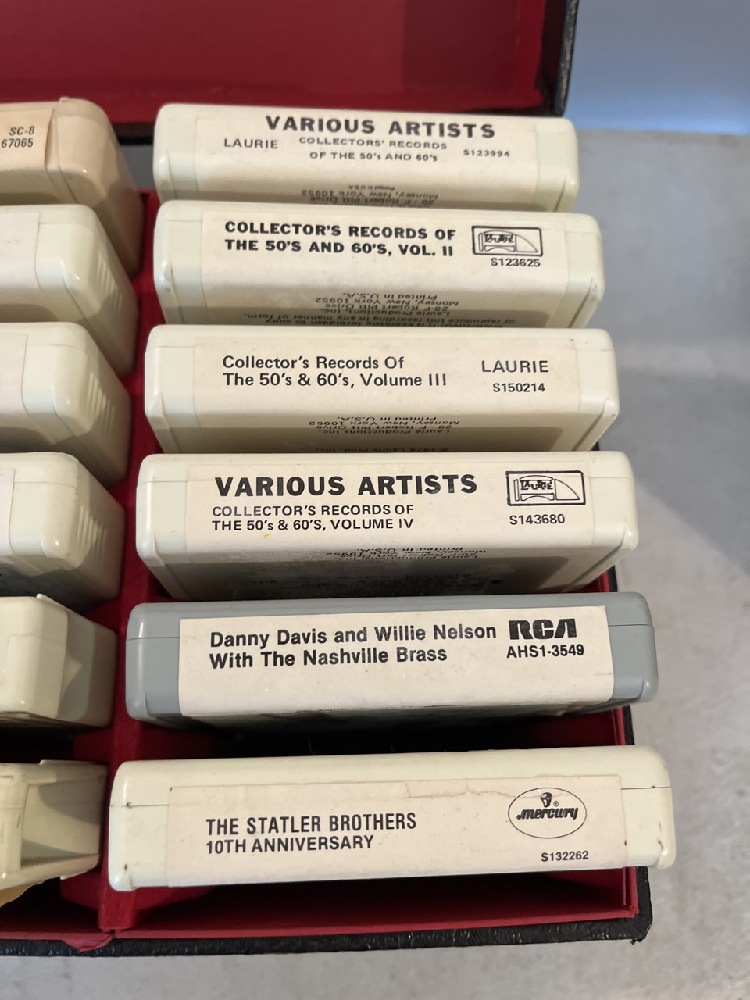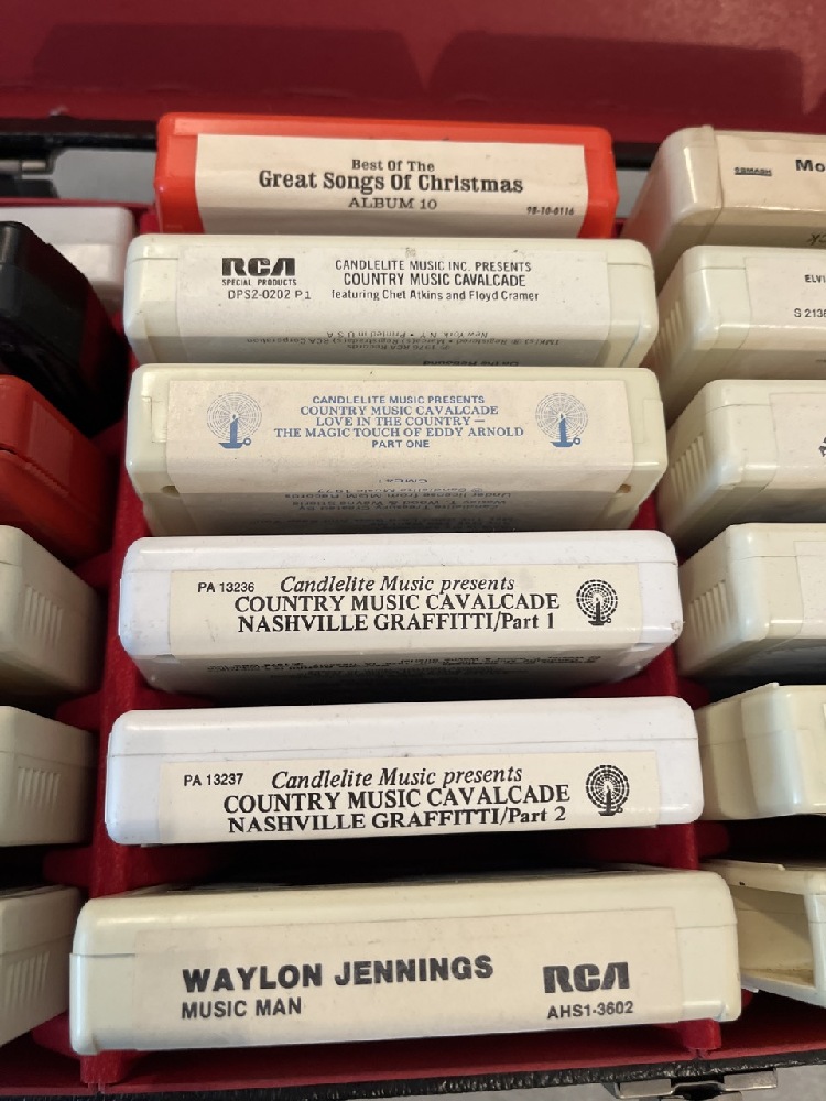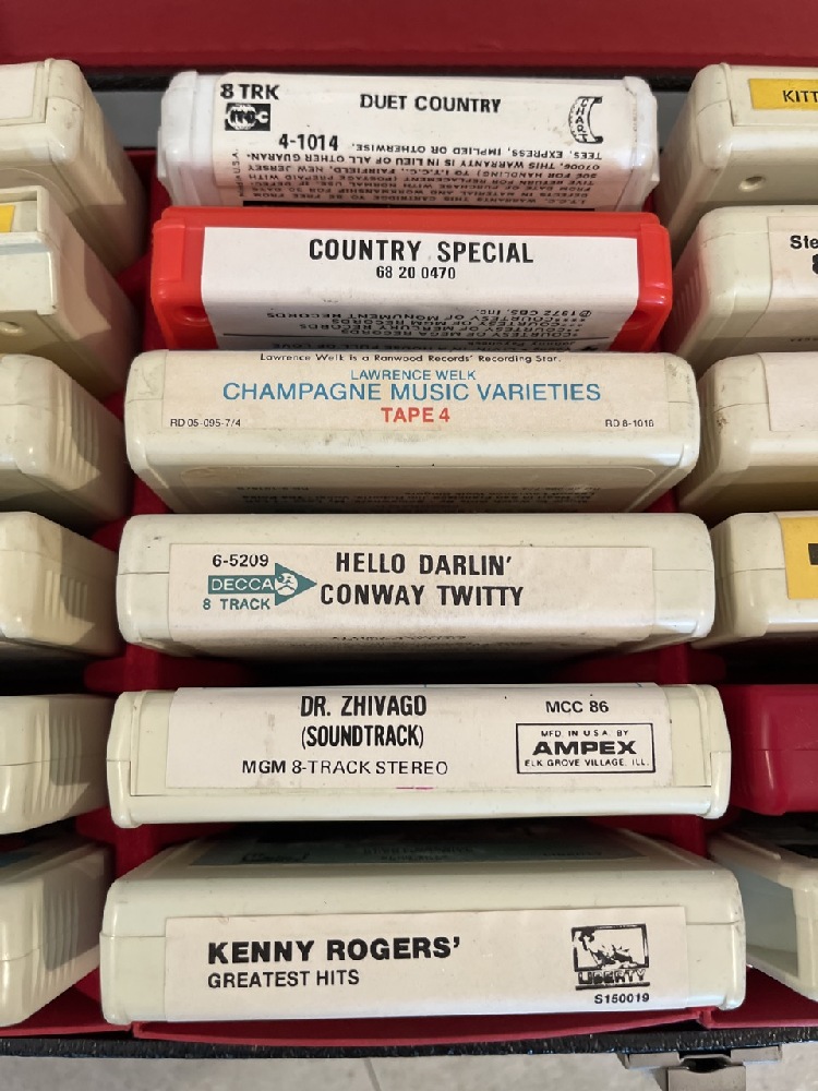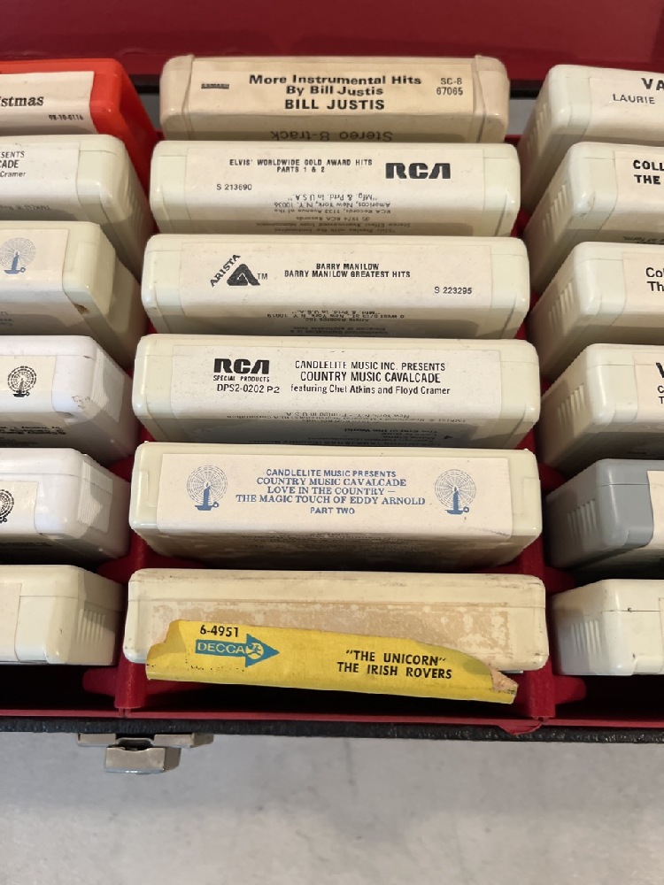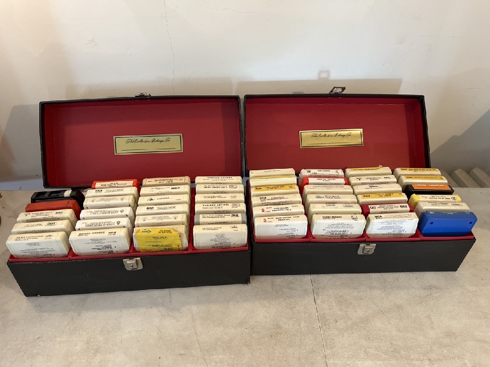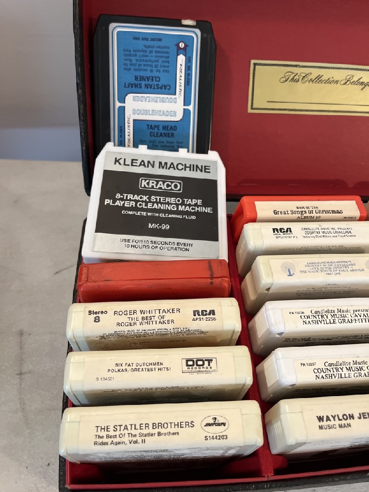 Collection of 8- Track Tapes in 2 Carry Cases- Dean Martin, Charley Pride, Kenny Roger’s, Barry Manilow, Elvis, Waylon Jennigs & More- 3- Head Cleaning Tapes