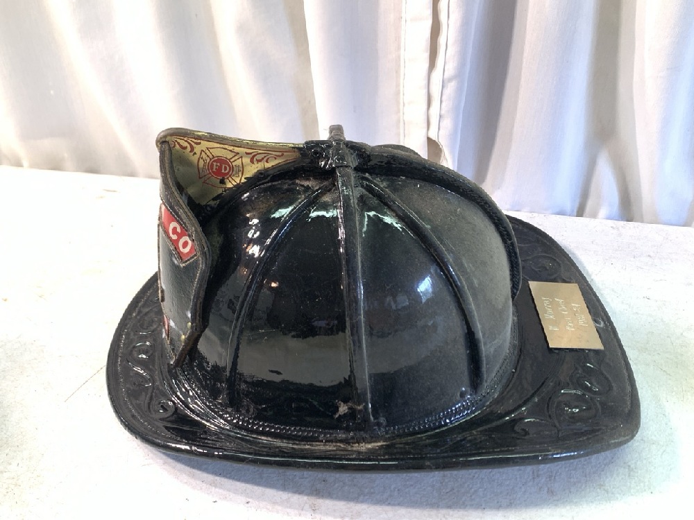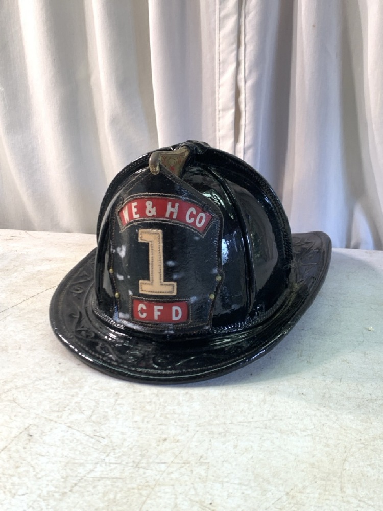 Vintage Cairns & Bros Clifton NJ Black Leather Firemans Helmet - W E & H Co. CFD (Chester Fire Department) - Brass Finials~ Plaque Inscribed W. Murray Past Chief 1981-84