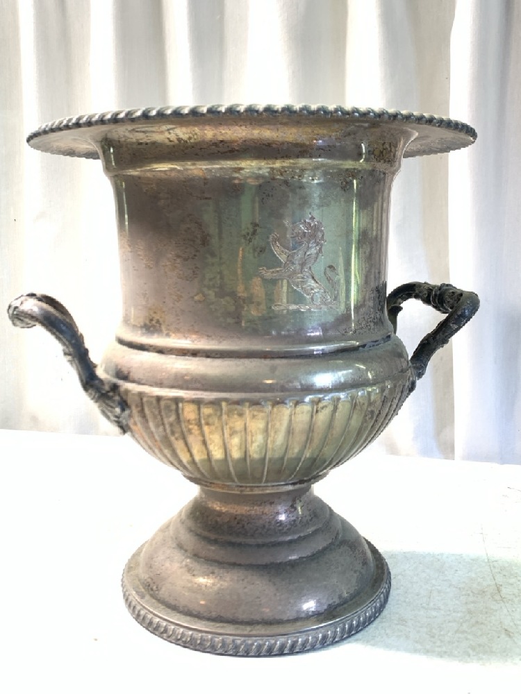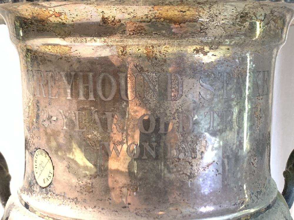 Vtg. Silverplate Trophy Urn - Stamped Makers Mark on Bottom- Inscribed “ Greyhound Stake 2 - Year Old Trot Won By” ~ 10” Tall