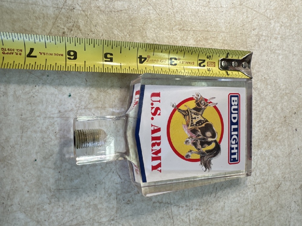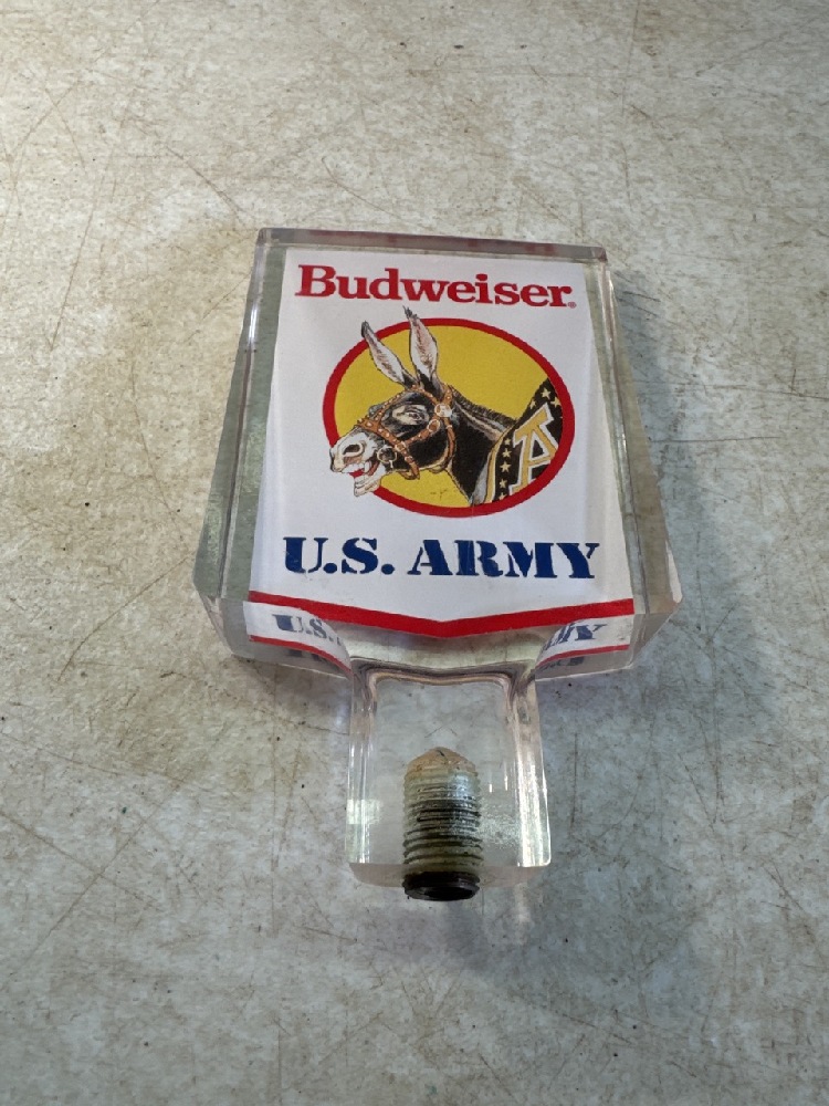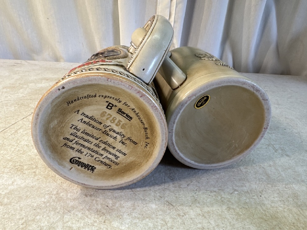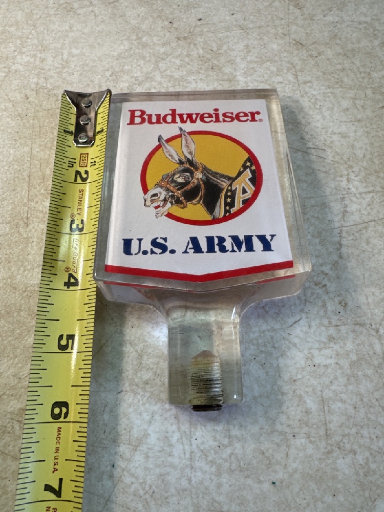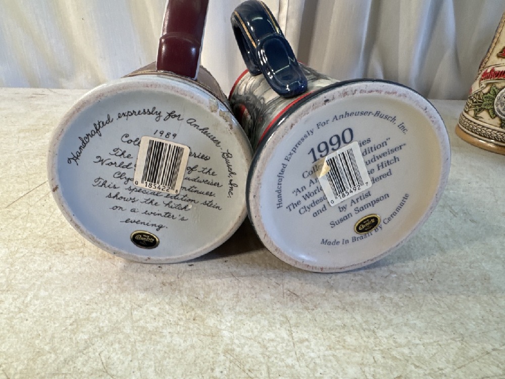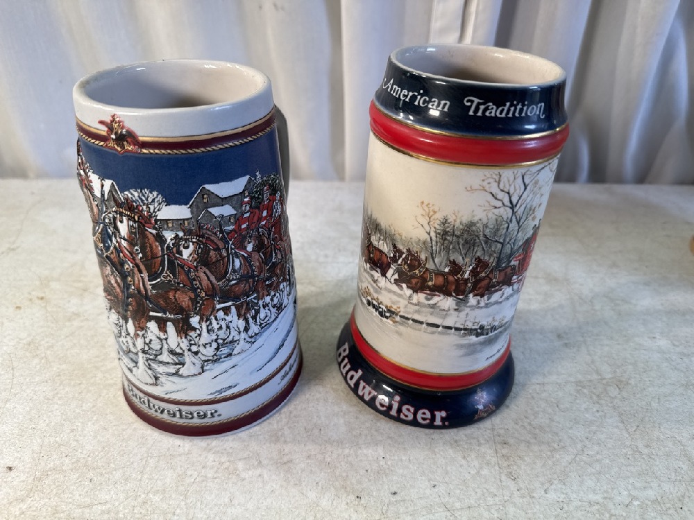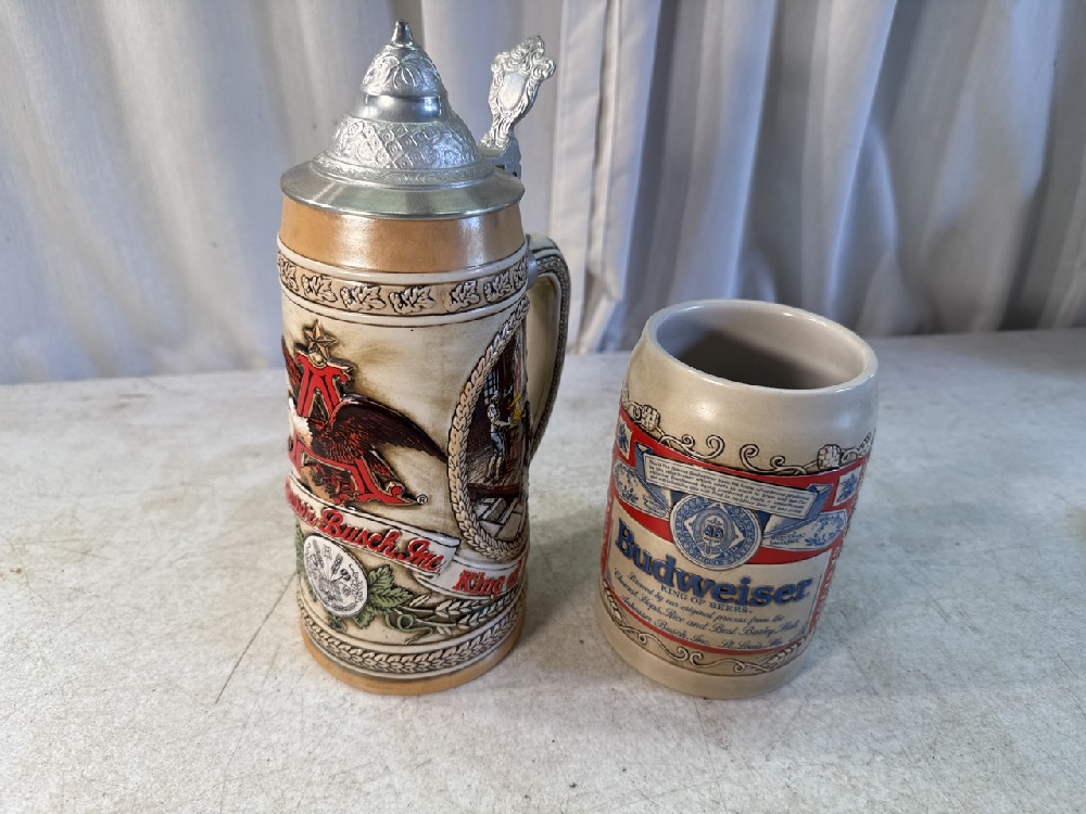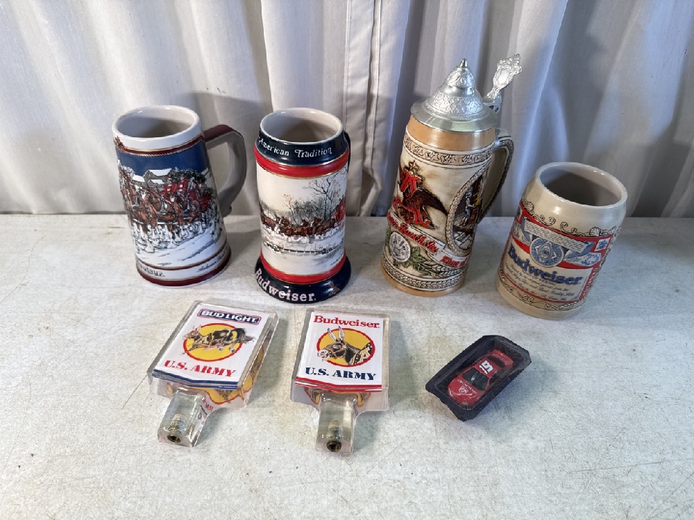Vtg Budweiser Collectables including 2- US Army Beer Tap Handles,4- Budweiser Steins, & Dodge National Training Center Die Cast Car