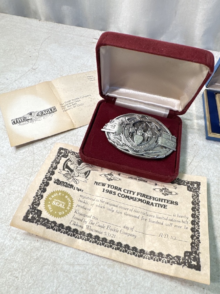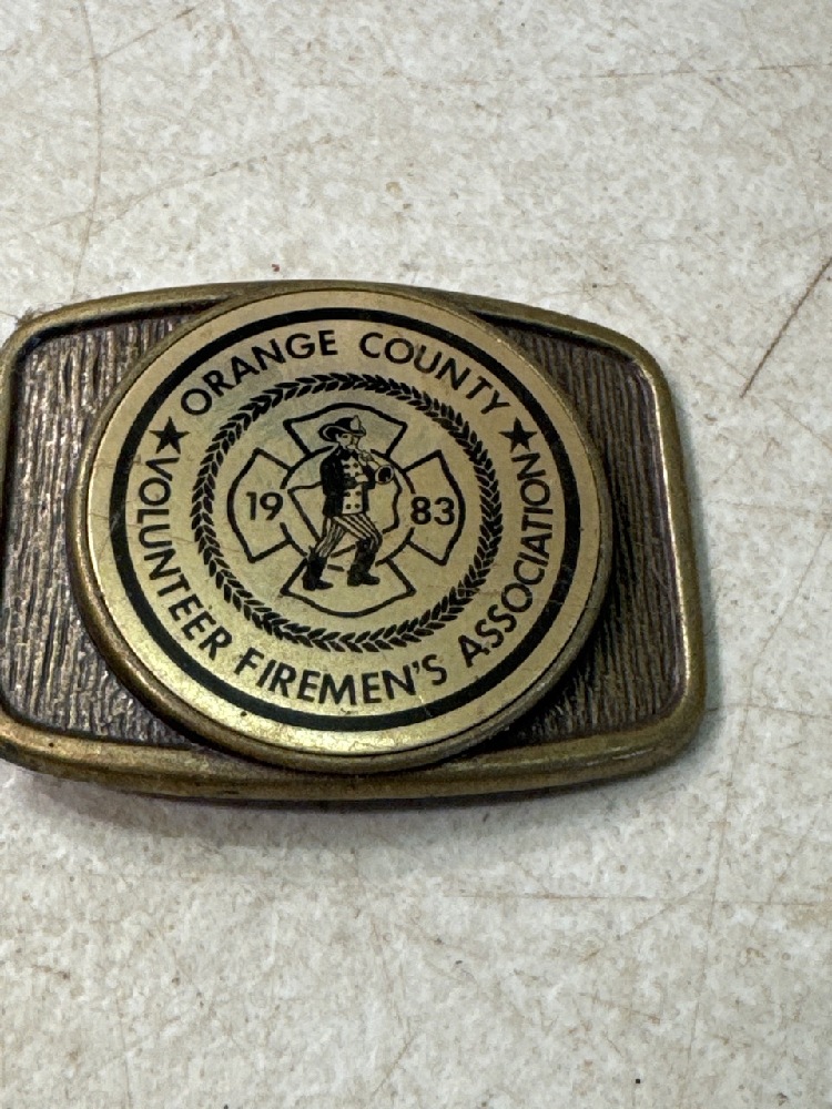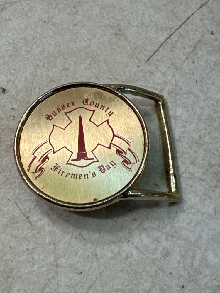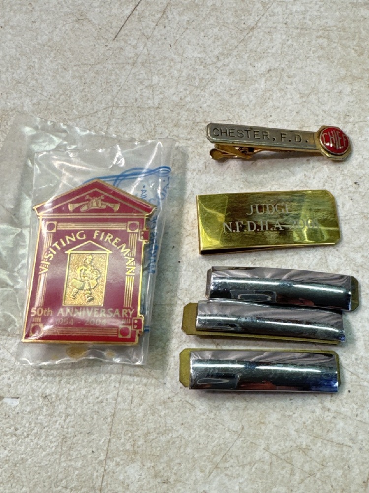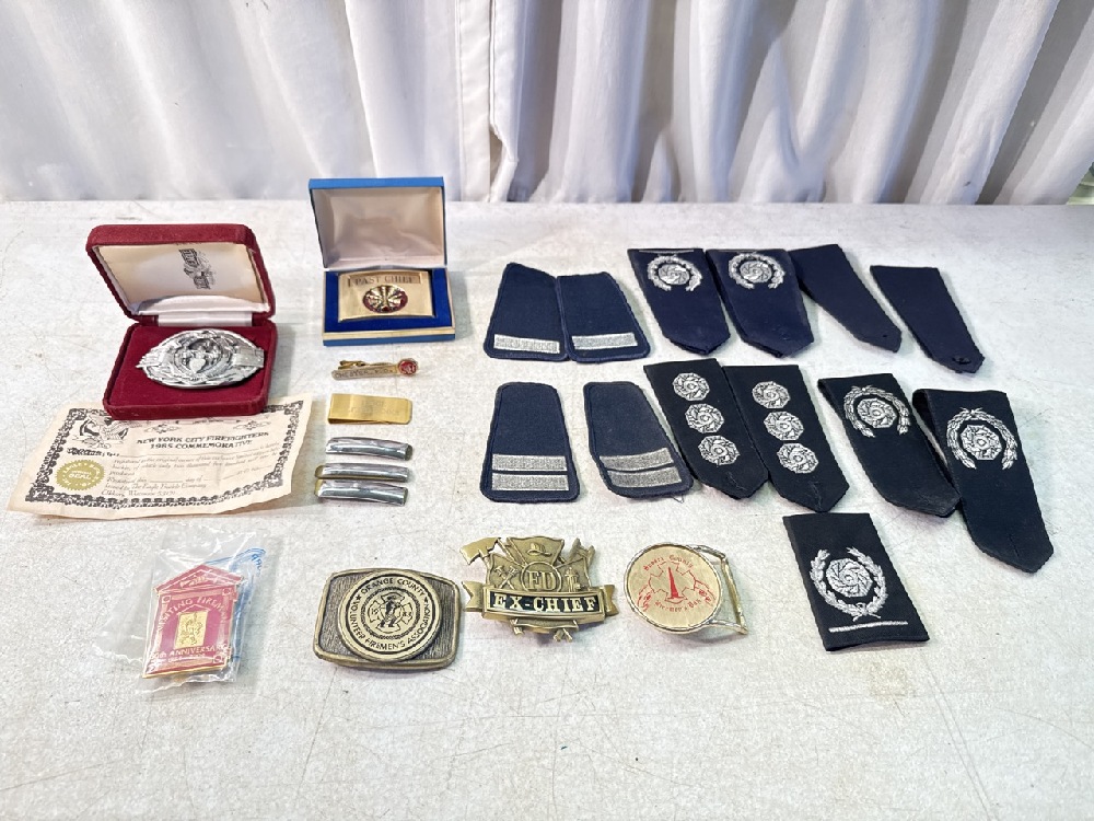 Vtg Firemen’s Collectables Items including Belt Buckles, Pins, Tie Clasp, Uniform Insignia