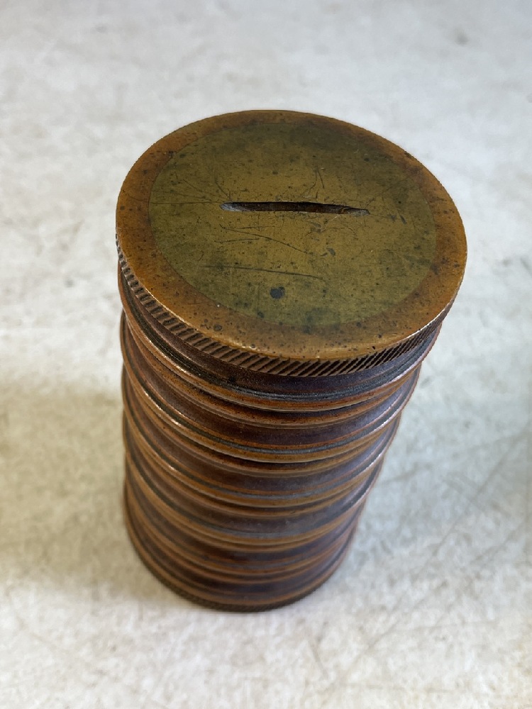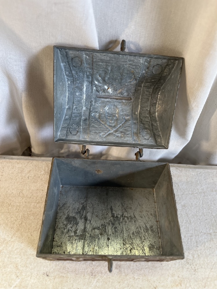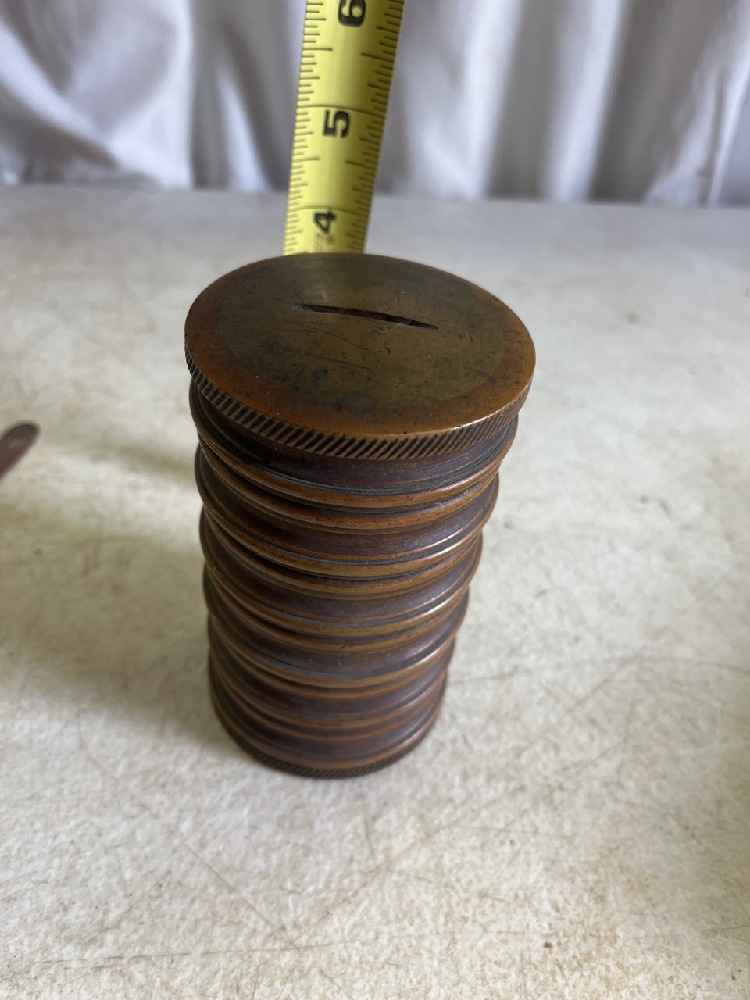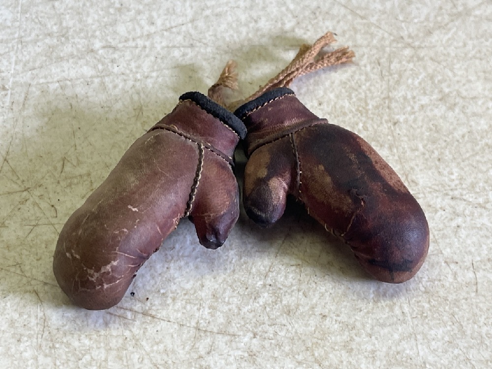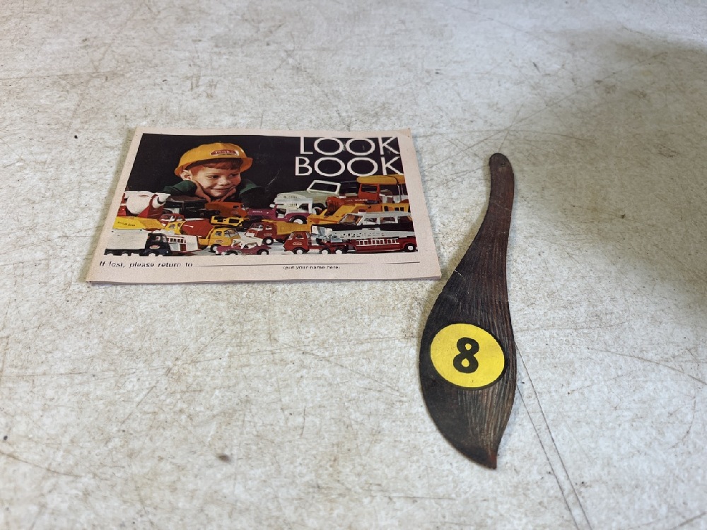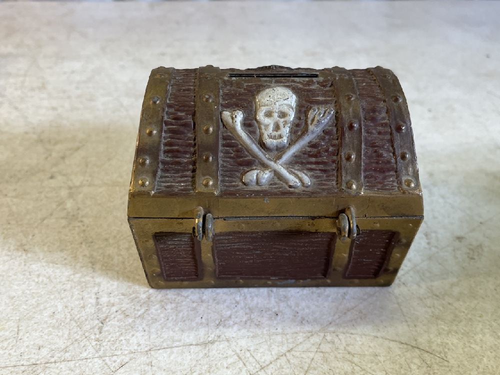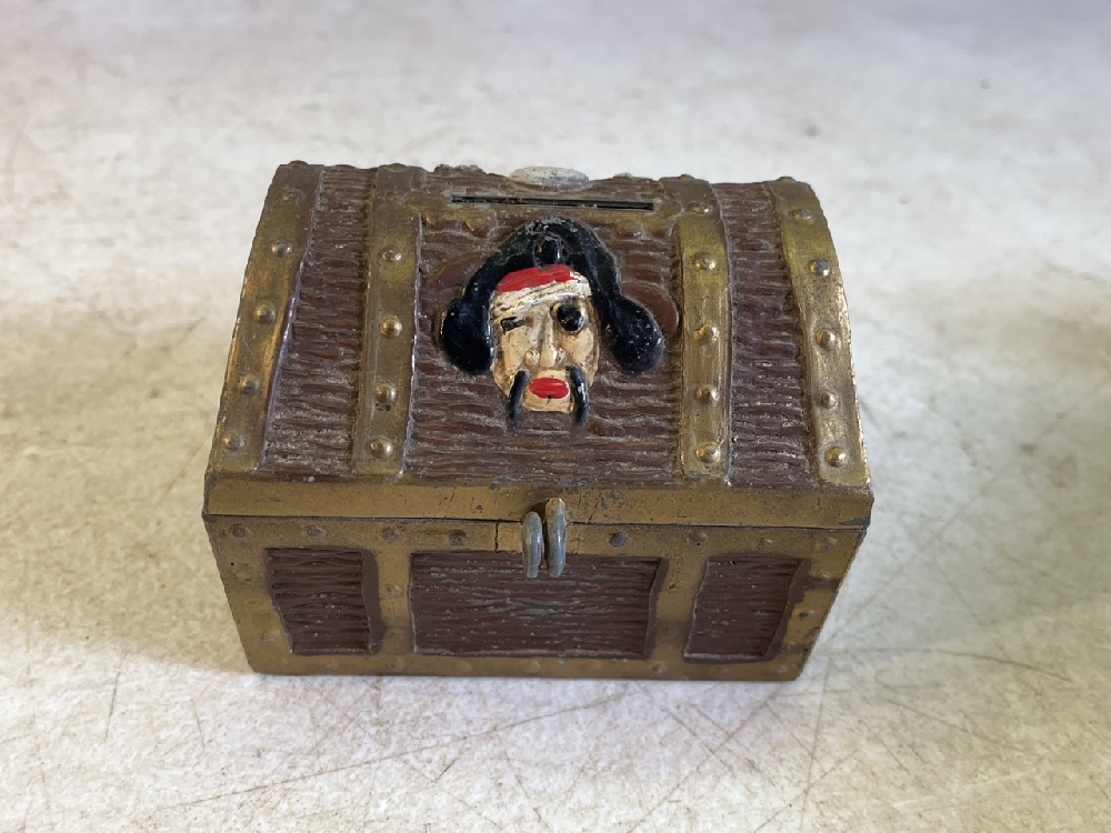 3- Vtg Banks including Heavy Bronze, E J Kahn Pirate Skull Metal, & J. Chain Dime Banks & Miniature Jack Dempsey Boxing Gloves, Tonks Look Book, & Donkey Tail