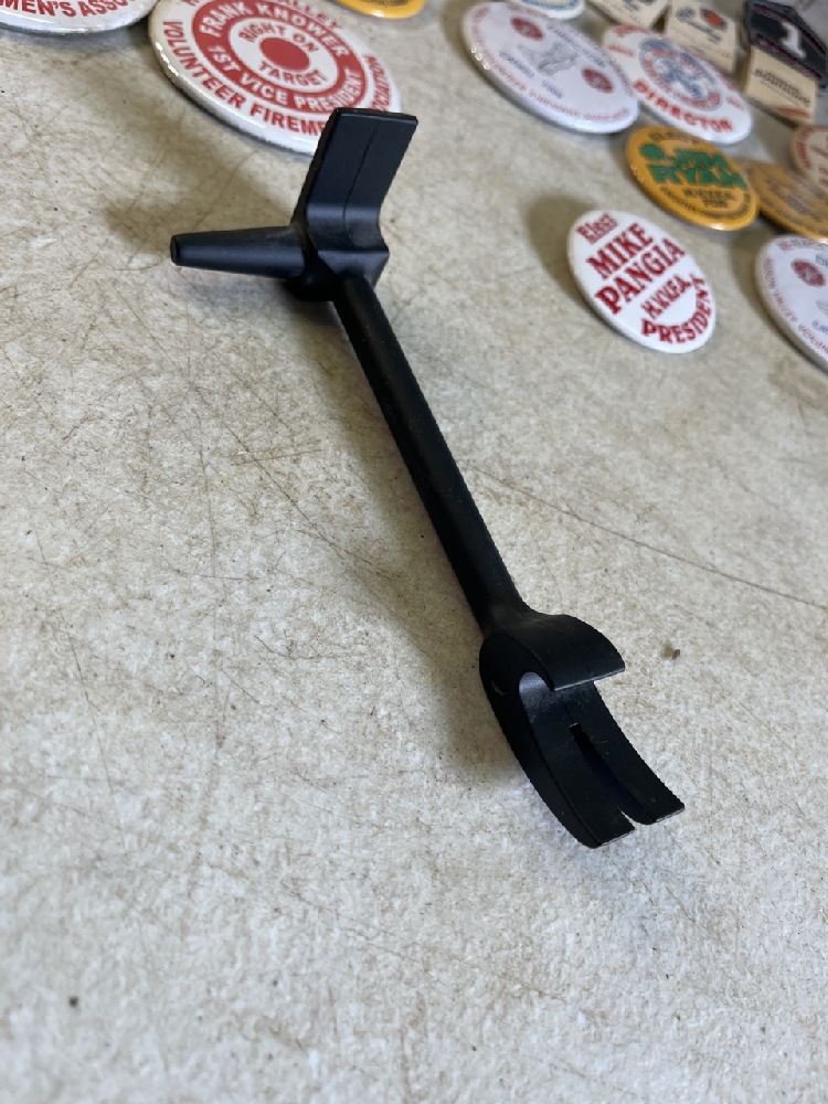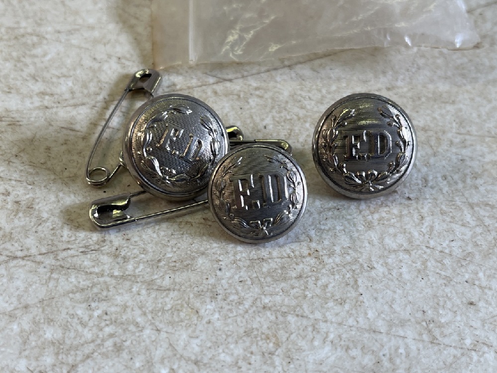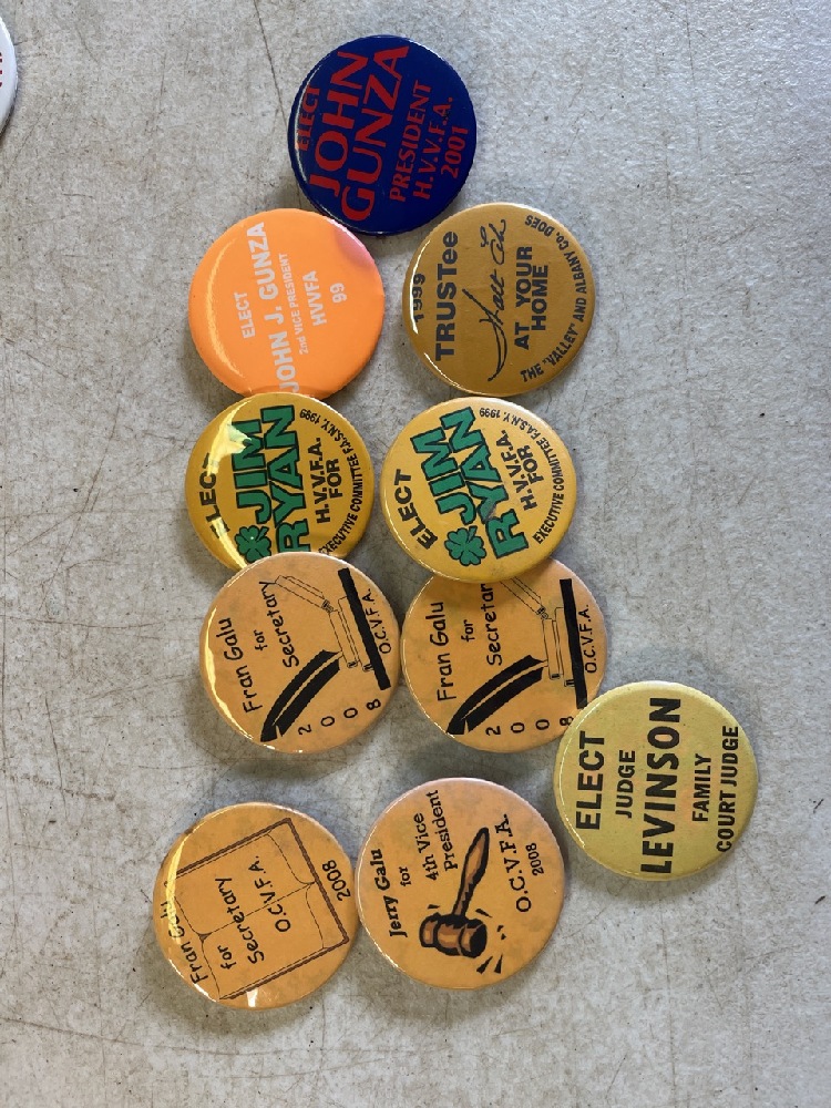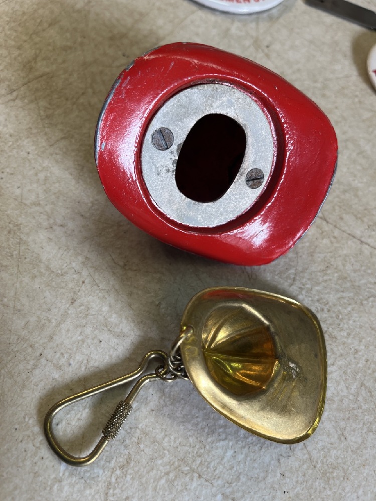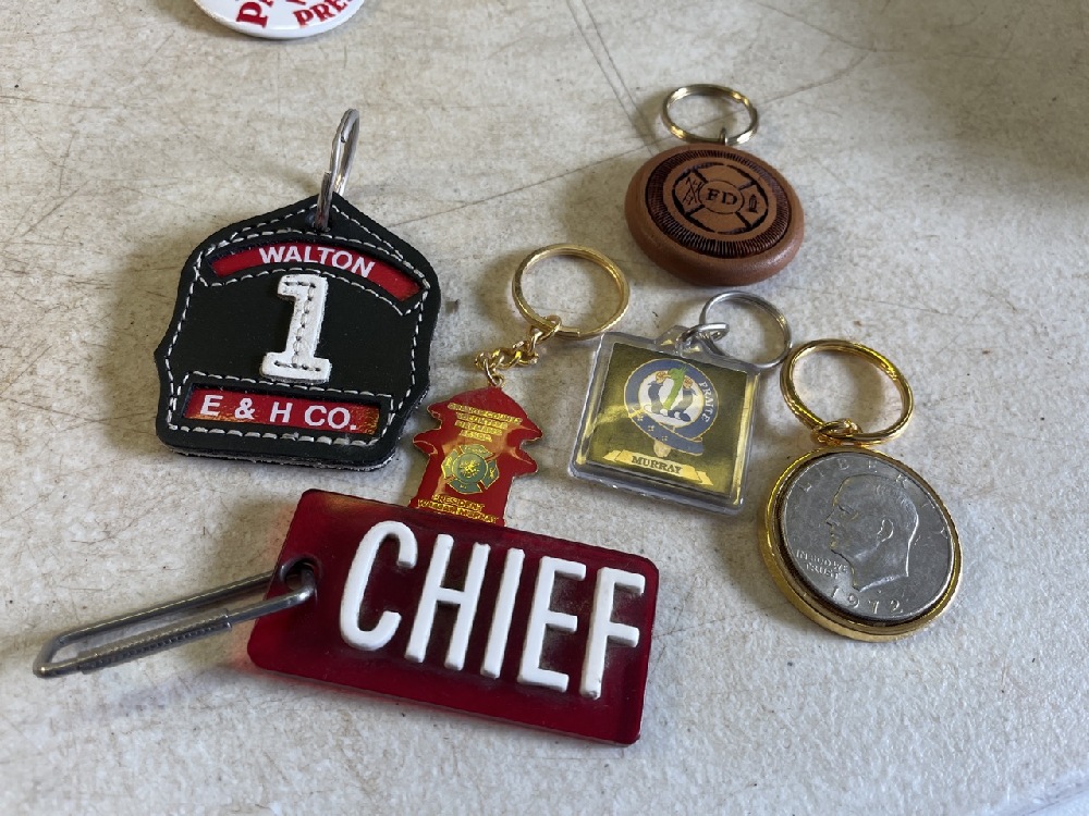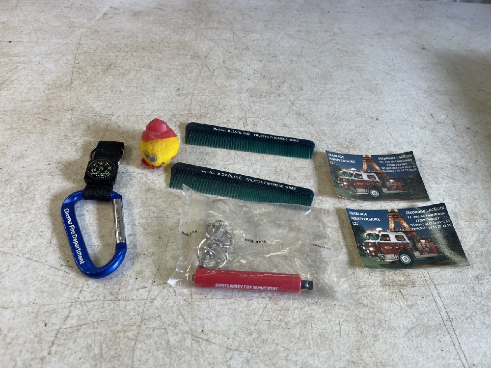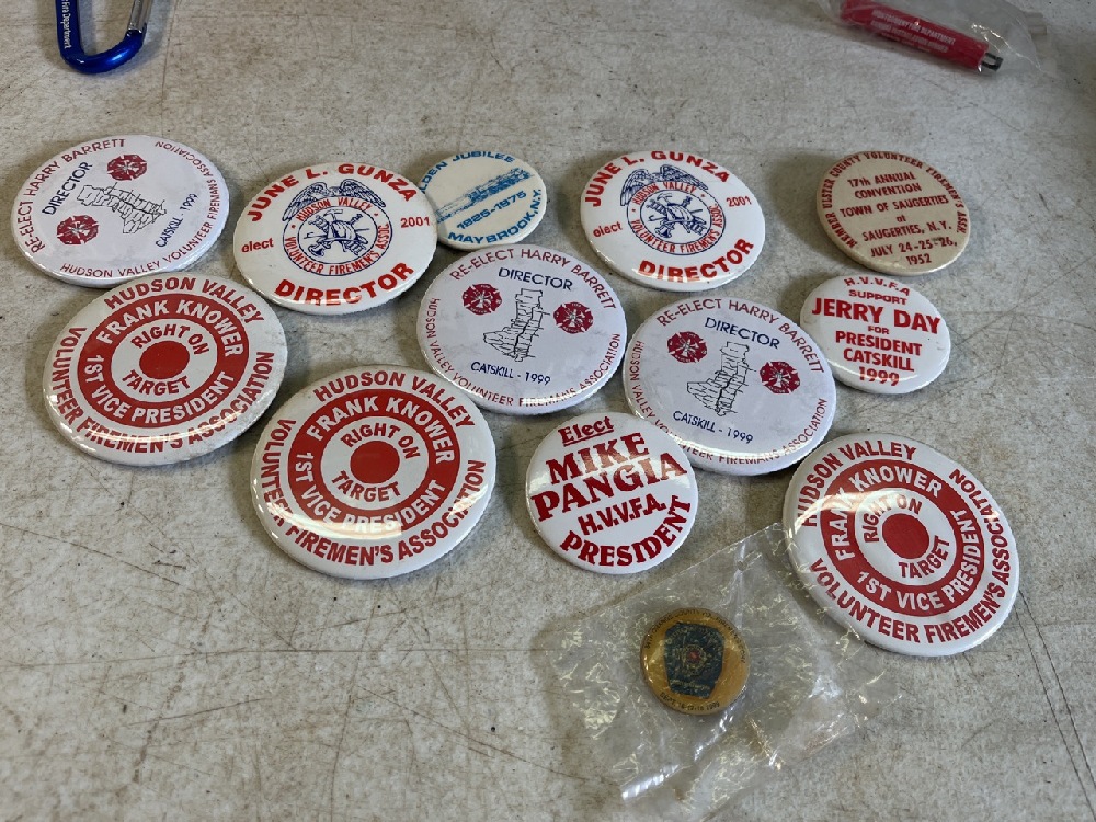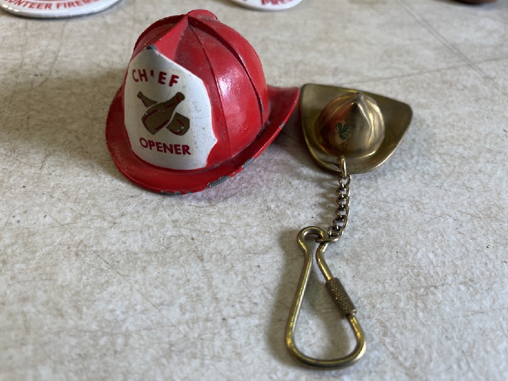 Vtg Fireman’s Collectables including Pins, Chief Opener Helmet, FD Buttons, Key, 2- Acme Thunderer Whistles, & more