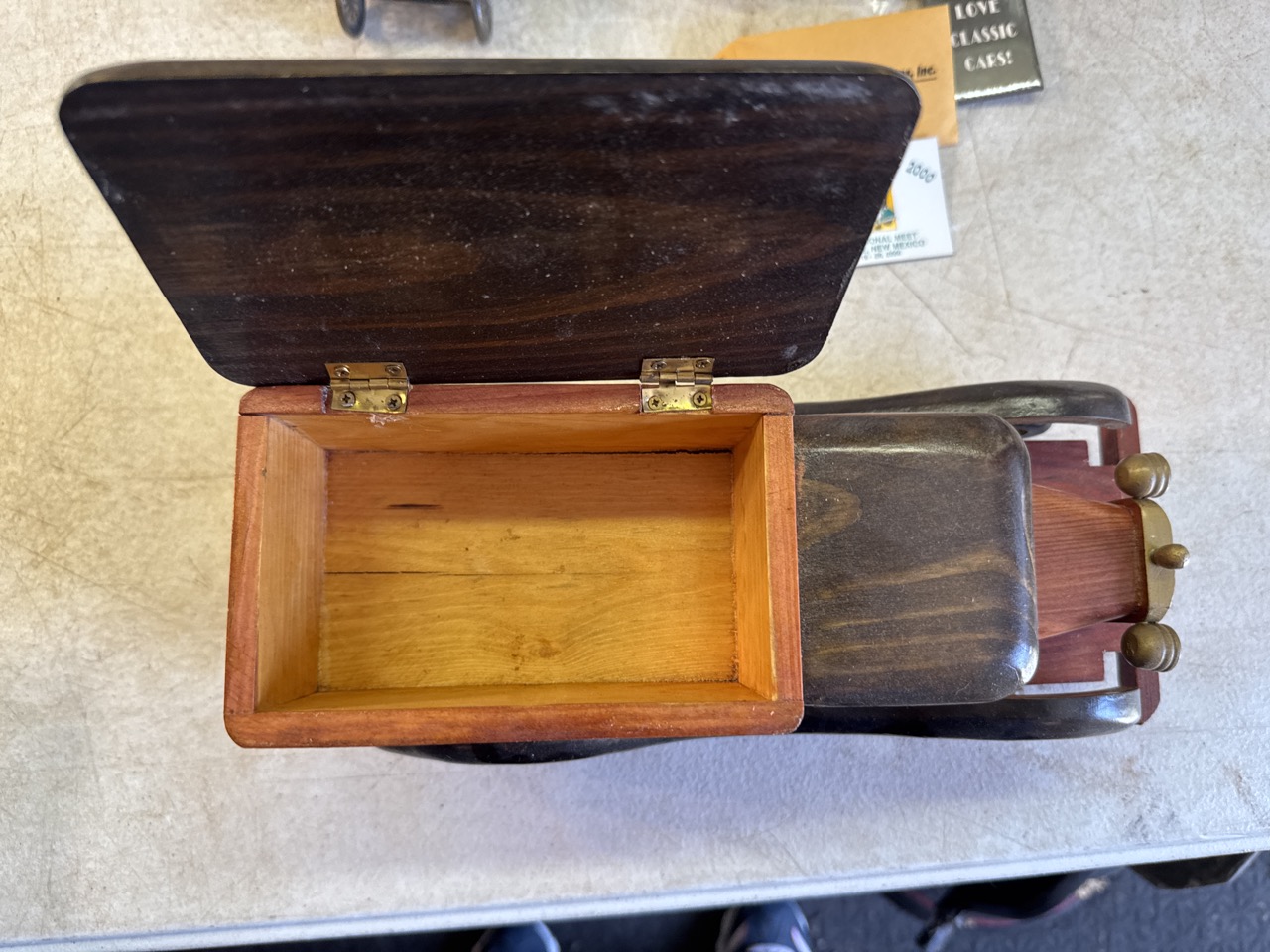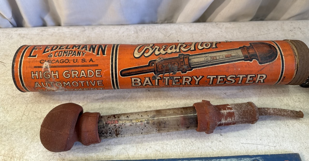 Break-not Battery Tester Manufactured by : E. Eldelmann & Co, Chicago, USA, Brass Classic Car 1911 Figurine with Cigarette Lighter (Cigarette Lighter Is Marked Japan), I Love Old Cars Pin, I Love Classic Cars Pin, Ford Model Instruction Book(Copyright 1928), Murray Body Shop Sign, Campbells Vintage Style Model Rolling Car With Trinket Box With Hinged Roof For Storage 11.5”x 5”