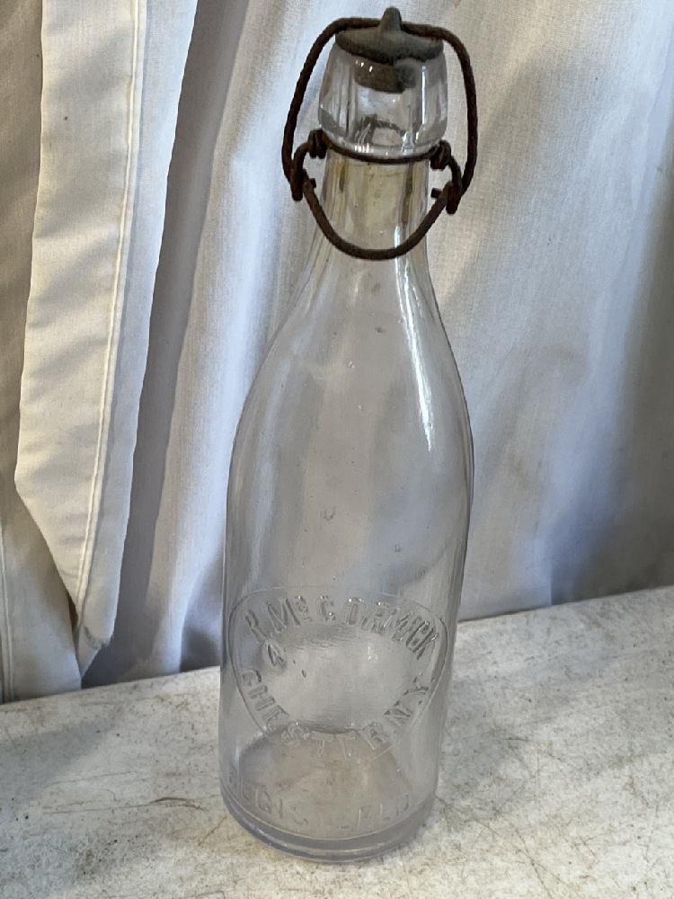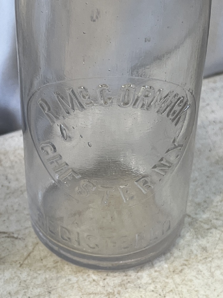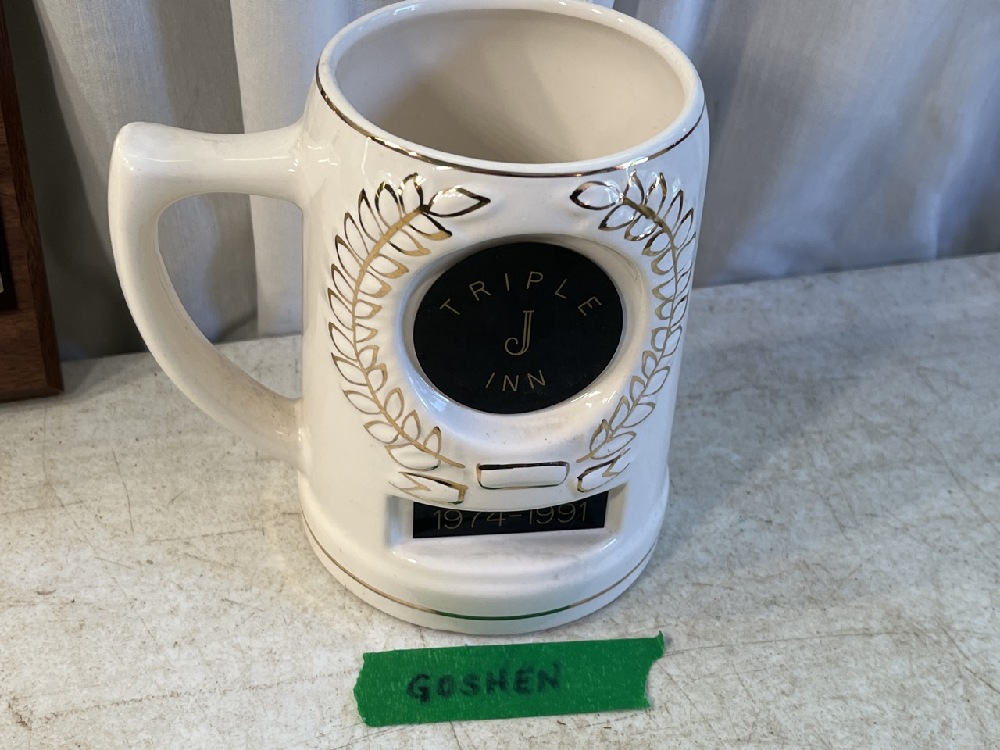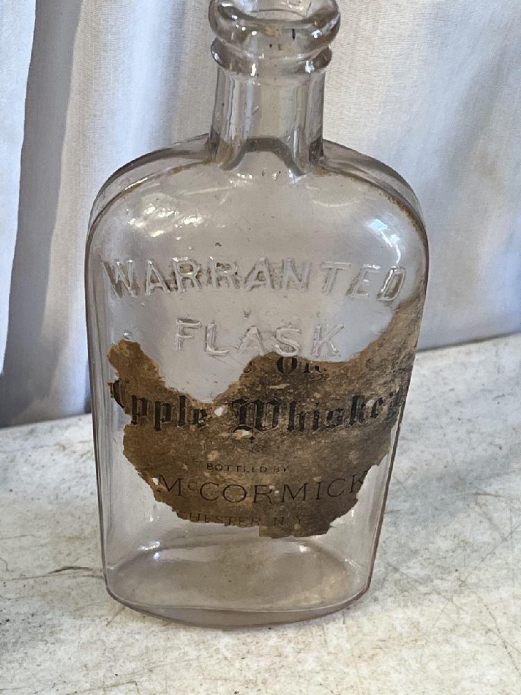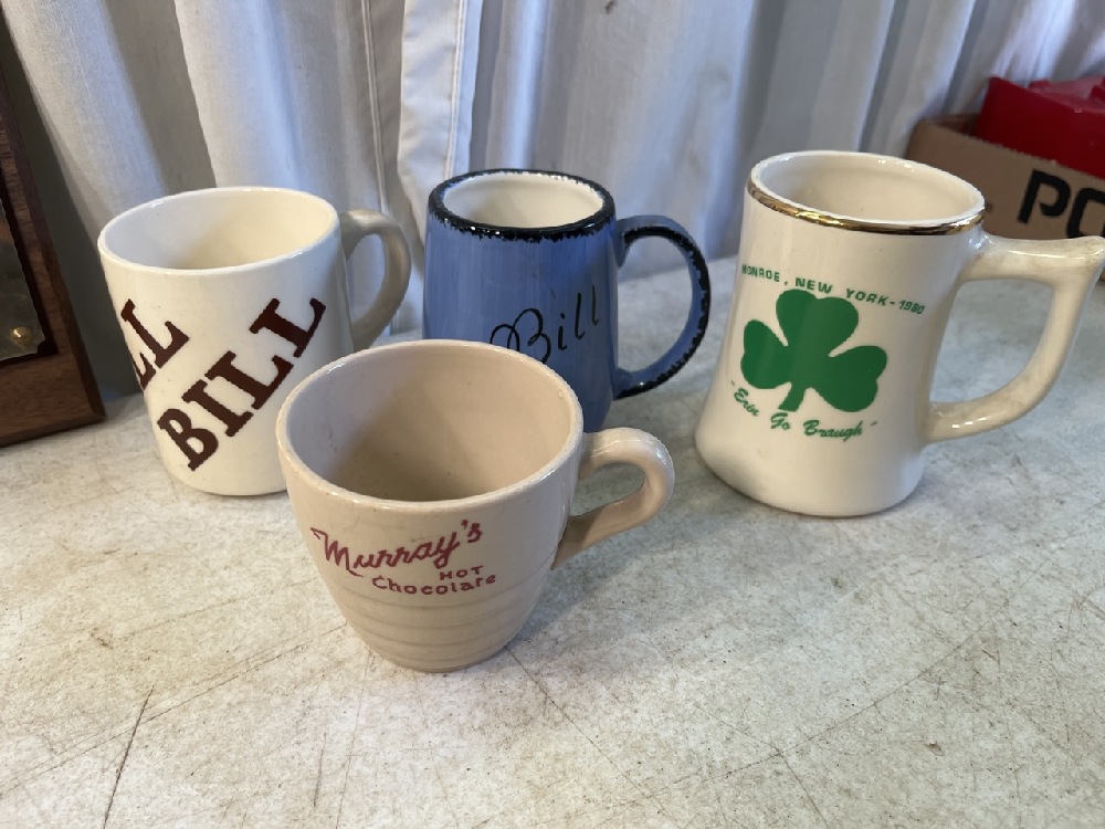 Various Vtg Bottles R. McCormick Chester, Ny & Apple Whiskey Flask, Mugs including Murray’s Hot Chocolate, Monroe, NY Irish, Triple J Inn Goshen,NY, Tins including Baking Powder