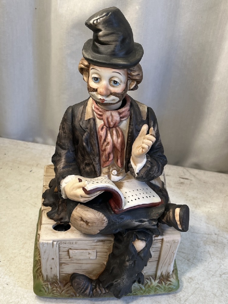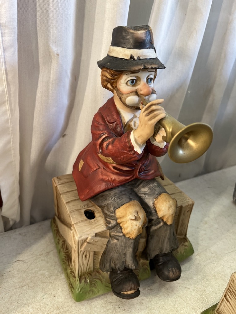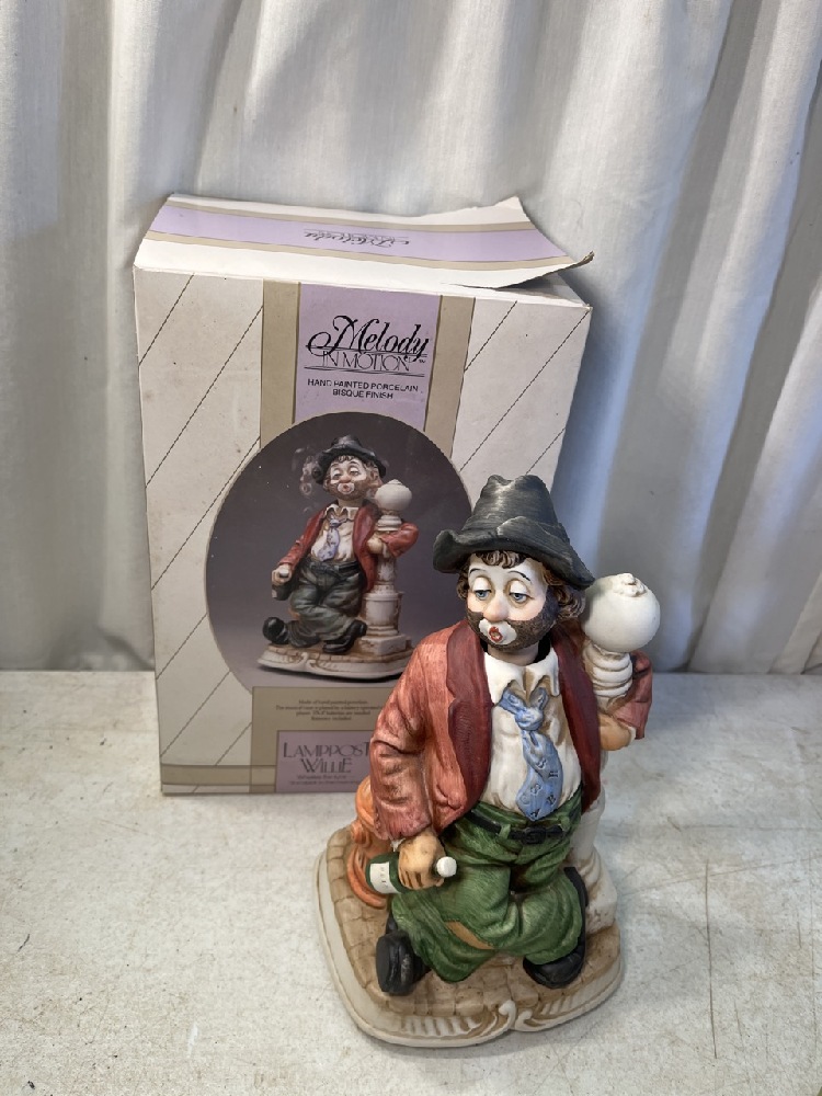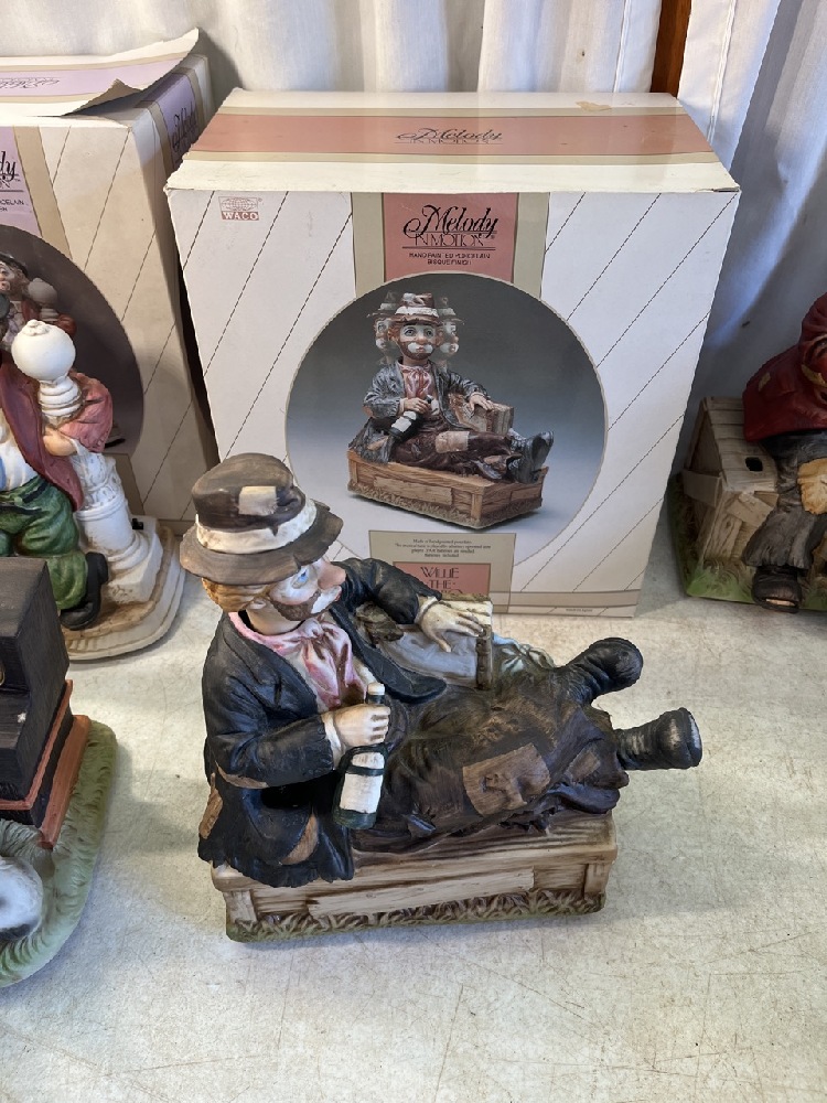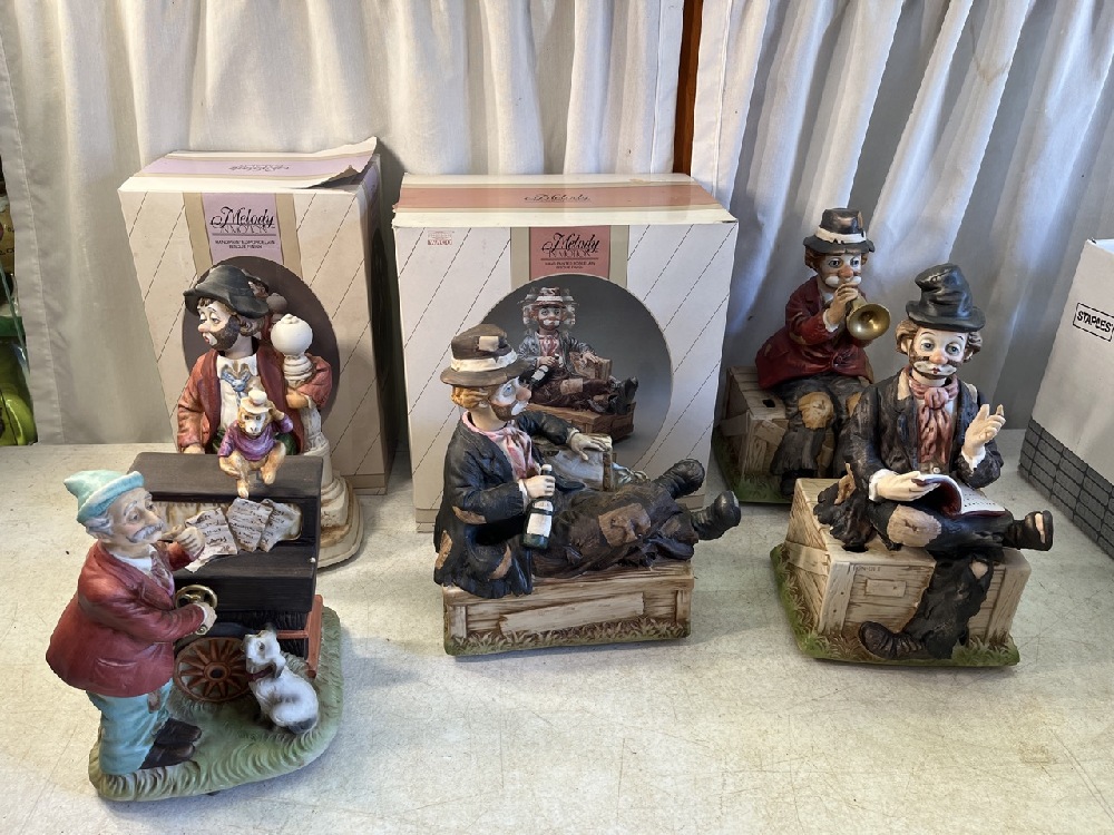 Melody in Motion Porcelain Musical Figurines including Willie The Hobo, Lamppost Willie, Organ Grinder, Whistler Hobo Clown, & Willie The Trumpeter