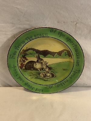 St. Augustine Ware Staffordshire Motto Rhyming Rabbit Plate (hairline crack) - 10” Round
