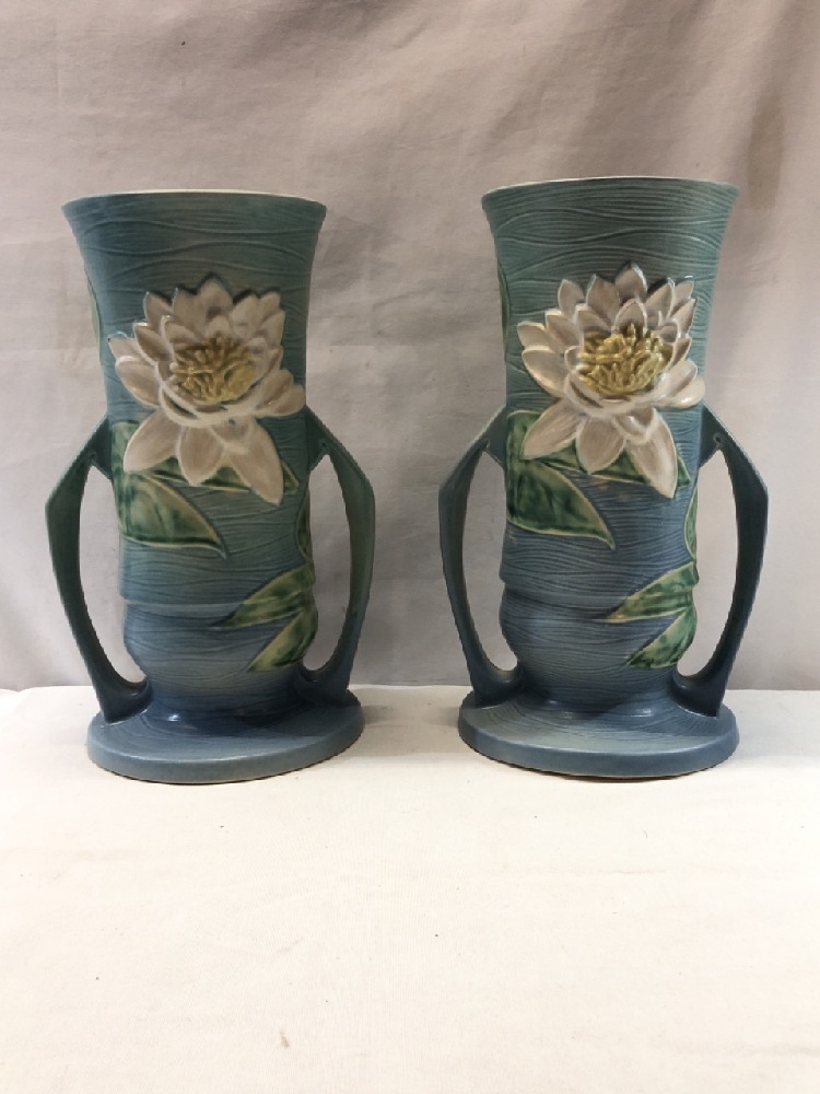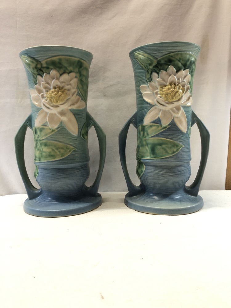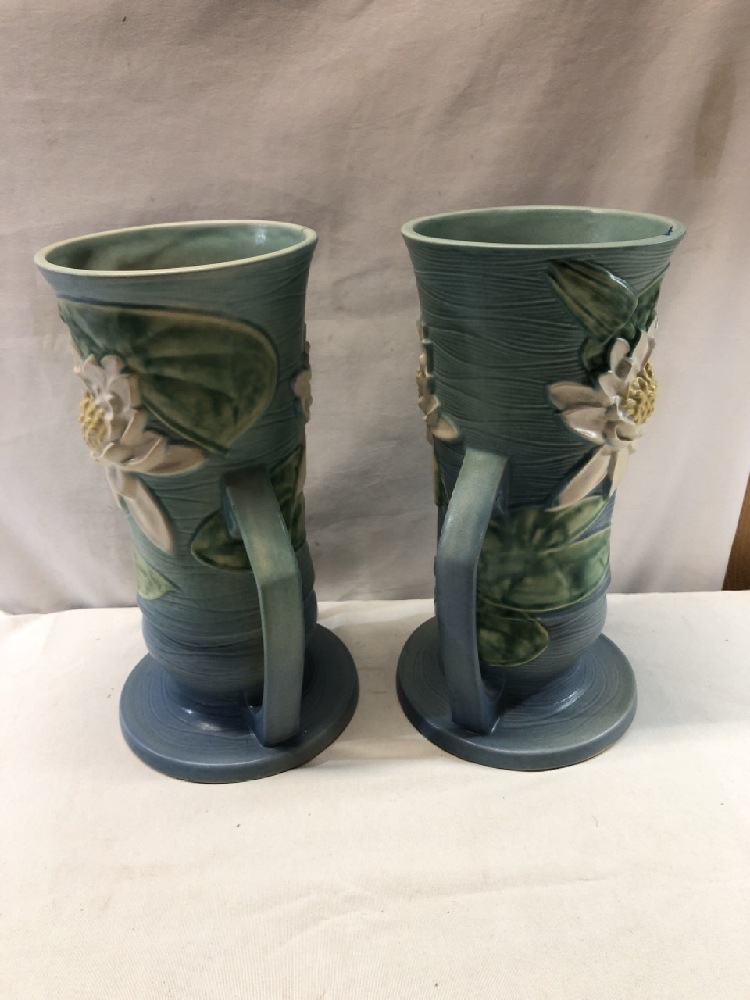 Large Pair Roseville Water Lily Vases ~ Double Handled ~ 14 1/4” Tall