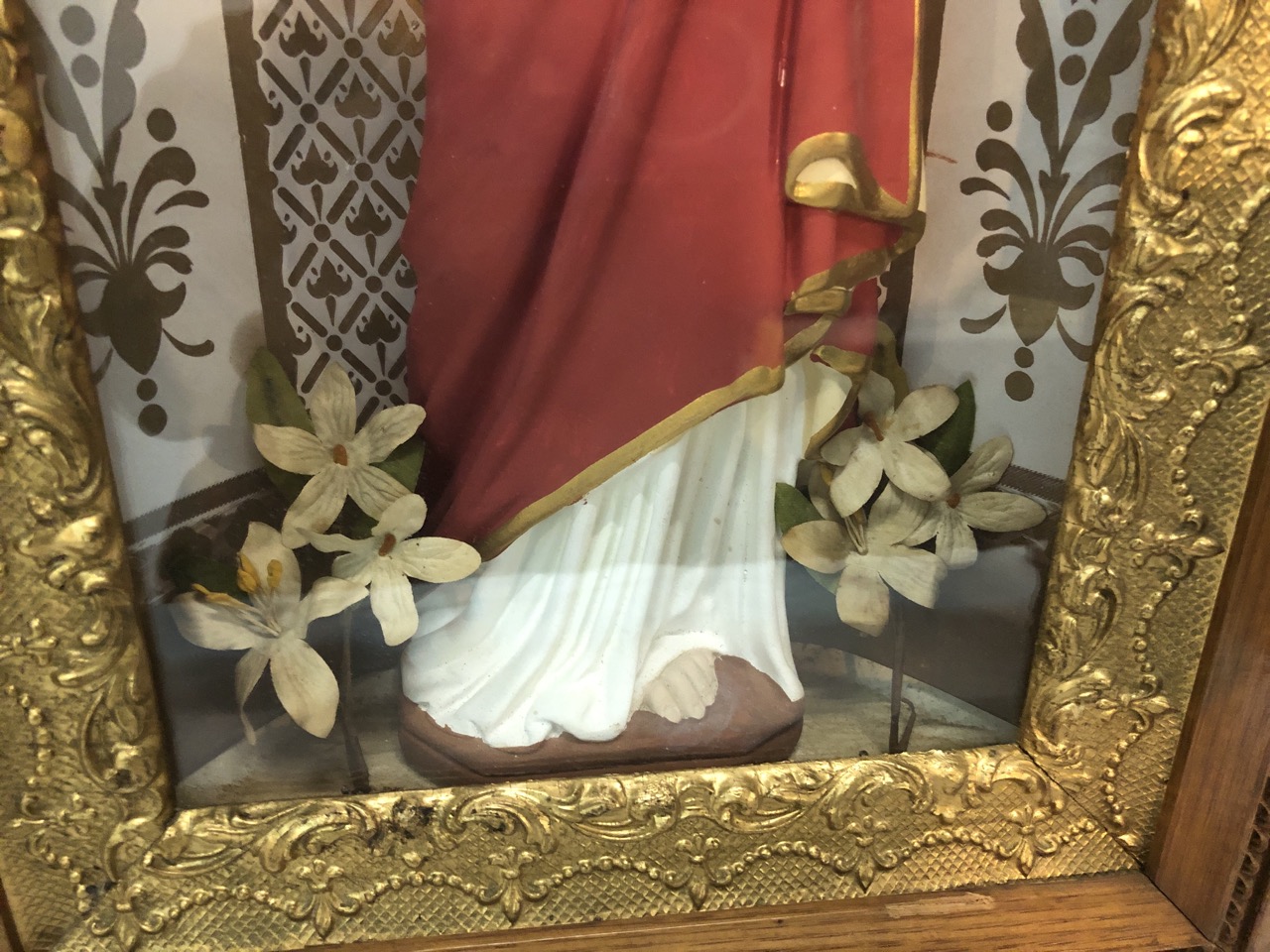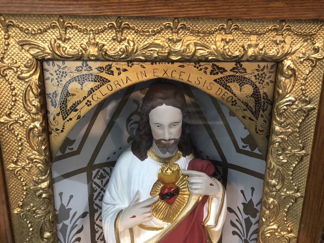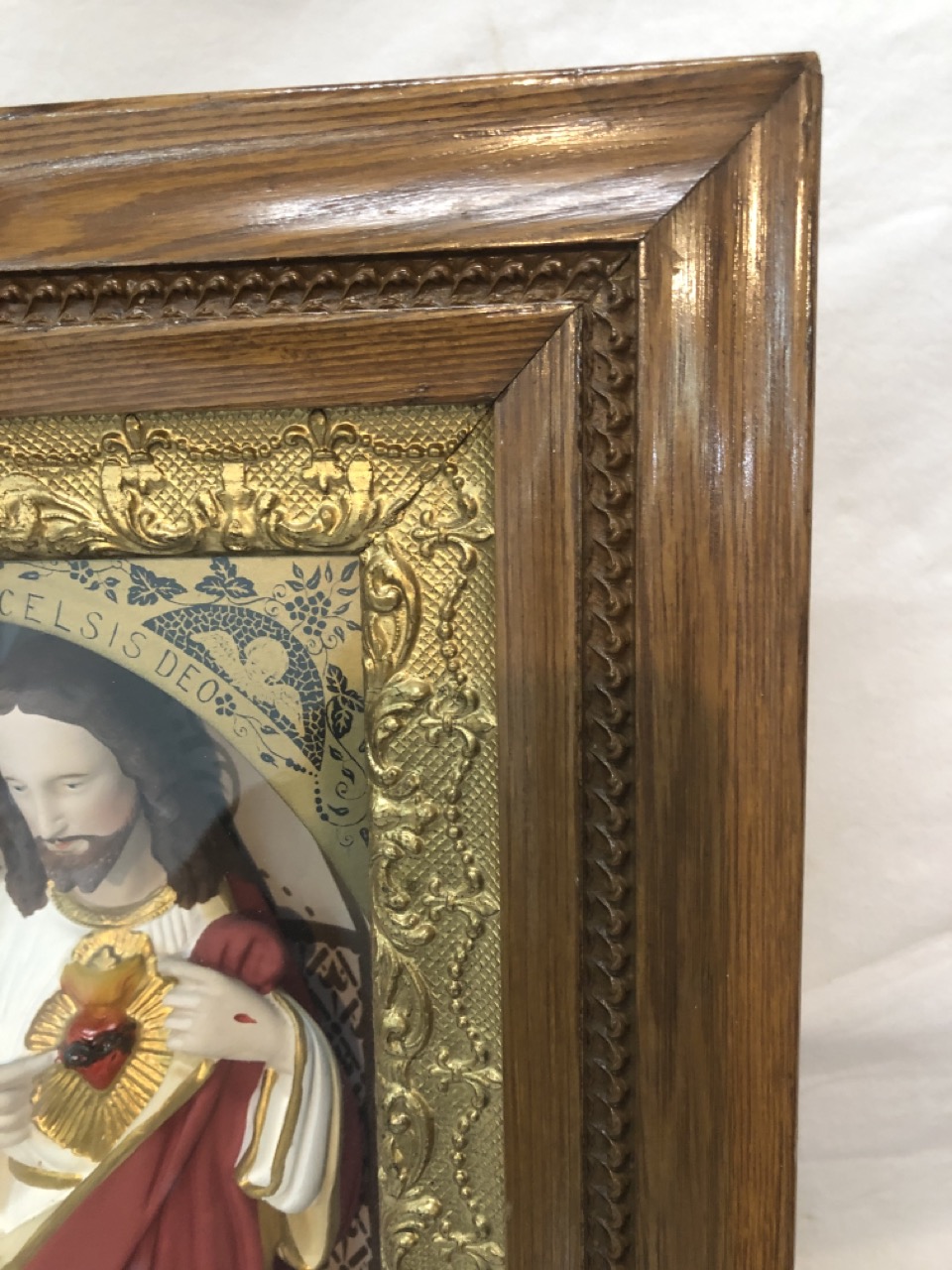 Antique Sacred Heart of Jesus Shadowbox~ Gold Gilt & Wood Frame~ 24” T x 15” W x 4” D