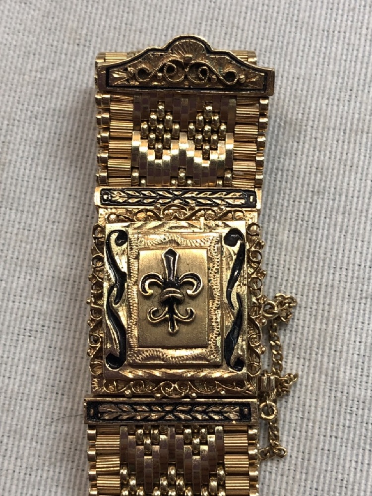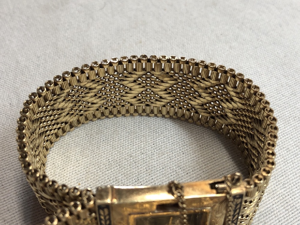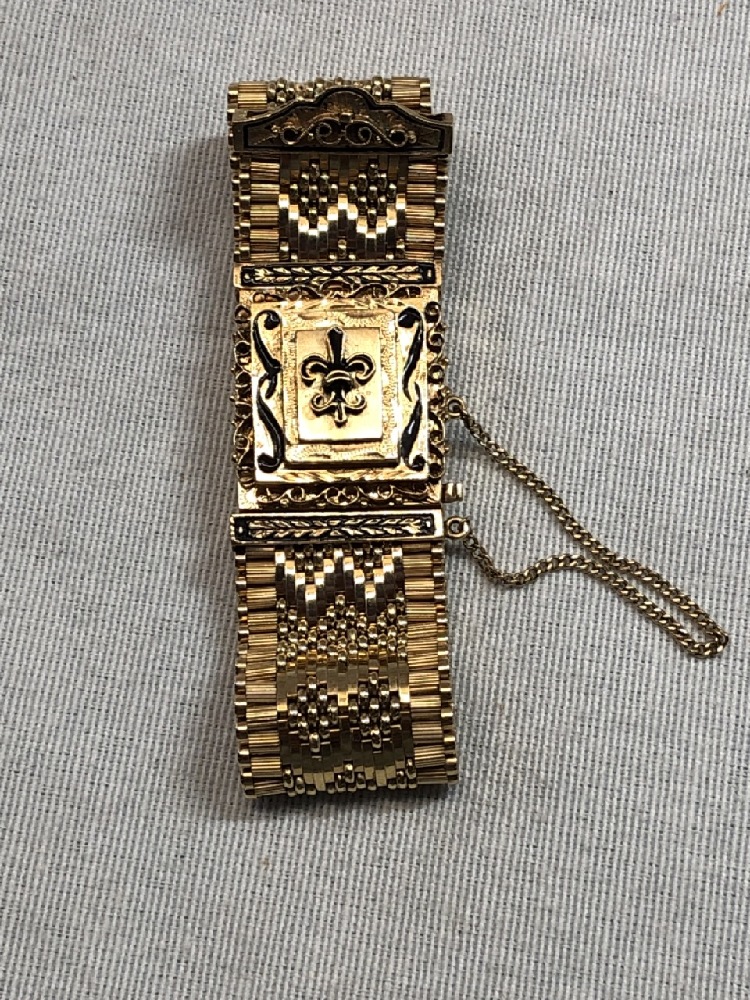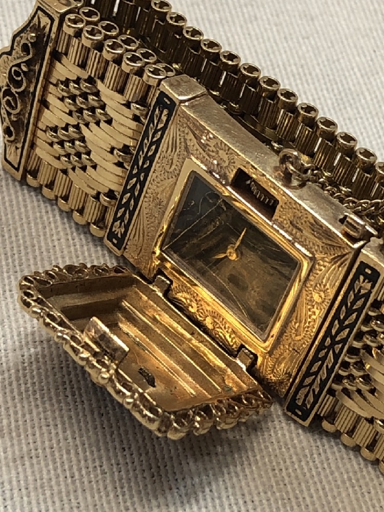 14K Gold Art Deco Hidden Watch Bracelet Circa 1950 Featuring Black Enamel Accents and Intricate Engraving- back Monogramed “SM” - Le Mare 17 Jewels Watch ~ 60.4 Grams Total Weight