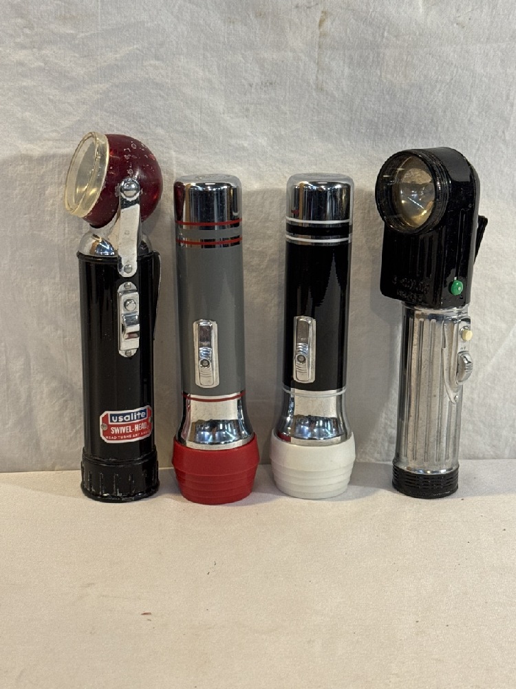 4 Vintage Flashlights - 2 Eveready, Usalite Swivel-Head and Parrot 3 Color No. 353