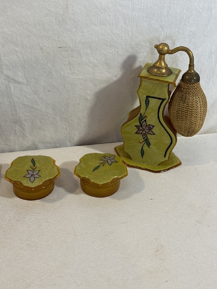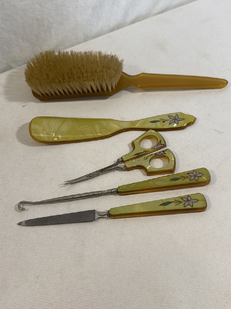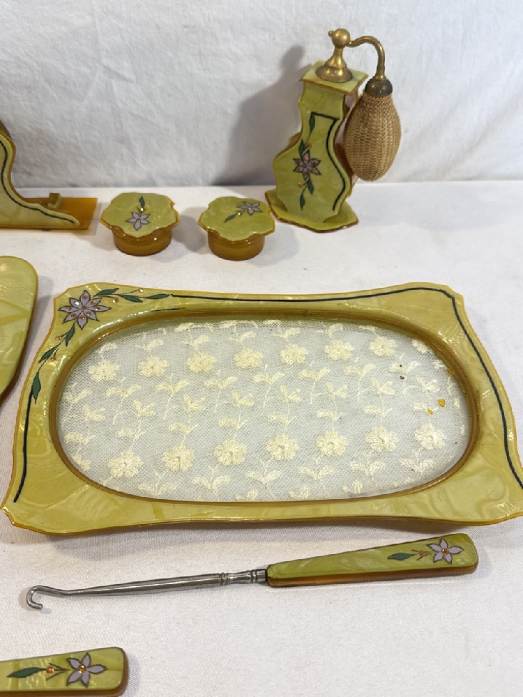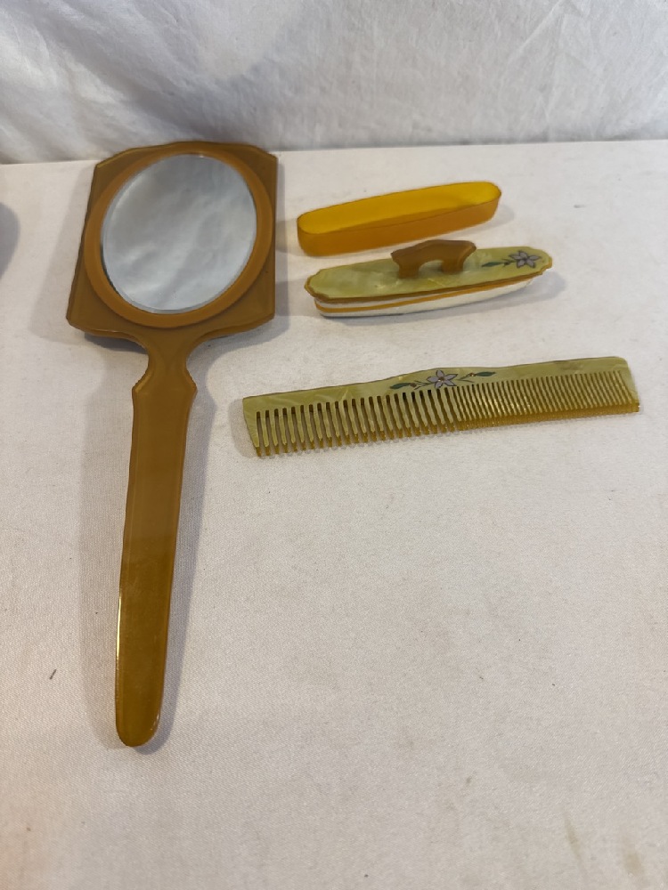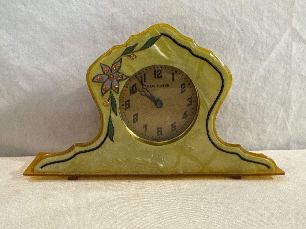 Vtg. Art Deco Celluloid Vanity Set - 13 Pc Set Including New Haven Clock with extra Turquoise / Gold colored Brush