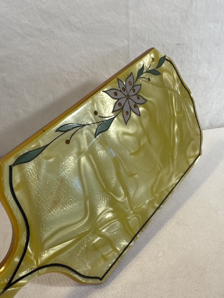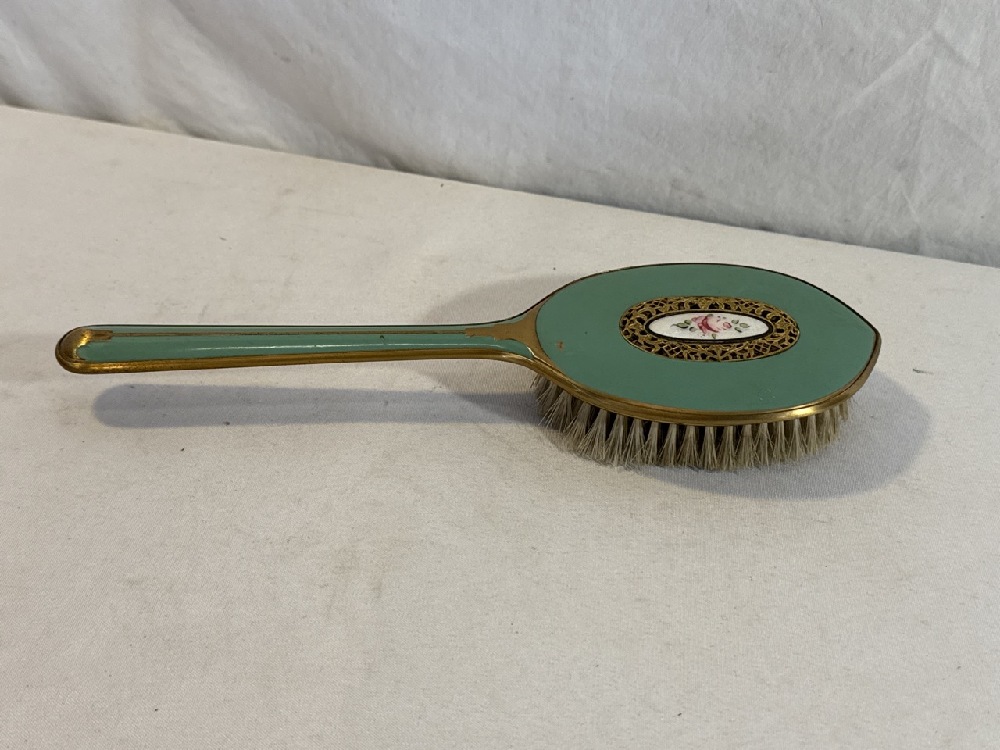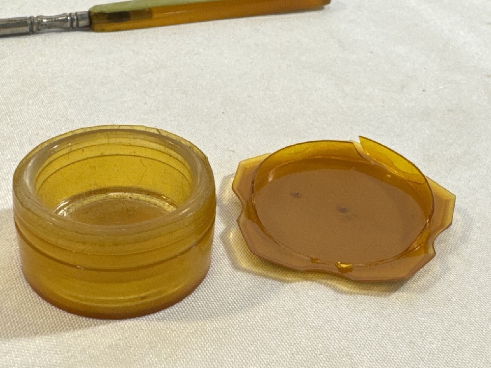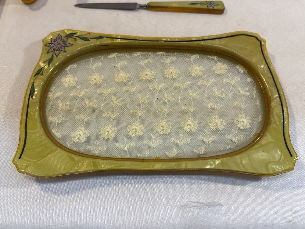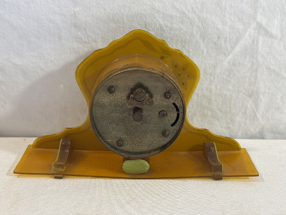 Vtg. Art Deco Celluloid Vanity Set - 13 Pc Set Including New Haven Clock with extra Turquoise / Gold colored Brush
