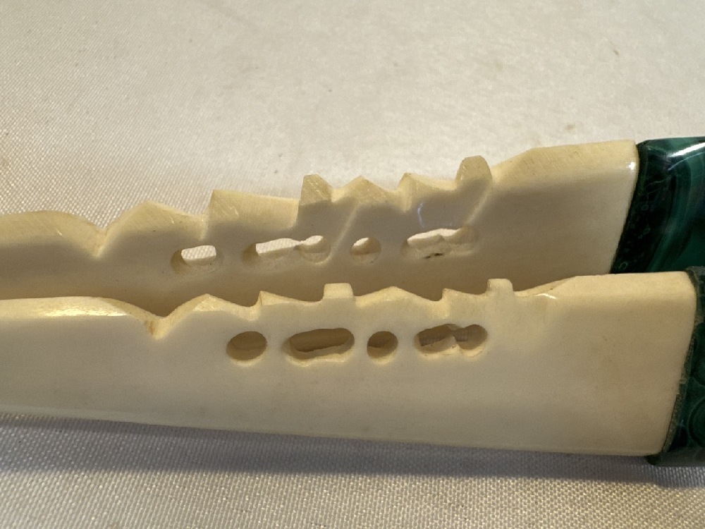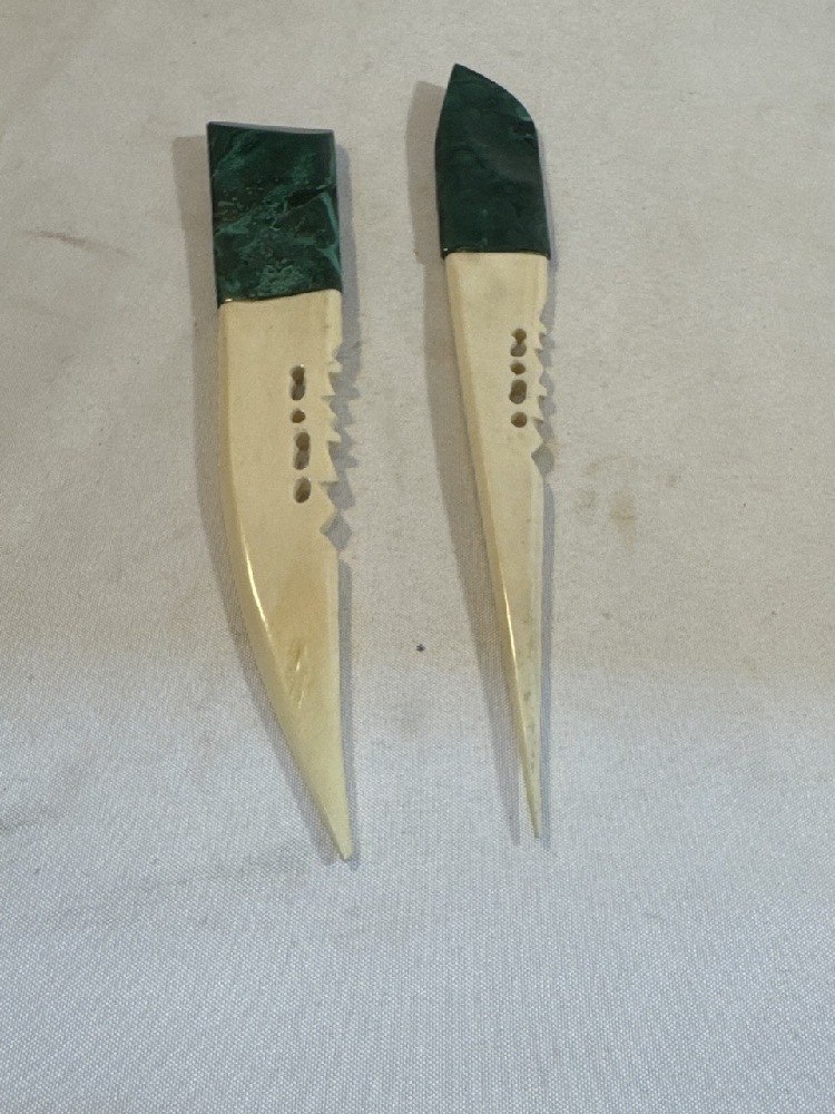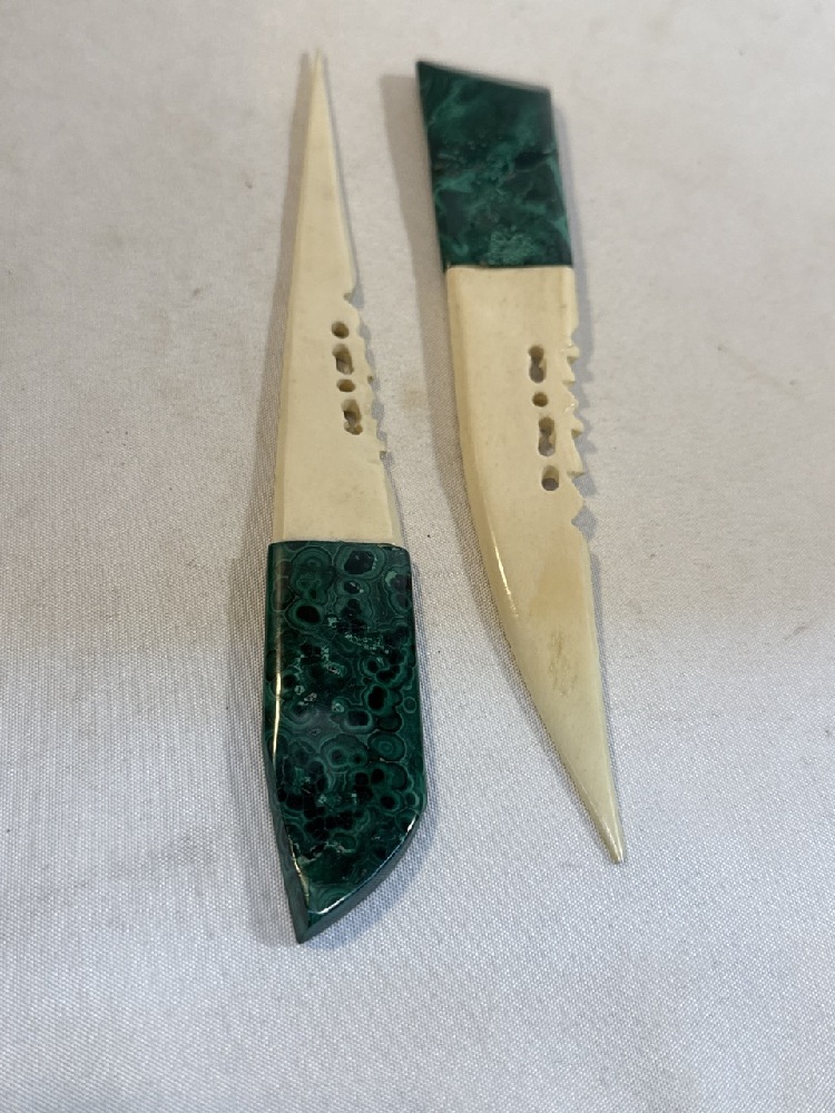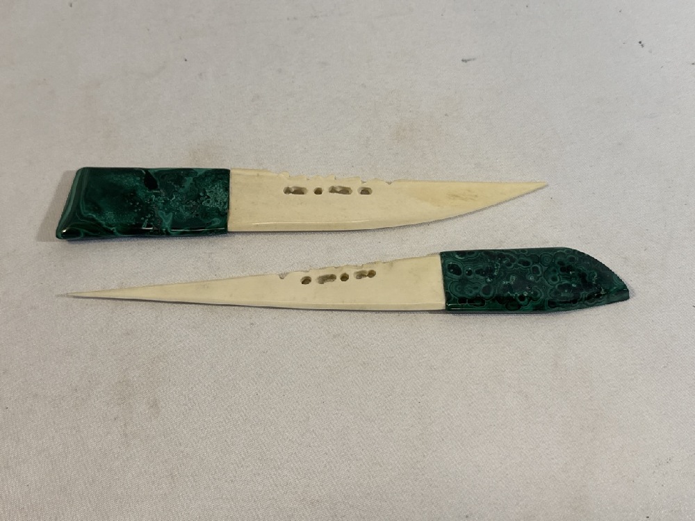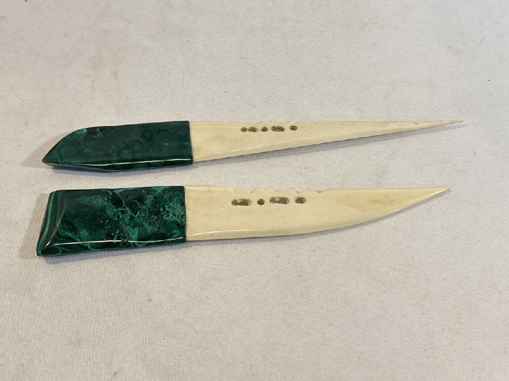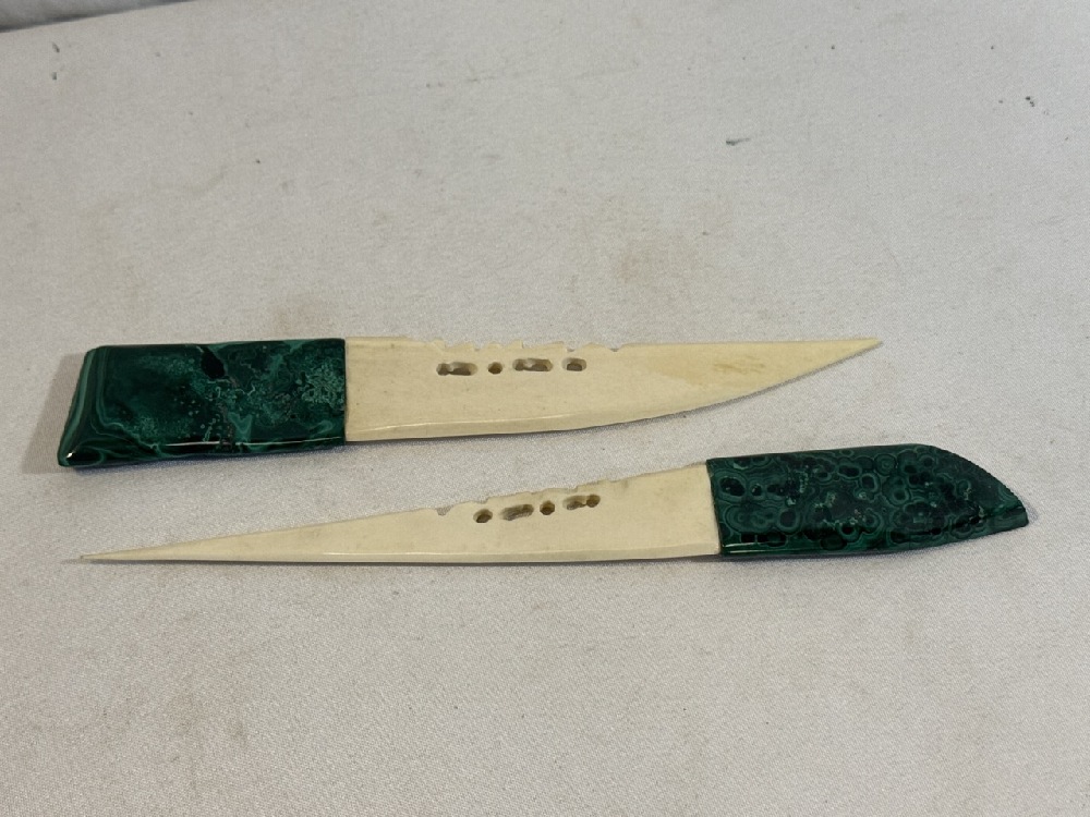 2 Antique Malachite and Bone African Letter Openers - one 8 1/2” and one 9 “