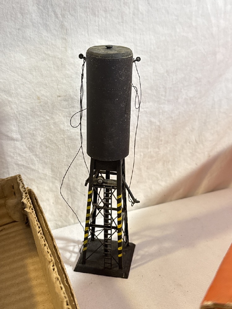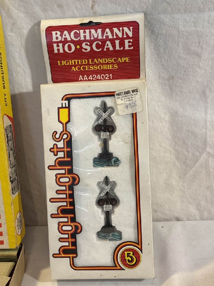 Vtg. Train Accessories - Lionel No. 110 Trestle Set, Bachmann Railroad Crossing Signs, German Newark NJ Miniature City Buildings and water tower