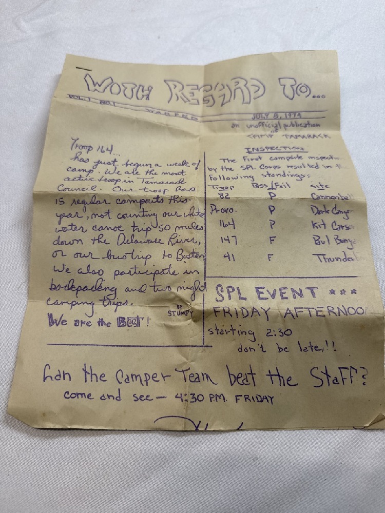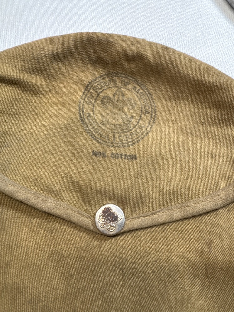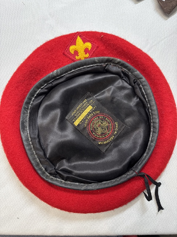 Vtg. Boyscout Memorabilia including Merit Badges on Sash, Mess Kit, Order of the Red Arrow Sash, 3 Garrison Uniform Hats, wool Red Baret, Hand Carved arrow of light Symbol and Whistle, Membership Cards, Hand written letters, American flag handkerchiefs and more