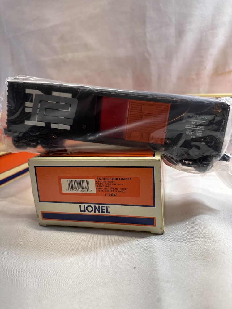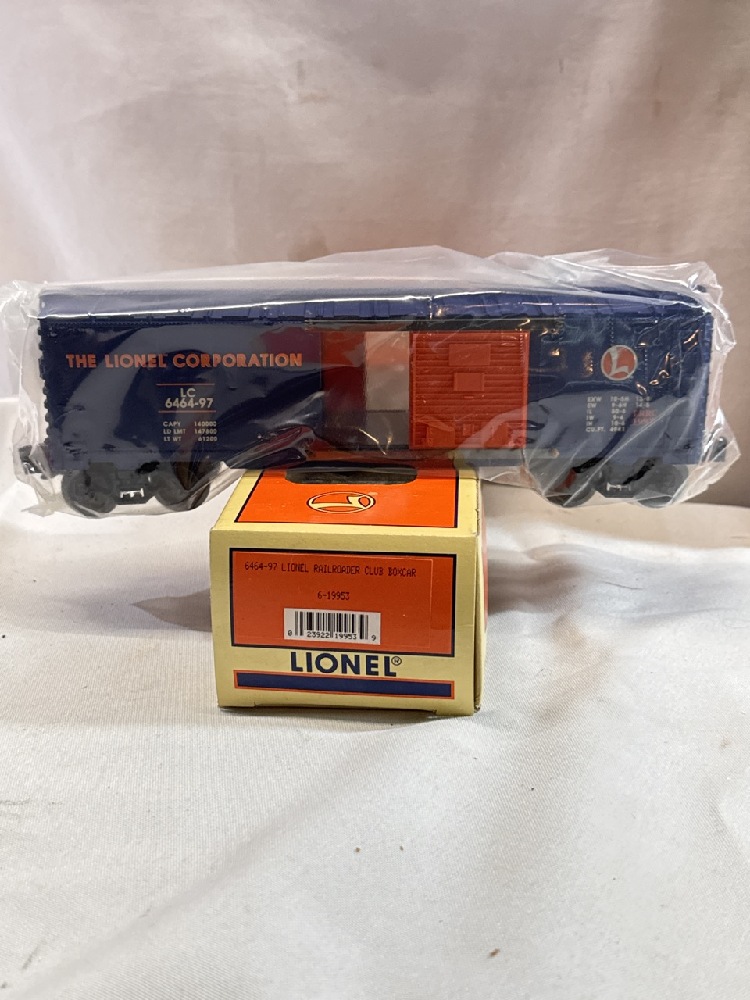Lionel Train Cars including Railroader Club Boxcar, Railroad Club Fpur-Bay Hopper, P.C./ NH Overstamp BC, Toy Fair Box Car