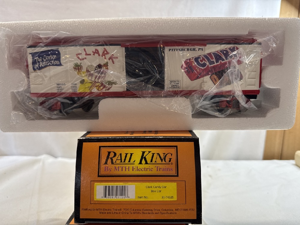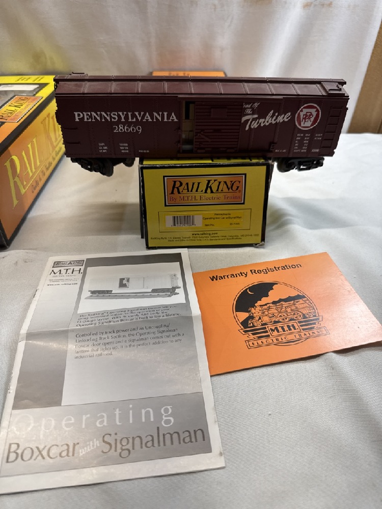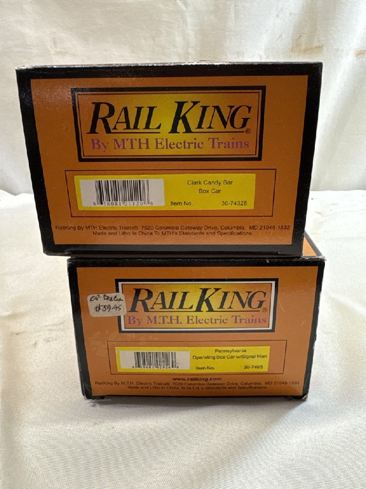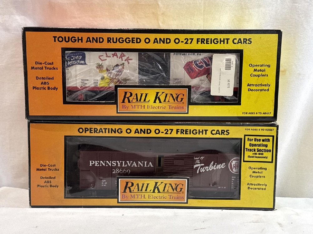 Rail king by MTH Electric Train Cars Clark Candy Bar Box Car and Pennsylvania Operating Box Car w/ Signal man