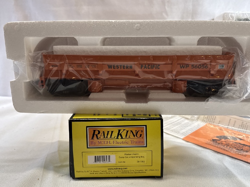 Rail king by MTH Electric Train Cars- Western Pacific Dump Car W/Operating System and Northern Pacific 40’ Double Door Box Car