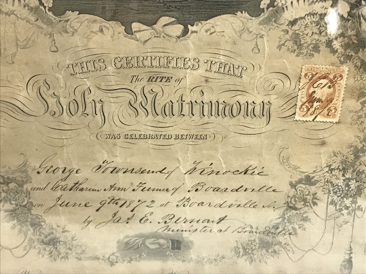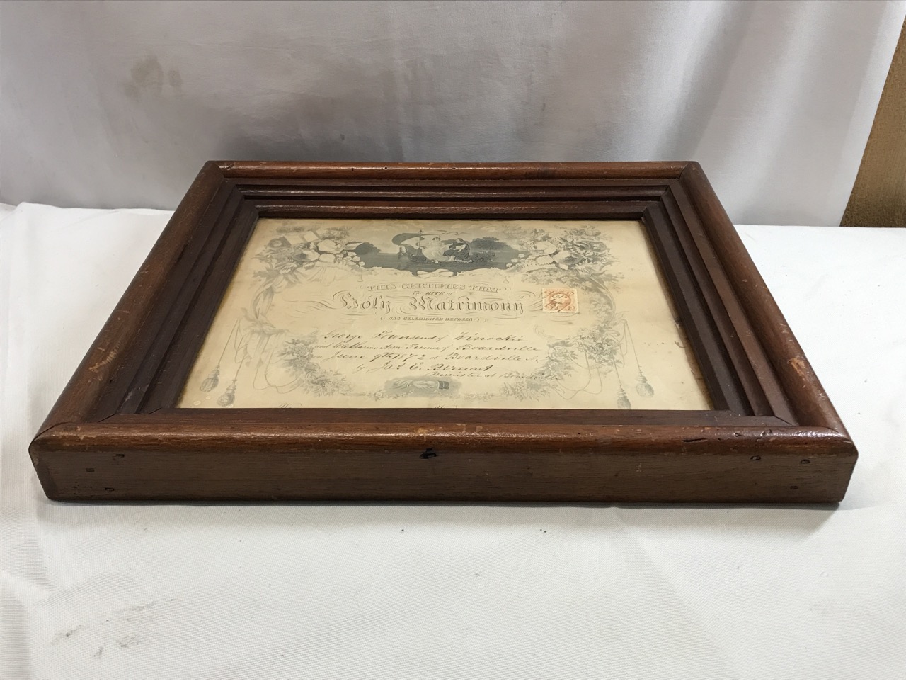 Antique Framed Marriage Certificate - June 9, 1872~ 14 1/2 x 12 1/2