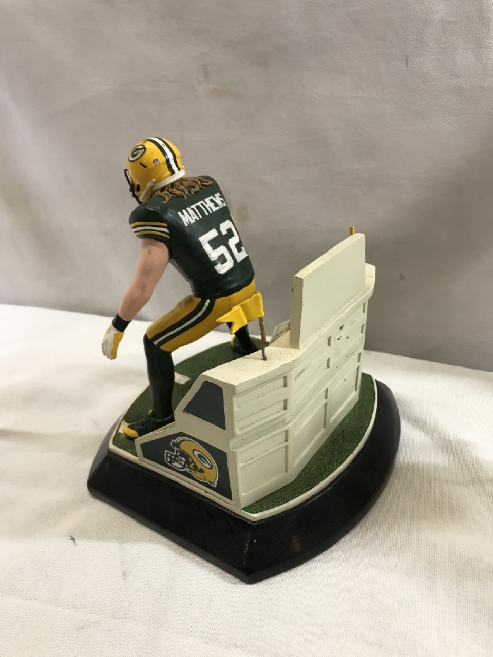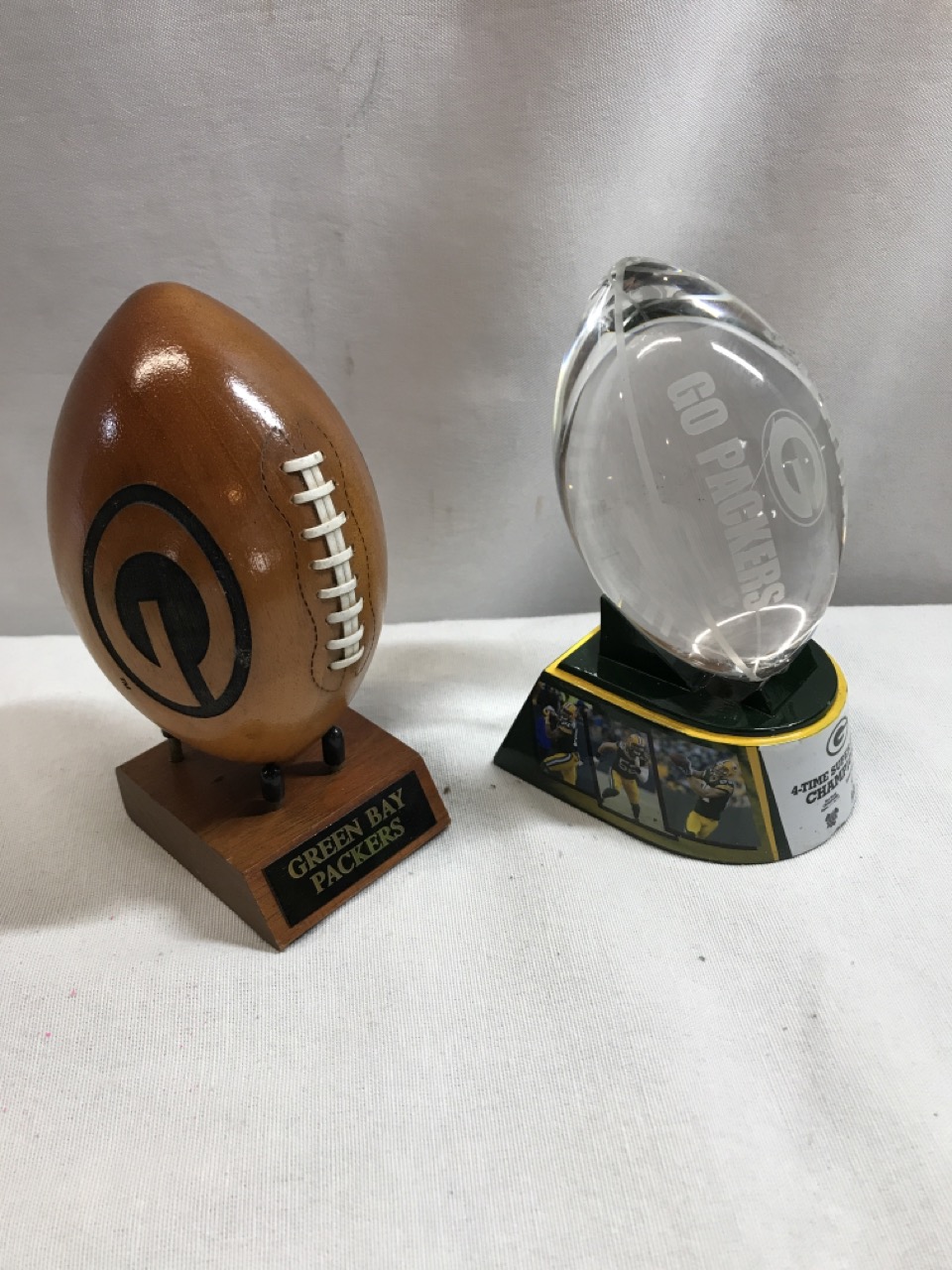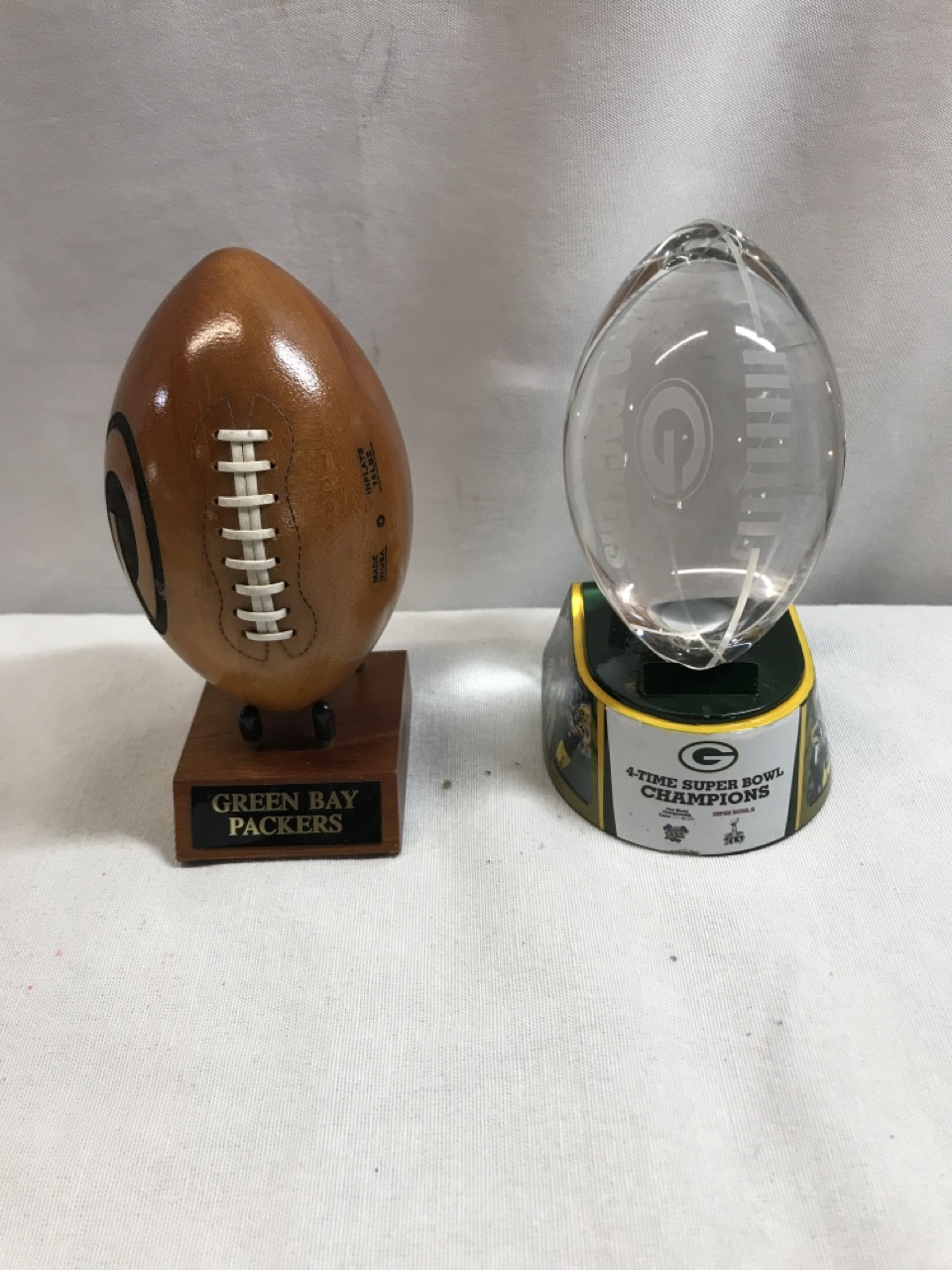 Vtg. Greenbay Packers Memorabilia including Legends of the Game Clay Matthews, 4 time Super Bowl Champions Glass Football, Wooden Football, Brett Farve Figures, Green Figure