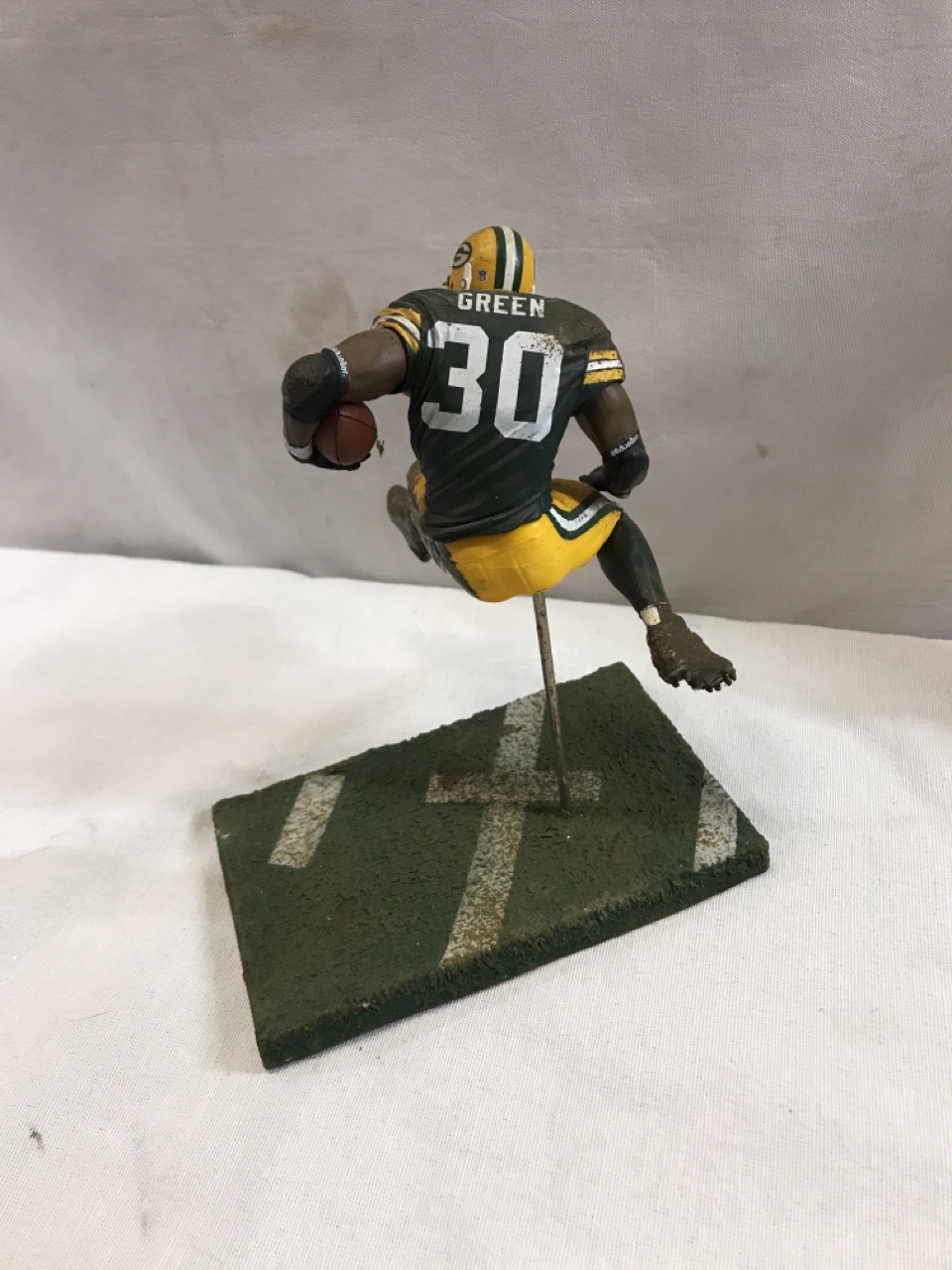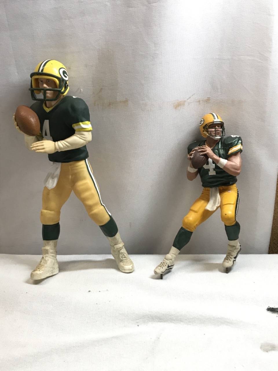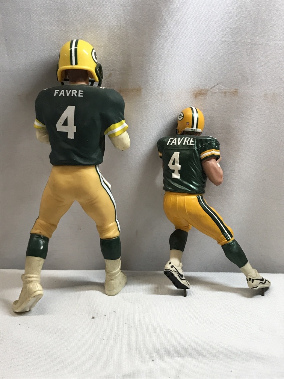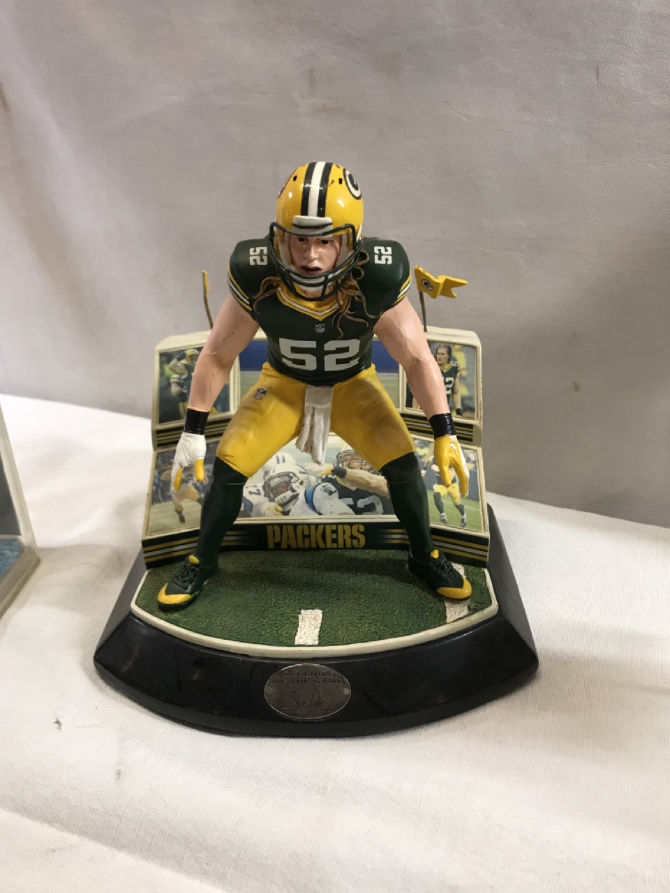 Vtg. Greenbay Packers Memorabilia including Legends of the Game Clay Matthews, 4 time Super Bowl Champions Glass Football, Wooden Football, Brett Farve Figures, Green Figure