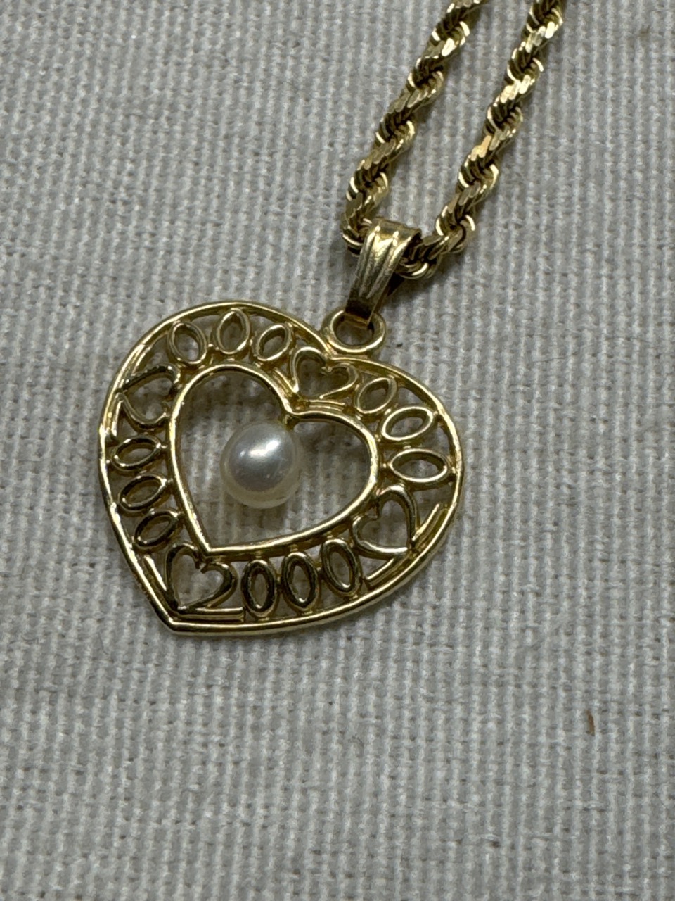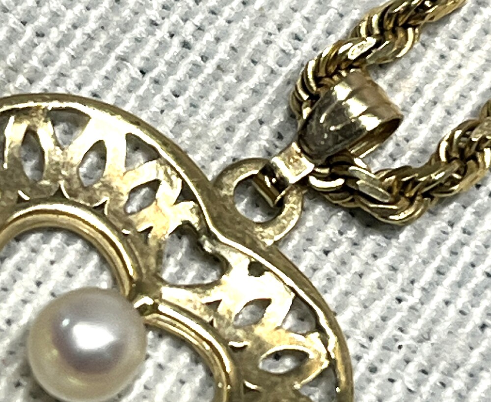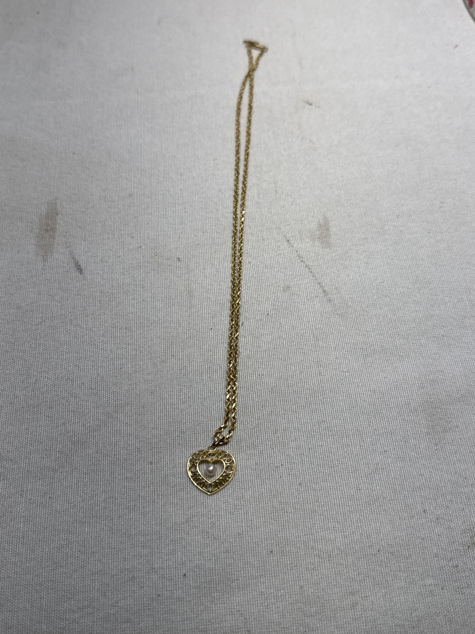 14Kt Gold with Pearl Heart Pendant Necklace - 18” 14kt Rope Chain - 7.6 Grams Total weight