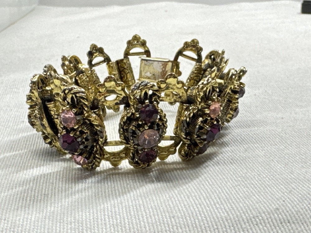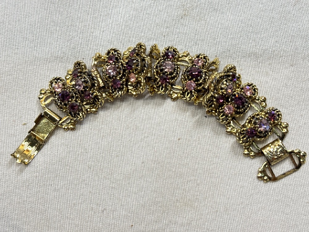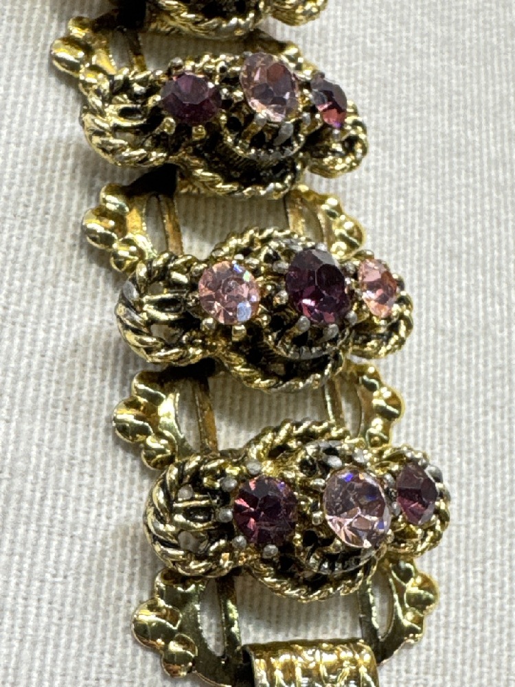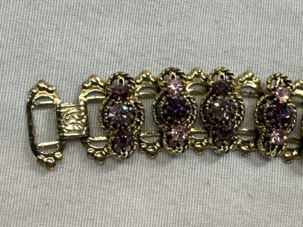 1940’s Vtg. Bookchain Bracelet Layered Amethyst/ Rhinestone - Baroque Links , Layered Amethyst Rhinestones- 6 1/2”