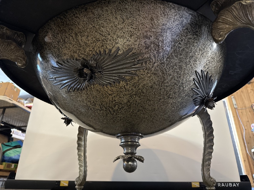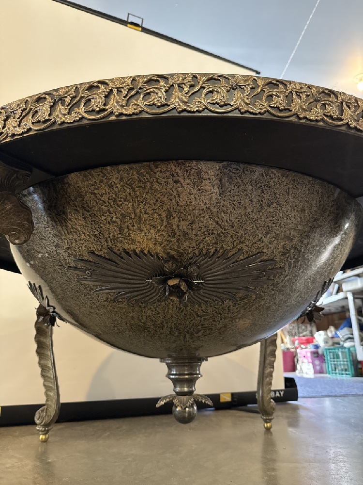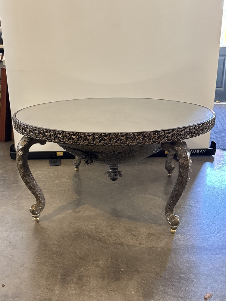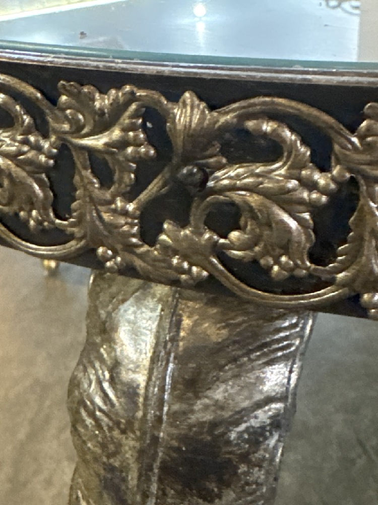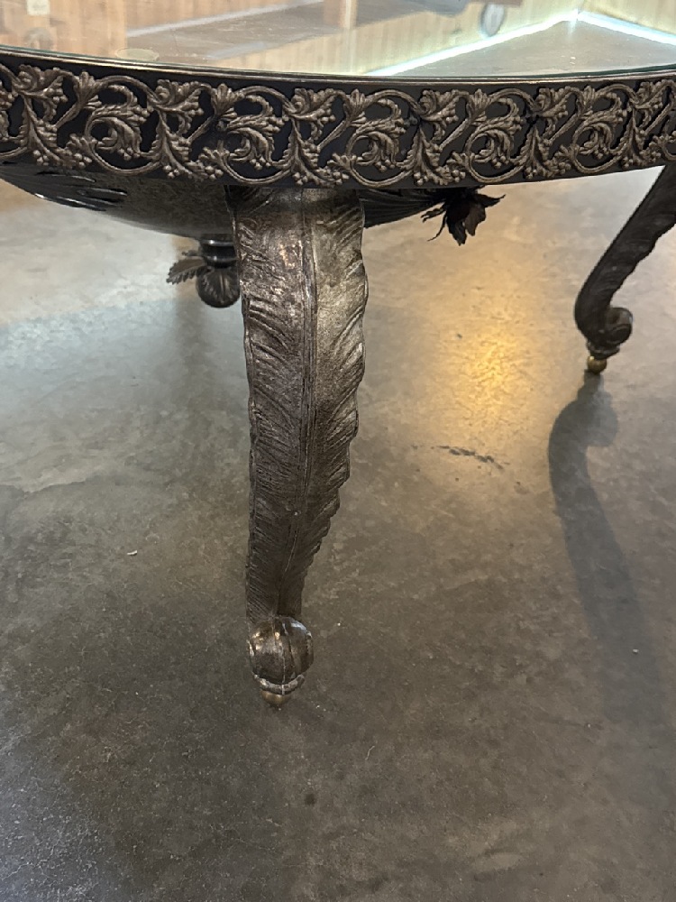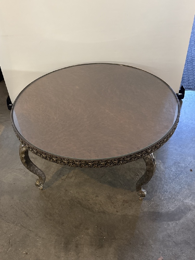 French Neoclassical Glass top/ Ornate Round Center Table - Brass Legs and Accent ~ 39” Round x 2” Tall