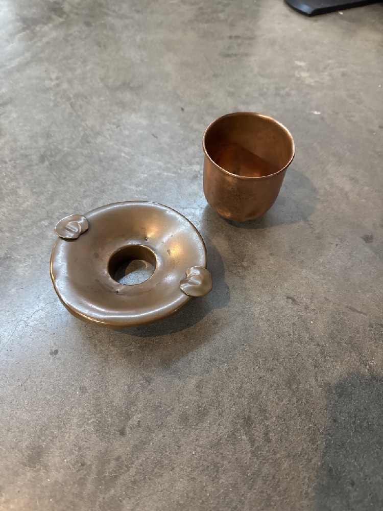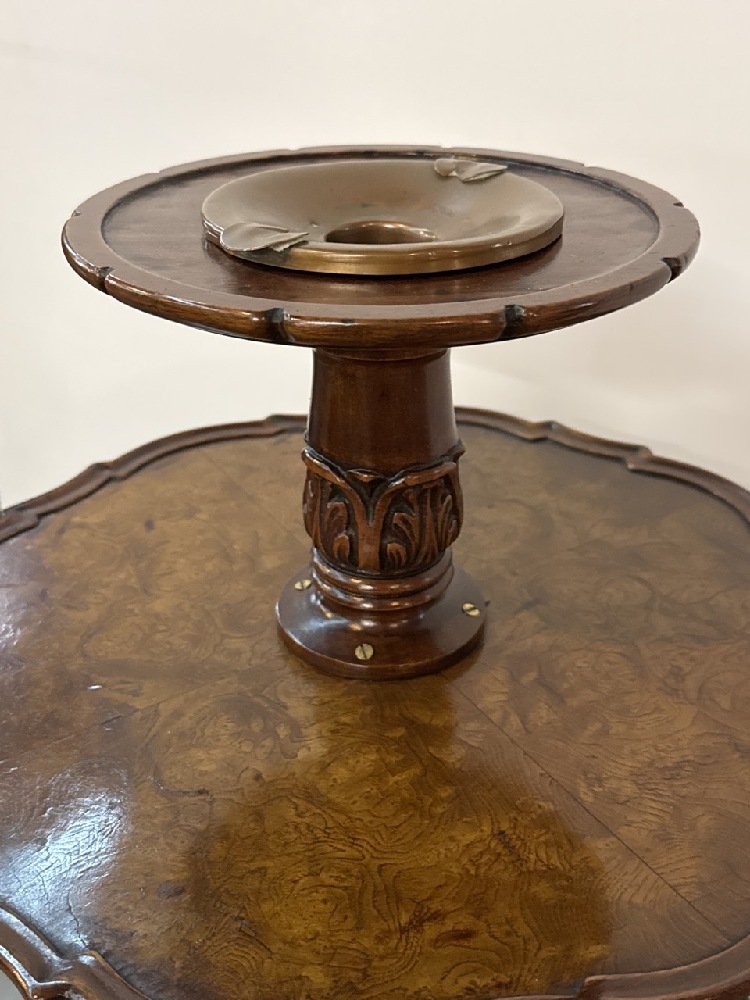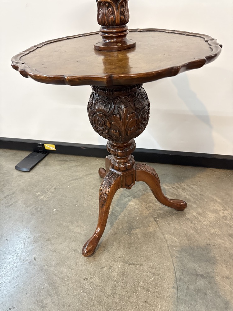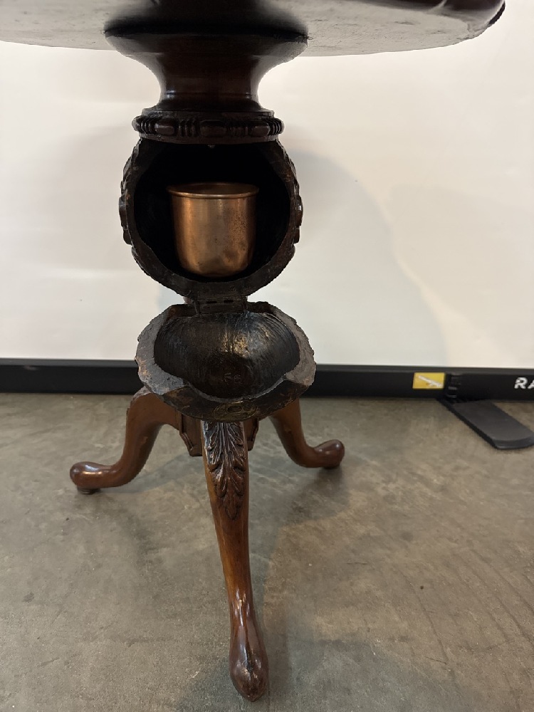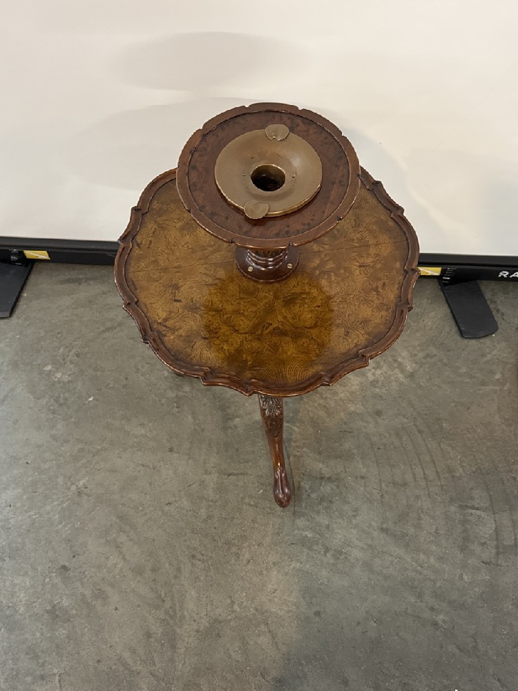 Vtg. Ash Tray 2 Tier Table - Pie Crust Style - Carved Wood , Copper Insert ~ 27” Tall