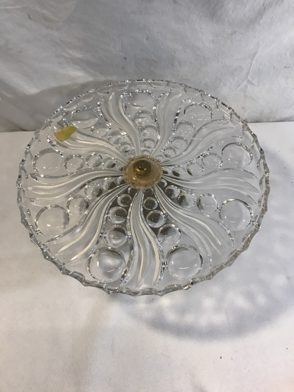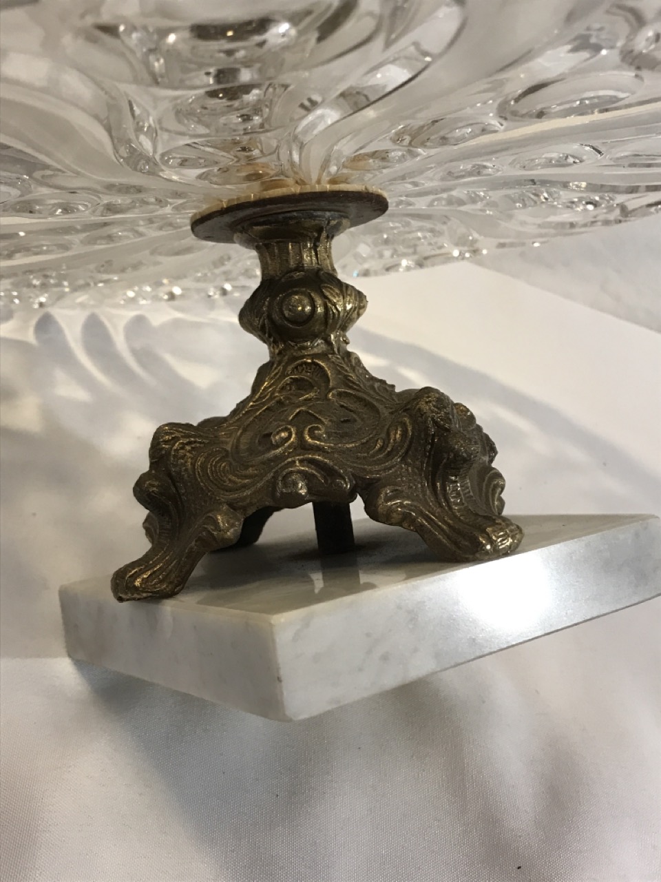 Vtg Ornate Lead Crystal,Metal Footed Marble Base Pedestal Cake Platter ~ 12” Round x 4 3/4” Tall