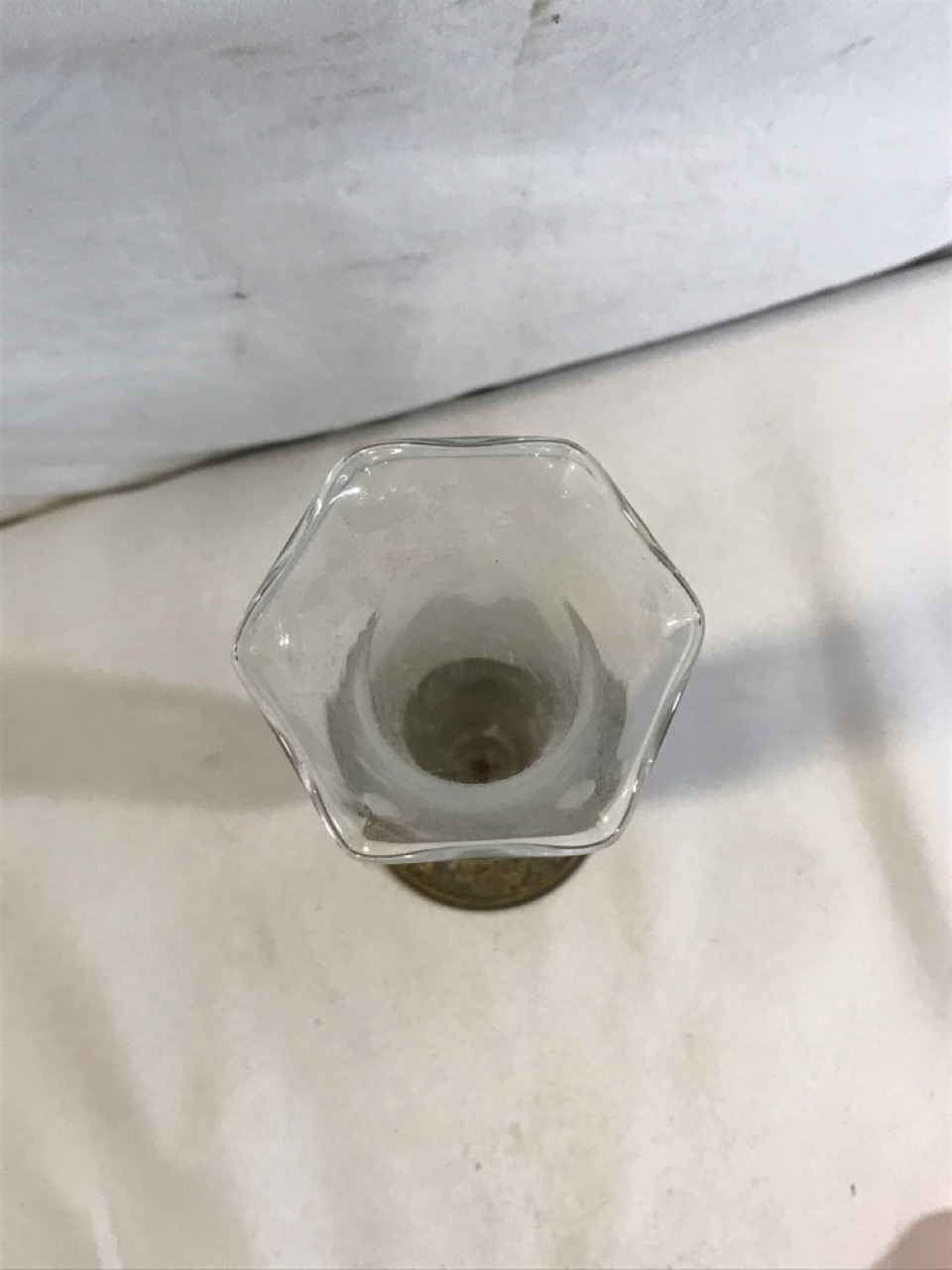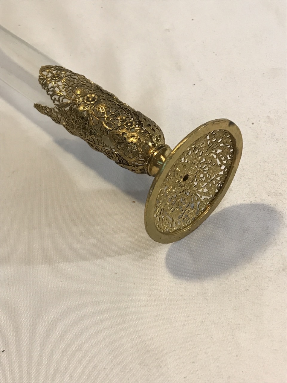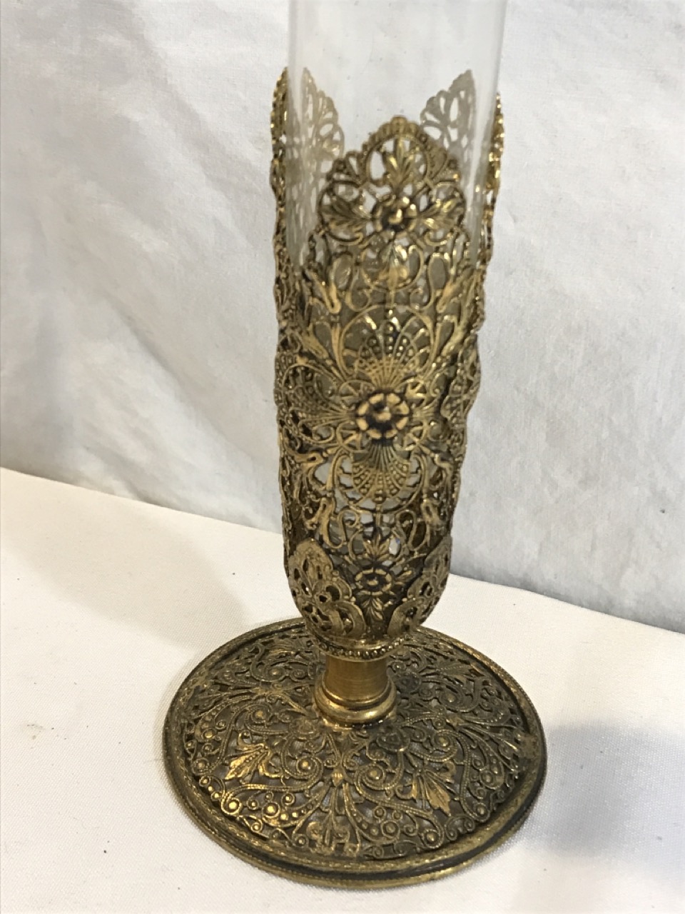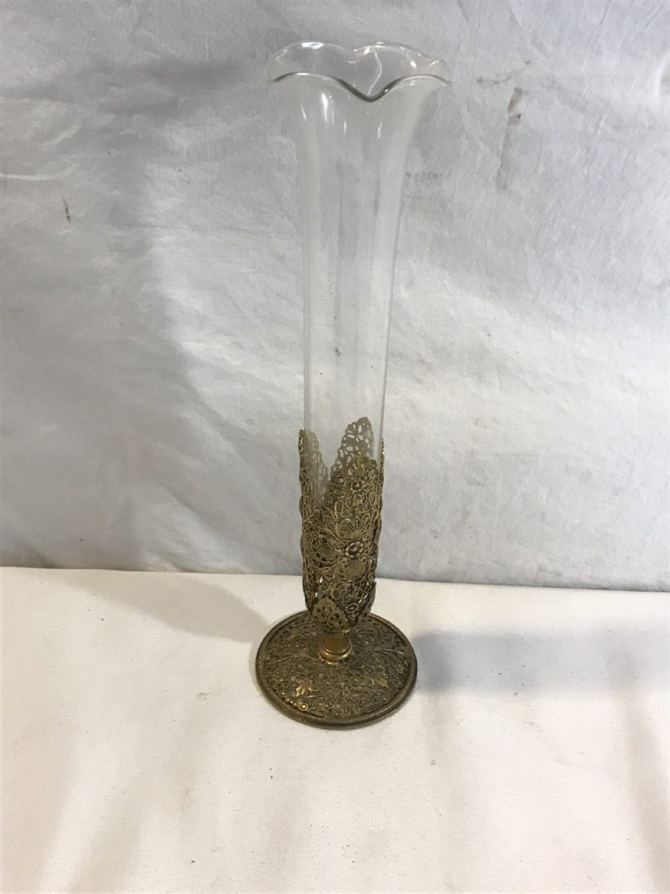 Antique Ormolu Glass Bud Vase with Floral Brass Stand- 11 1/2” Tall