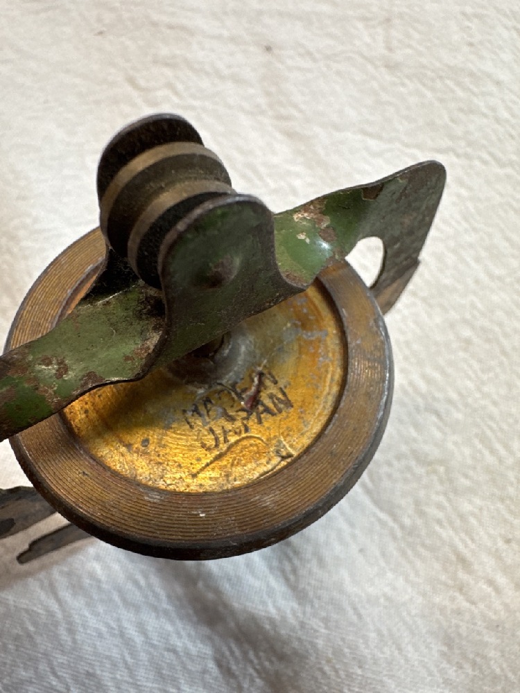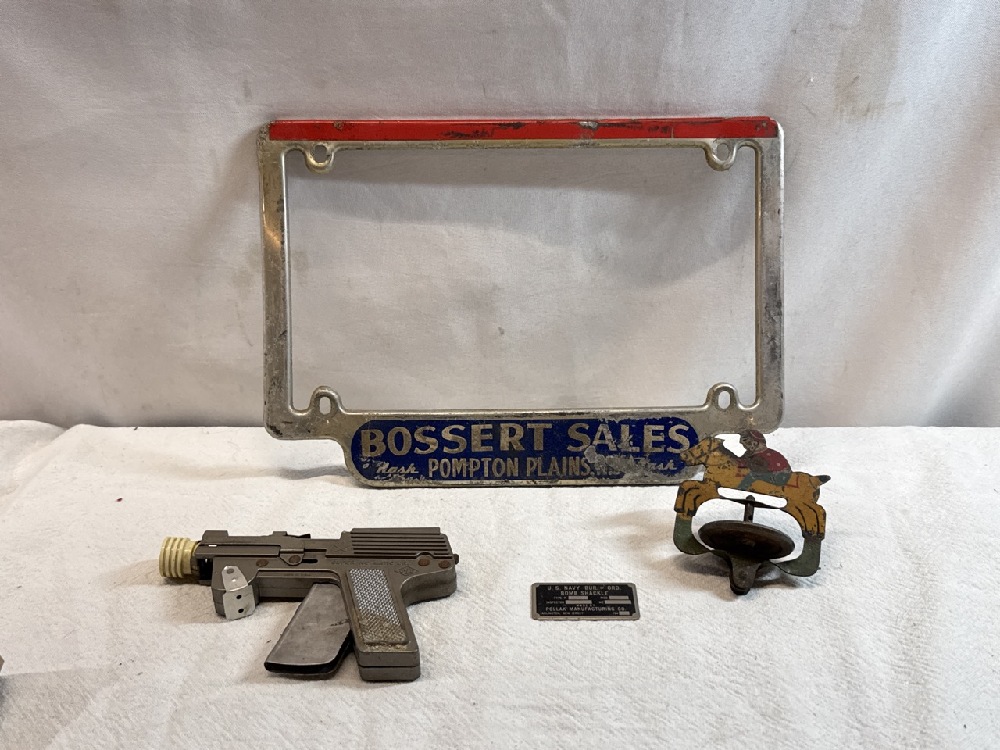 Tin Litho Wind-up Toy, Super Nu-Matic Jr Cap Gun, Us Navy Bomb Shackle WWII Name plate and Bossert Sales Lic. holder