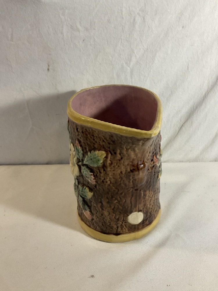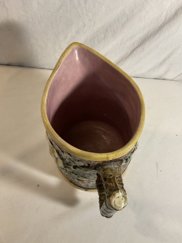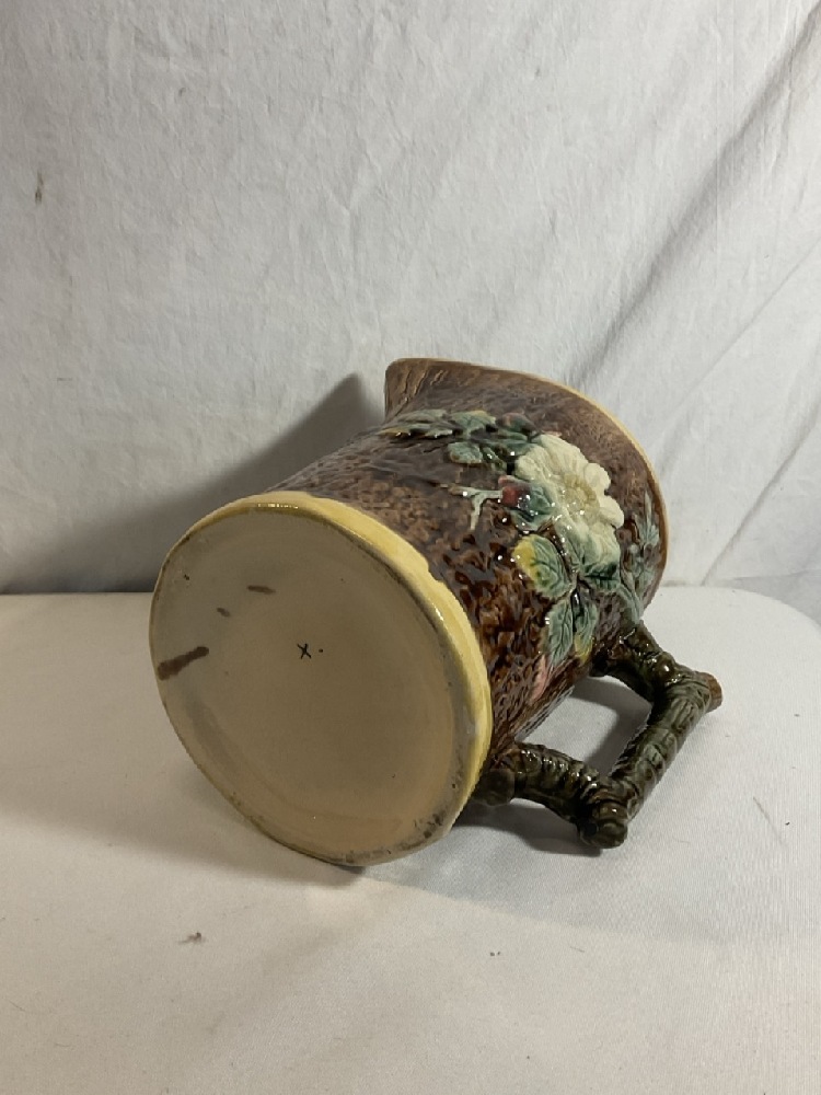 Majolica Pottery Pitcher “ Wild Rose on Tree Bark” - 8 1/4” Tall x