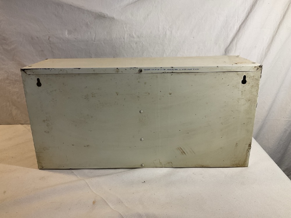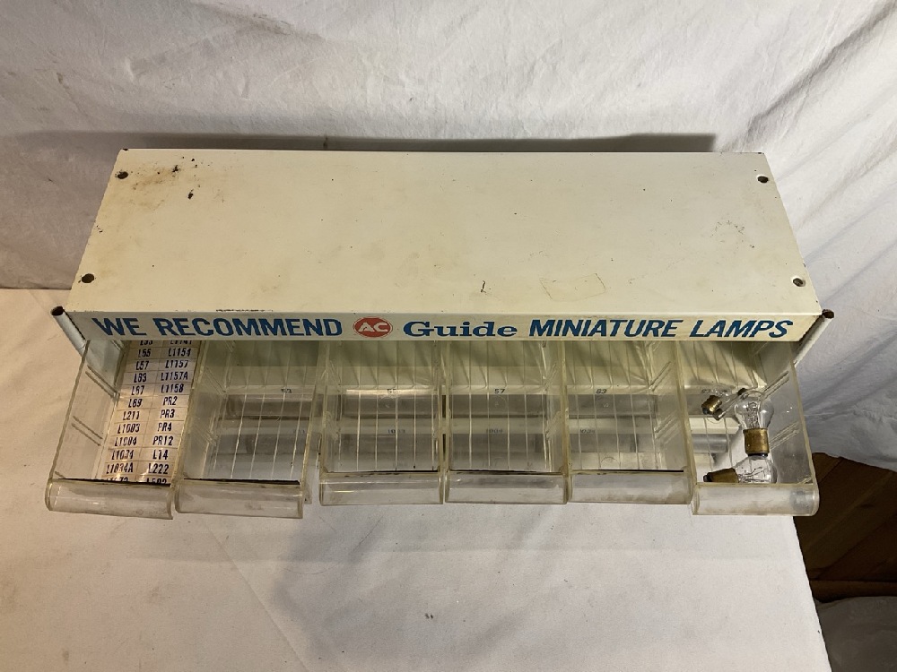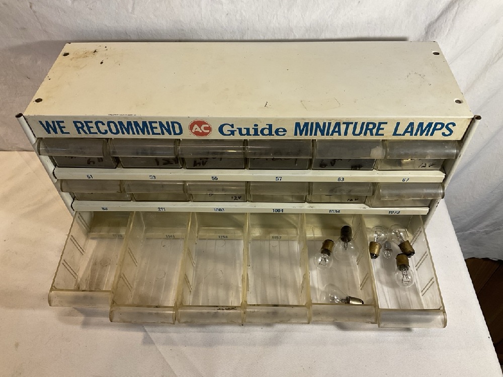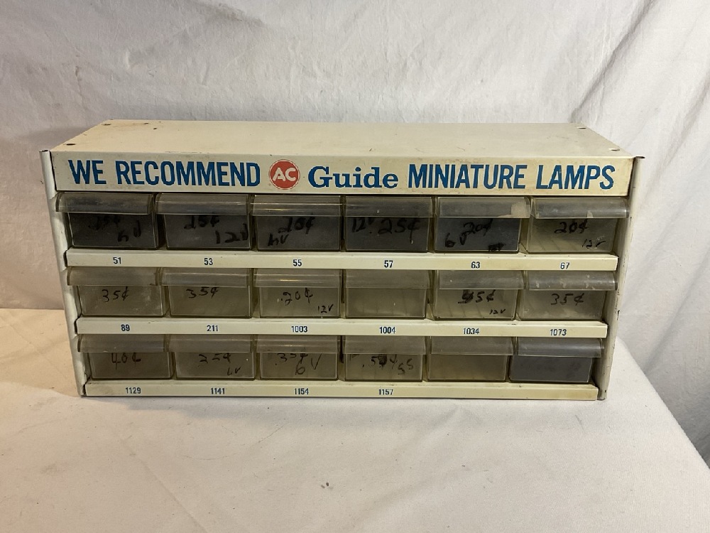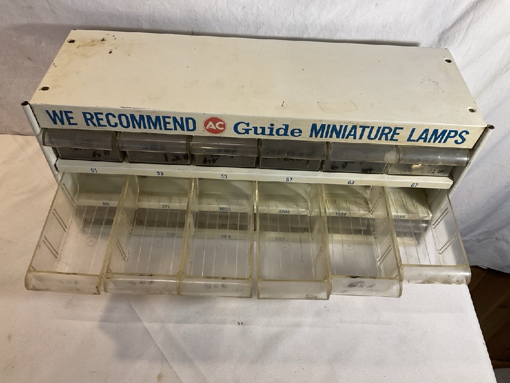 Vtg. AC Guide Miniature Lamp 18 Drawer Metal Display Cabinet- 19” Long x 6” Wide x 9” Tall
