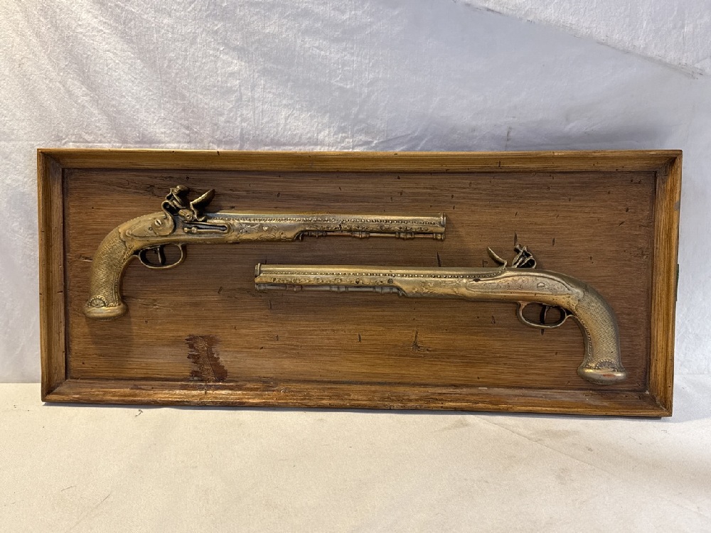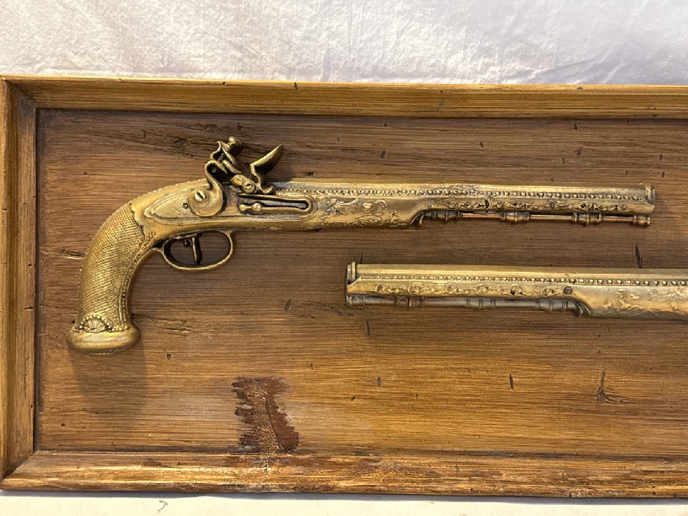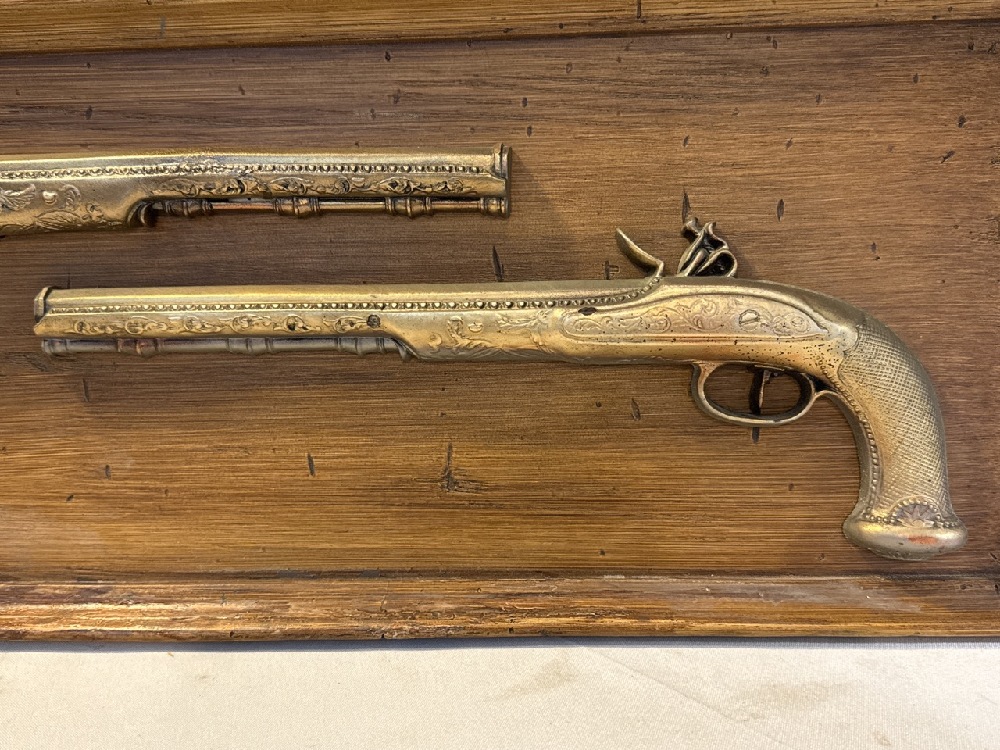 Vtg. Burn wood Products Co. USA Gold Derringer Guns Wooden Plaque Wall Hanging - 25” x 10”