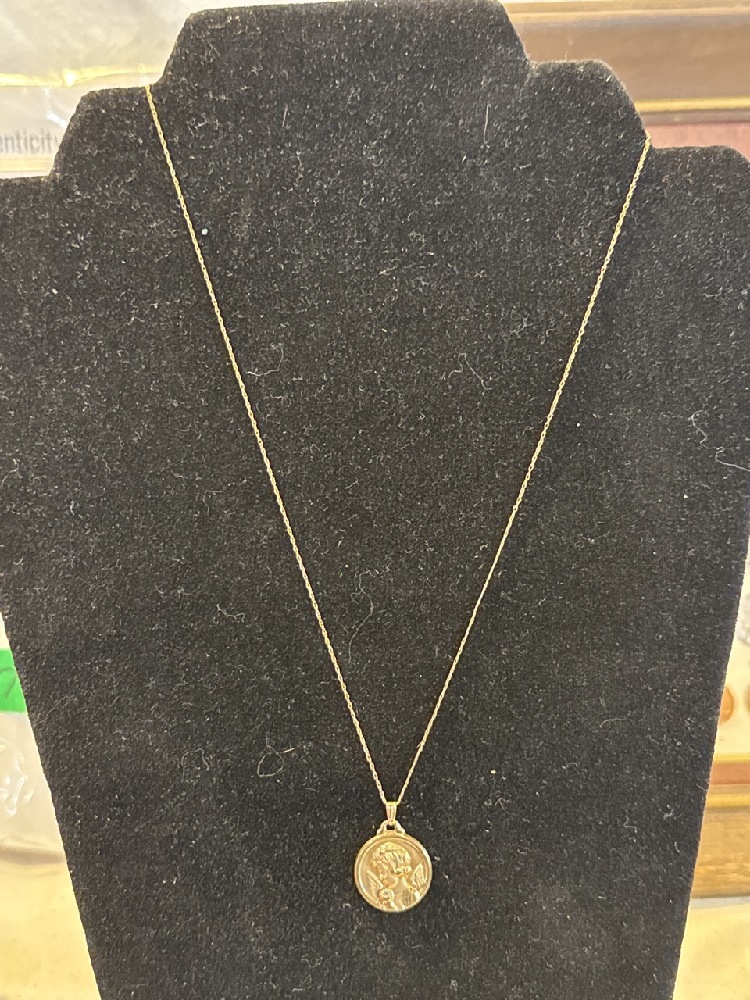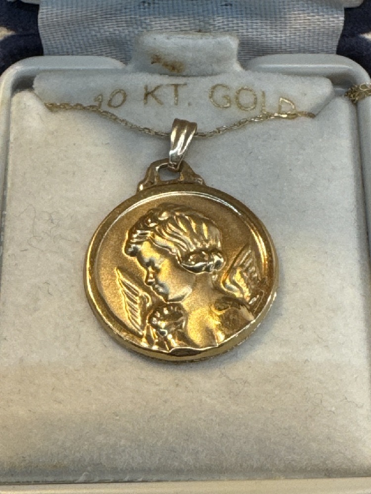10 Kt Guardian Angel/Cherub Coin Pendant Necklace - 1” Pendant ~ 18” Chain ~ 1.4 Grams