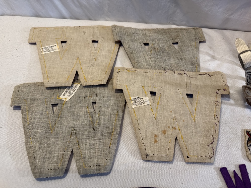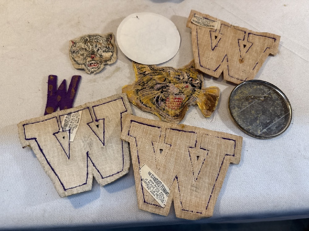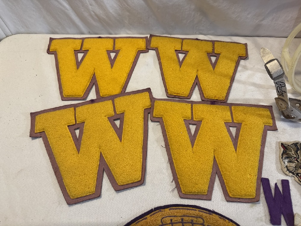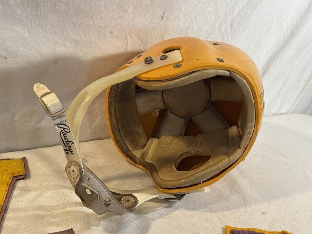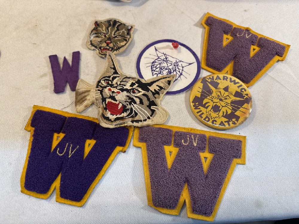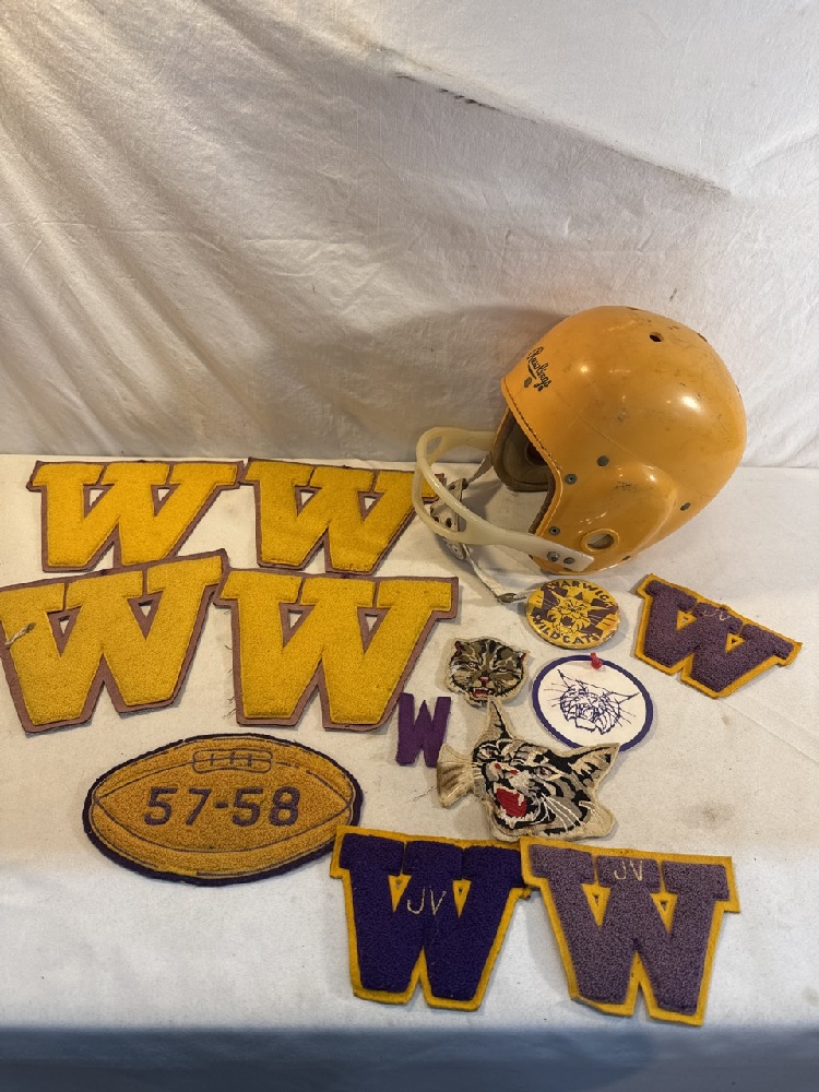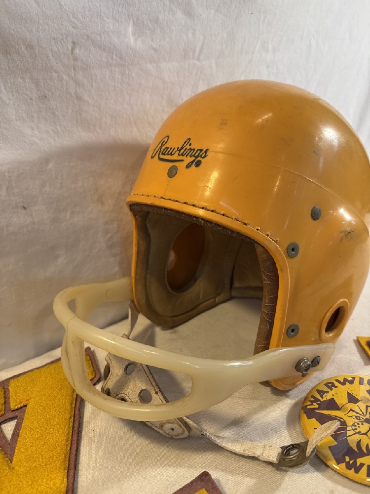Vtg. 50’s Rawlings football Helmet and Warwick Wildcats Memorabilia - varsity Letters, Patches and Pin