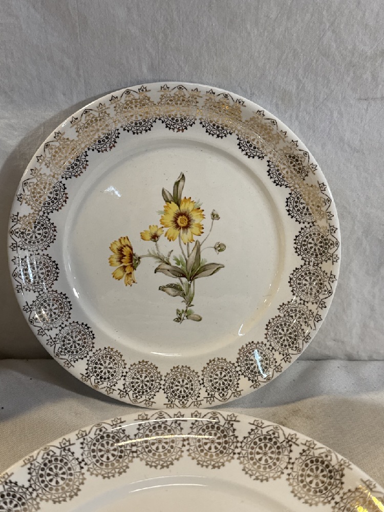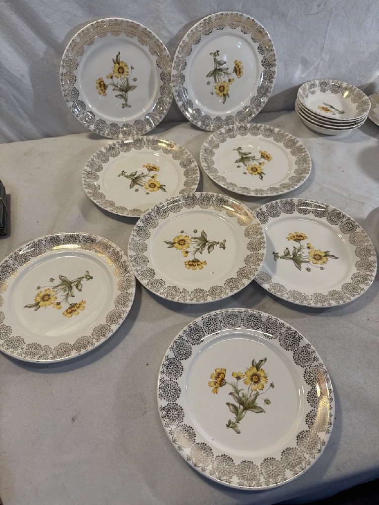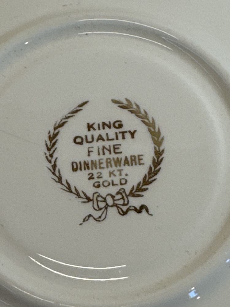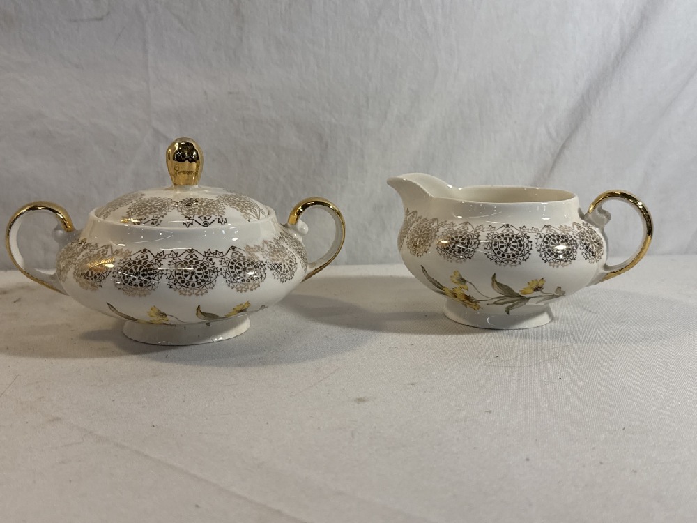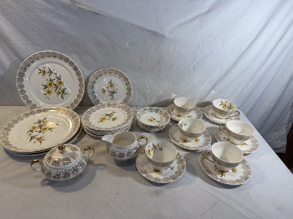King Quality Fine Dinnerware Set Featuring a Yellow Floral Design and 22kt Gold Overlay ~ 4 10 1/4” Plates, 8 7 1/2” Plates, 6 Tea cups/ Saucers, 5 5” Bowls and Sugar/Creamer (1 Teacup / Saucer has Chip; See photos)