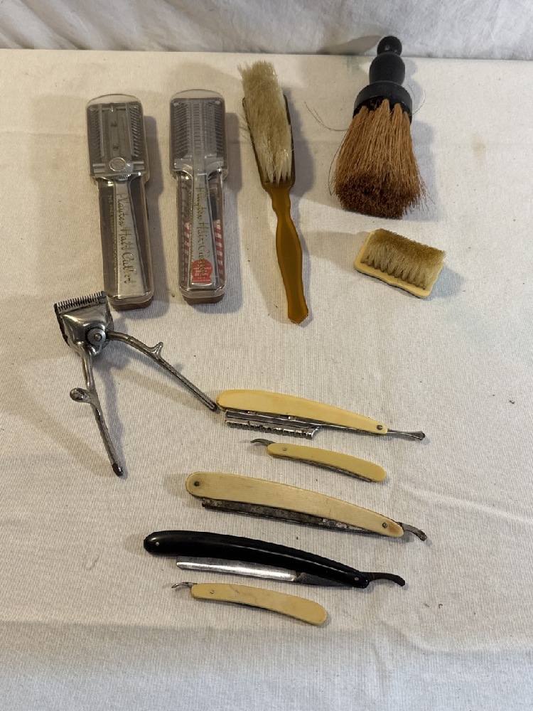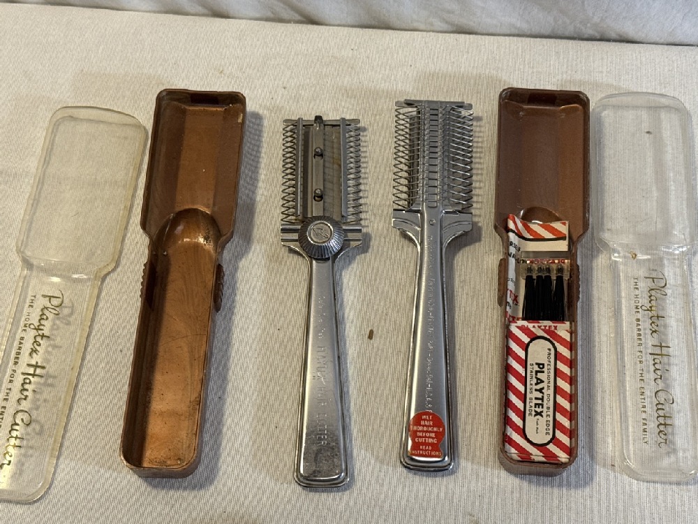 Vtg. Hair Cutting Tools - Playtex Hair cutter Clippers, Razors, Shave Brush, and Brushes with natural Bristles